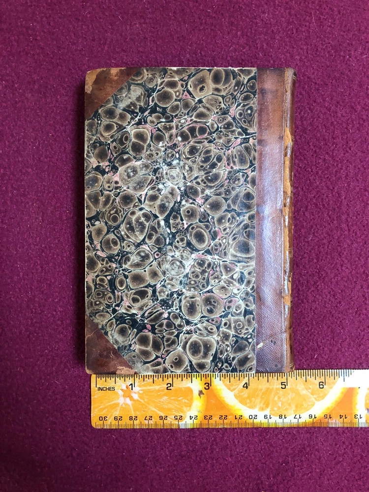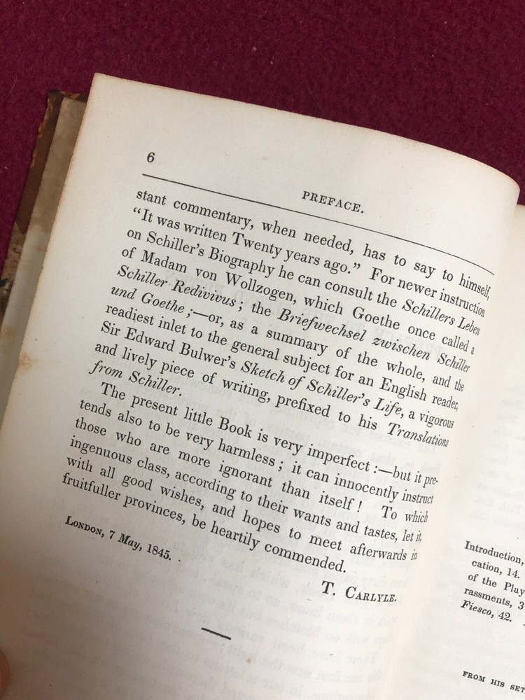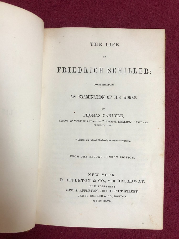 THE LIFE OF FRIEDRICH SCHILLER: COMPREHENDING AN EXAMINATION OF HIS WORKS . By Thomas Carlyle. “From the Second London Edition.” D. Appleton & Co., New York. 1846. 280 pages. Hardcover. Leather-covered spine and corners. CONDITION NOTES: Very good antique hardcover. Leather is somewhat distressed. Bumped corners. Substantial foxing on inside covers and facing page. Price penned on inside front cover and also on facing page. Otherwise, except for occasional foxing, the book is clean inside. Binding is tight. Please check the included images for more details on contents and condition. This item comes from a private collection in a smoke-free home. Sold AS IS. SKU:136PM