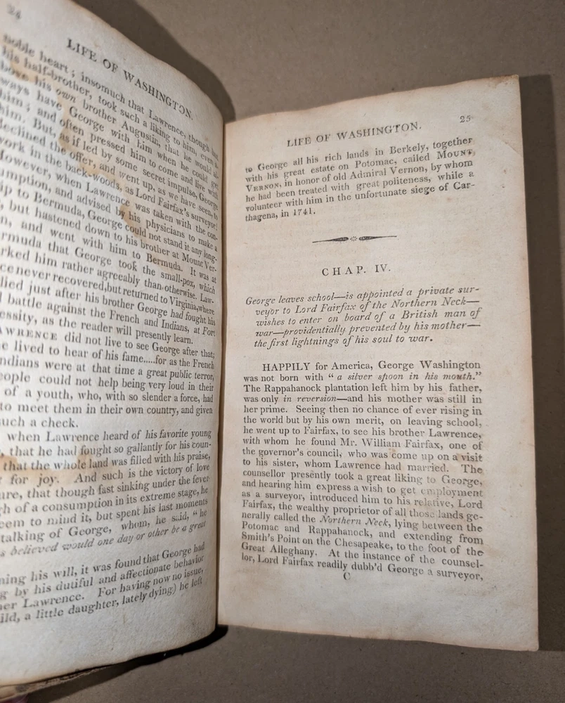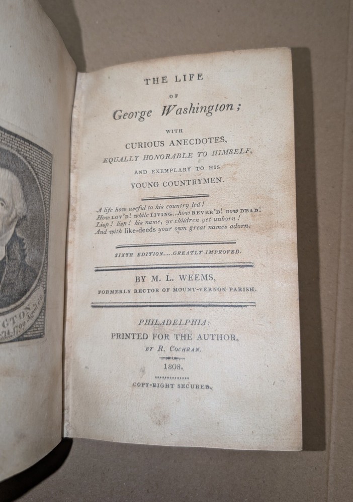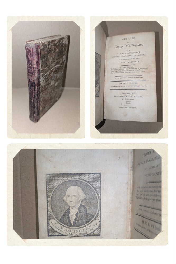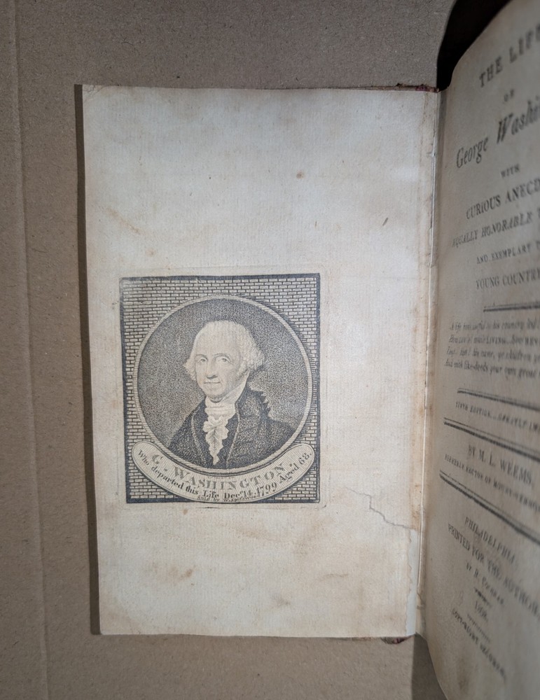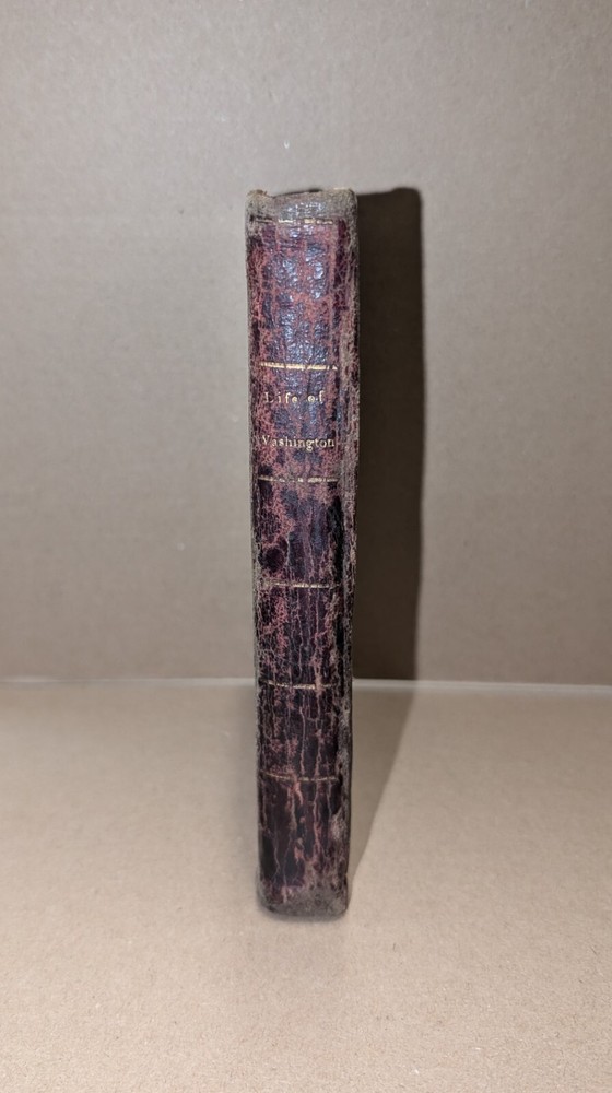 The Life of George Washington; with Curious Anecdotes, Equally Honorale to Himself, and Exemplary to his Young Countrymen, by M. L. Weems. Sixth edition, greatly improved. Philadelphia: Printed for the Author by R. Cochran, 1808. Contemporary quarter leather over paper-covered boards. 228 pp. Frontispiece portrait of Washington. Housed in a later custom clamshell box. Boards heavily worn and pitted, although some hints of marbled paper remain. Spine leather cracked and worn. Contemporary ownership signature to front pastedown and front free endpaper. The front free endpaper, frontispiece, title page, and pp. 11/12 all have some tears or chips and have had professional paper conservation done (with something like Japanese repair tissue). Dampstaining visible to varying degrees throughout, with some foxing. Rear endpaper with some old pencil arithmetic. Shipped free in the US via Media Mail, at cost outside the US via eBay's International Shipping. Please contact me with questions.