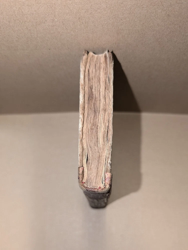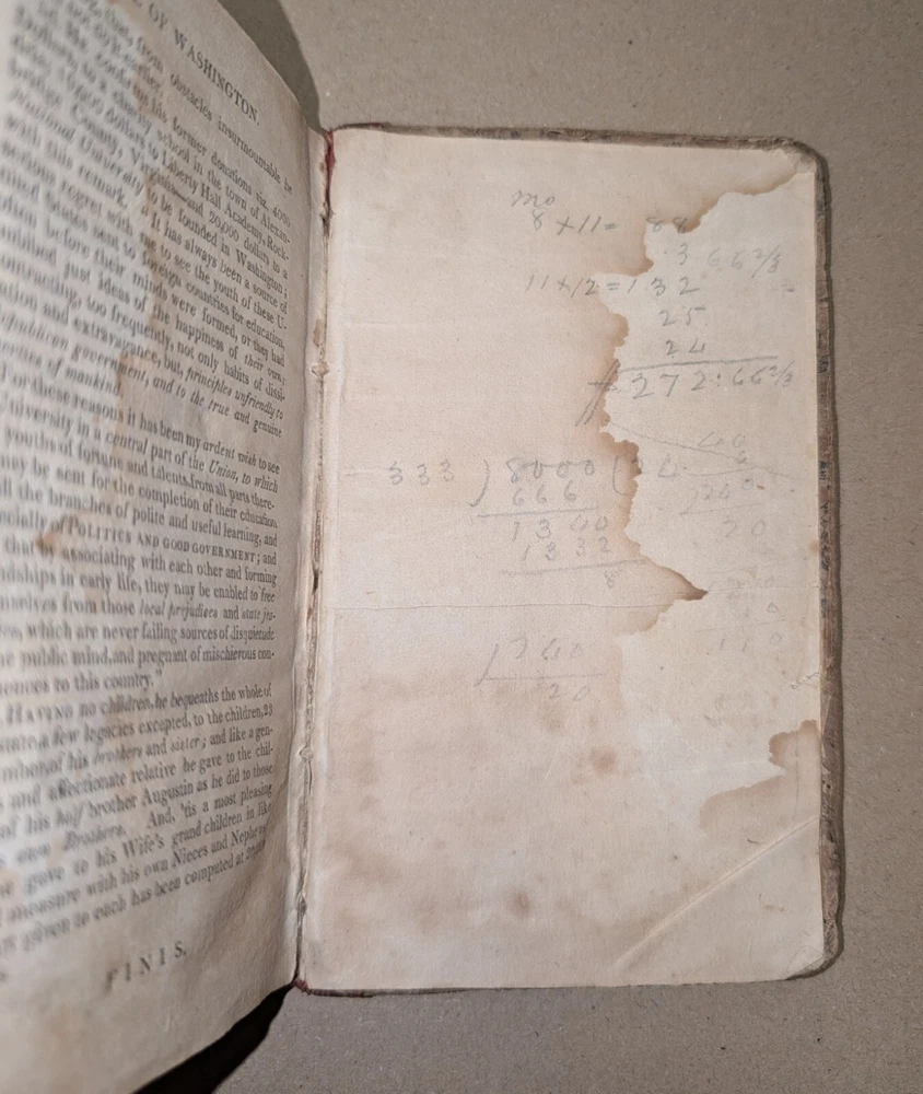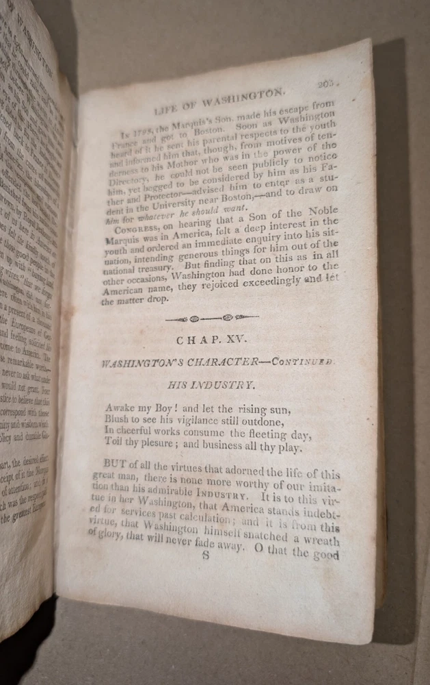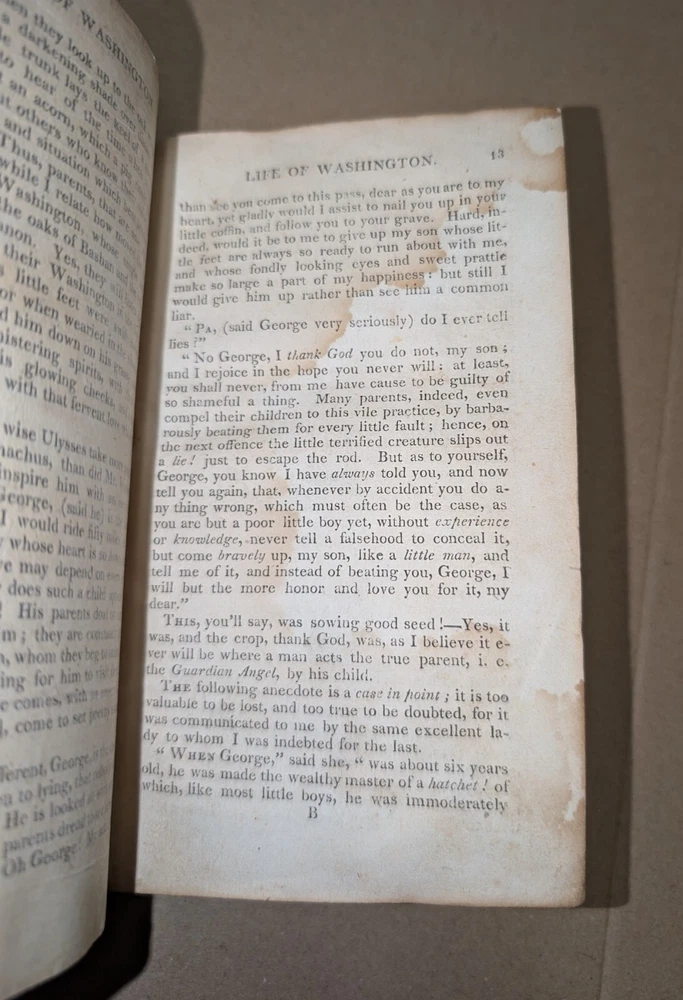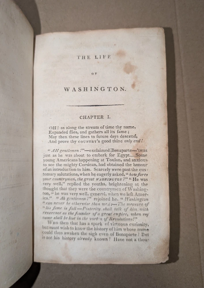 The Life of George Washington; with Curious Anecdotes, Equally Honorale to Himself, and Exemplary to his Young Countrymen, by M. L. Weems. Sixth edition, greatly improved. Philadelphia: Printed for the Author by R. Cochran, 1808. Contemporary quarter leather over paper-covered boards. 228 pp. Frontispiece portrait of Washington. Housed in a later custom clamshell box. Boards heavily worn and pitted, although some hints of marbled paper remain. Spine leather cracked and worn. Contemporary ownership signature to front pastedown and front free endpaper. The front free endpaper, frontispiece, title page, and pp. 11/12 all have some tears or chips and have had professional paper conservation done (with something like Japanese repair tissue). Dampstaining visible to varying degrees throughout, with some foxing. Rear endpaper with some old pencil arithmetic. Shipped free in the US via Media Mail, at cost outside the US via eBay's International Shipping. Please contact me with questions.