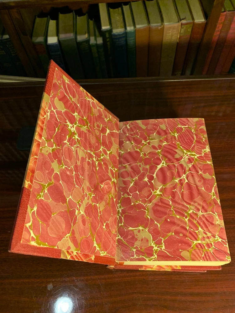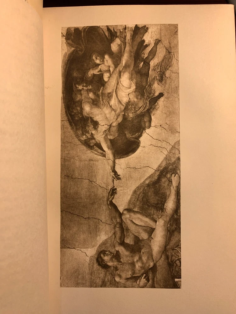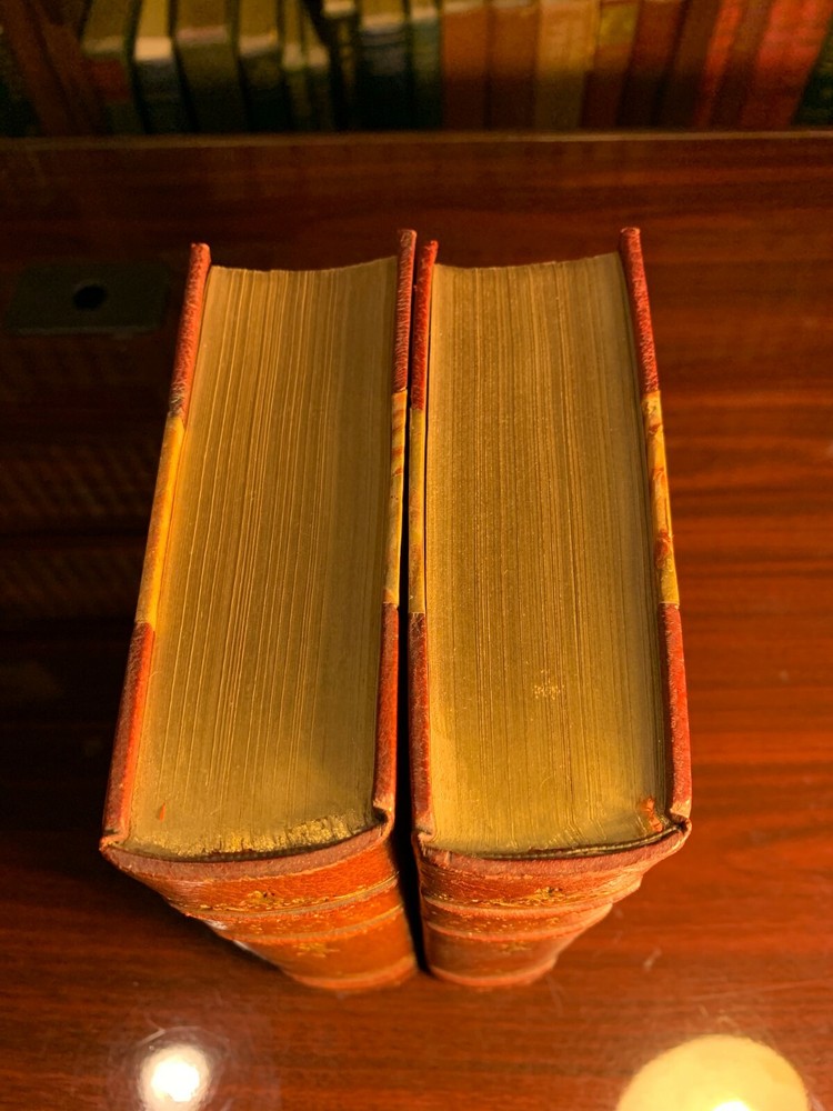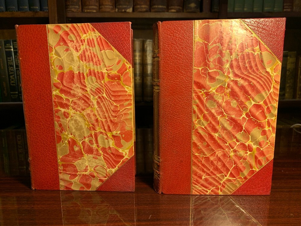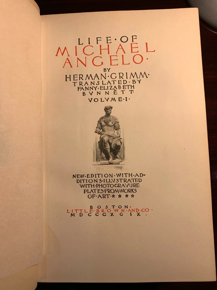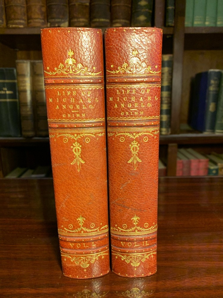 LIFE OF MICHAEL ANGELO NEW EDITION WITH ADDITIONS; ILLUSTRATED WITH PHOTOGRAVURE PLATES FROM WORKS OF ART (2 VOLUMES) Hardcover Publisher: Little, Brown and Co, Boston, 1899 Maroon Three Quarter Bound Leather bindings, with elaborate gilt decorations; titled in gilt; Marbled End Papers; TEG; 8vo. There are no marks in the books, clean pages, no foxing; title pages printed in red and black. The plates are protected with printed tissue guards, all of which are present. Very tightly bound, seems like never read. A lovely set. Very Good+.