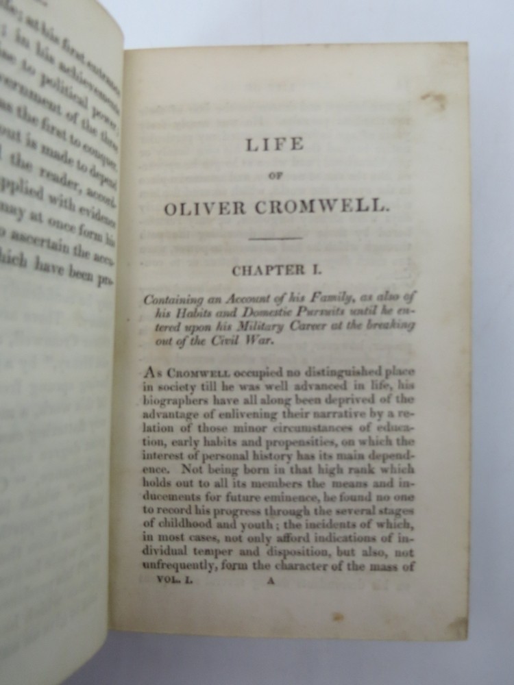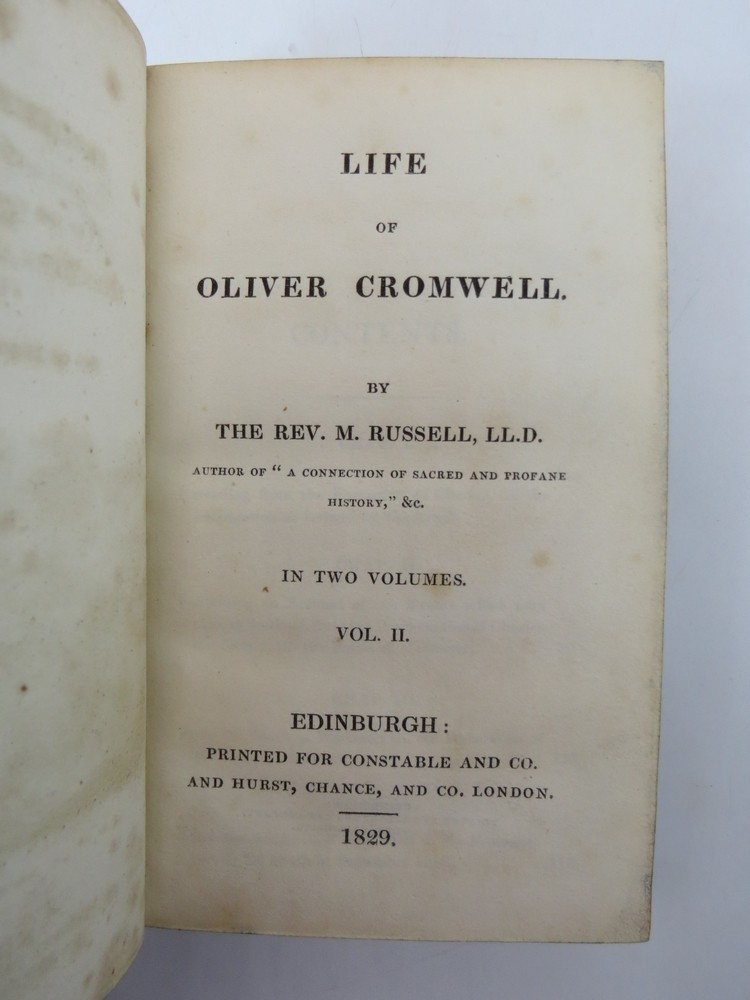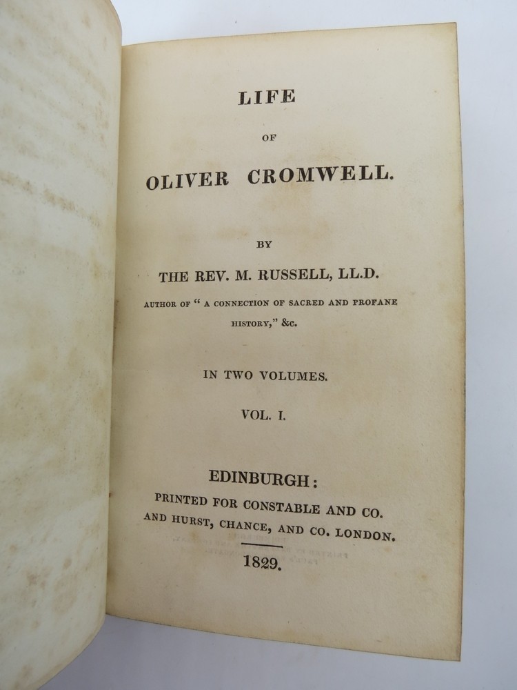 LIFE OF OLIVER CROMWELL (2 VOLUMES, LEATHER BOUND) Author: by Rev. M. Russell Cover: Hardcover Publisher: Printed for Constable and Co. Edinburgh Date: 1829 Book: G+ Complete 2 volume set. Half tan leather bound covers with orange cloth boards have wear to the leather but clean and in good+ condition. Boards and spines are straight. Bindings are tight. Marbled page edges clean and bright. Blue marbled end sheets and paste downs clean and glossy. Copper engraved frontispiece in volume 1 and engraved half title pages in both volumes. Pages are clean and pristine. Front matter heavily foxed. Text modest sparse foxing and thumbing but overall quite clean and very good. Handy size 6" x 3.75".. Sage Rare & Collectible Books specializes in first editions, signed editions, fine bindings, antiquarian, vintage, out-of-print, and rare books. We provide a complete and detailed condition description of each book so you know precisely what you are ordering.