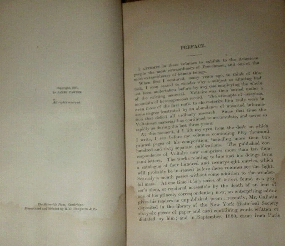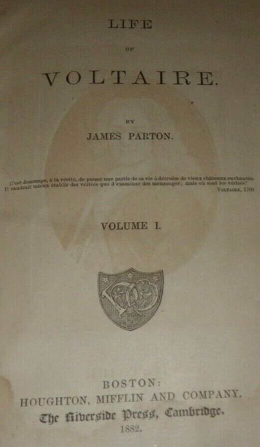 THE LIFE OF VOLTAIRE By JAMES PARTON 1882 VOLUME I HALF CALF LEATHER BINDING BOSTON HOUGHTON, MIFFLIN AND COMPANY THE RIVERSIDE PRESS CAMBRIDGE Parton was a popular biographer in his day, noted for his novelistic style; he also wrote lives of Franklin, Jefferson, Jackson, Greeley, & Burr. FINE LEATHER BINDING IS TIGHT. SPINE LETTERING & SOME OLD STAINING ISSUES. PRICED TO SELL FAST.