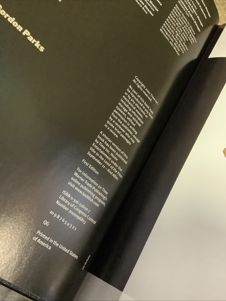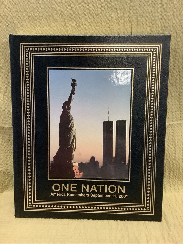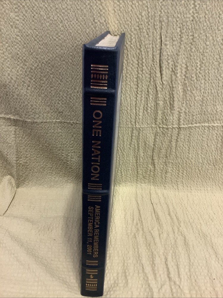This hardcover book, titled "One Nation, America Remembers September 11, 2001," is a collector's edition published by Time Warner Trade Publishing. The book is leather-bound and contains 193 pages of nonfiction narrative, featuring the history of September 11th. The book is intended for adult readers and is written in English. It measures 11 inches in length and 9.25 inches in width.
