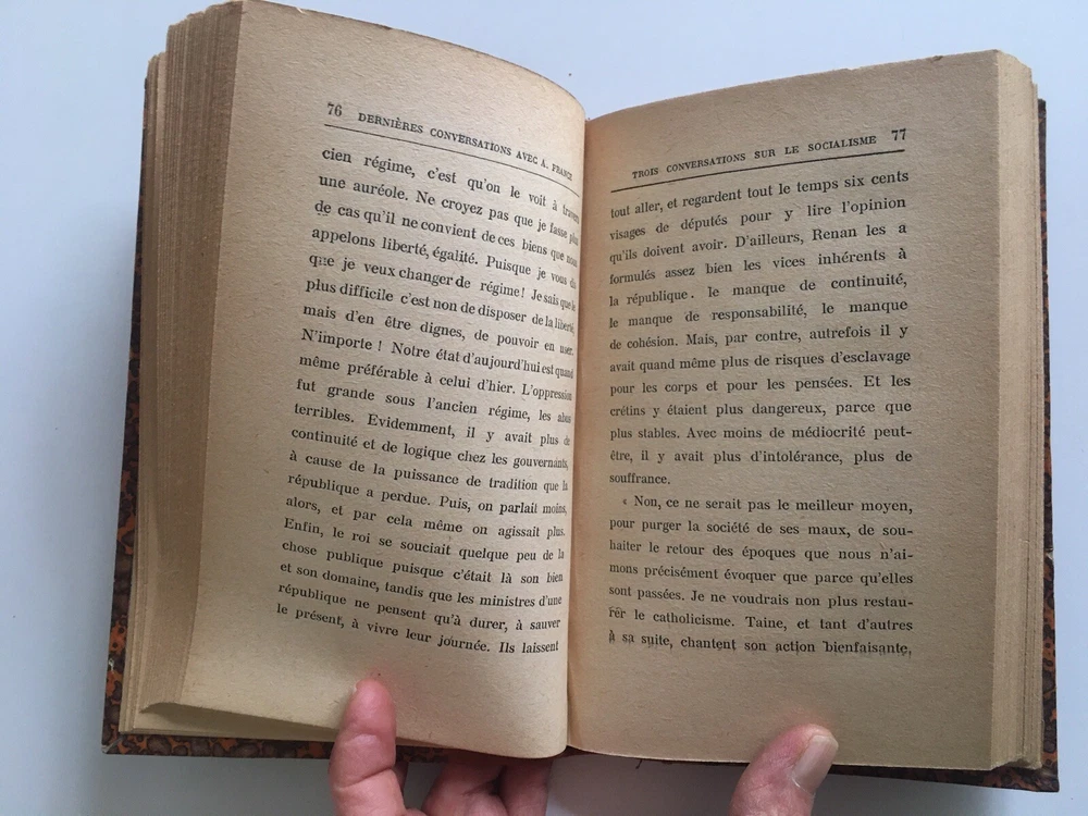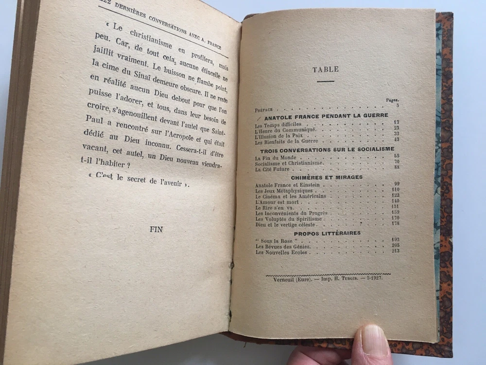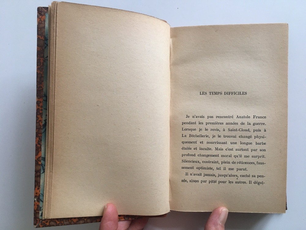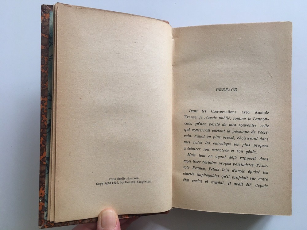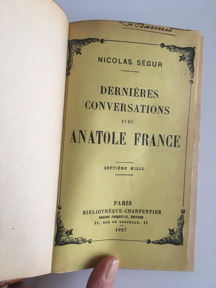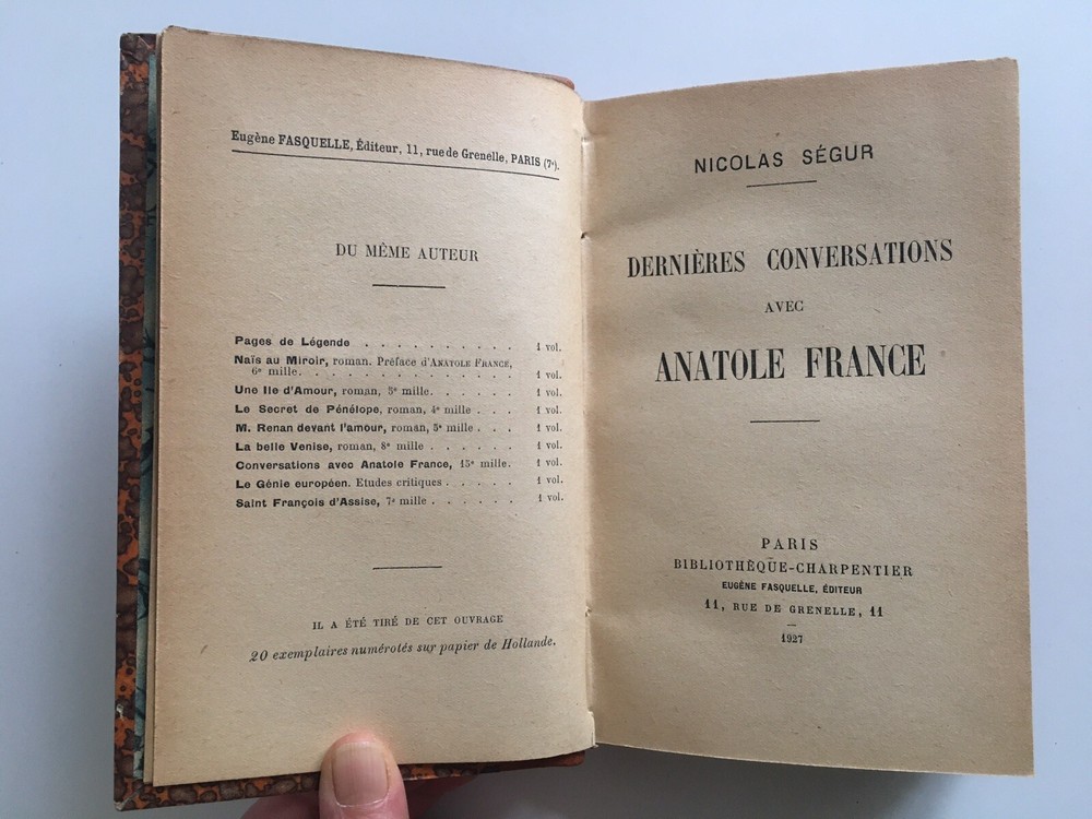 Latest conversations with Anatole France by Nicolas Ségur. Paris, Charpentier Library, Eugène Fasquelle Publisher, 1927. Preserved original coverage. 7th thousand. Leather back binding, hit, 18.5 x 11.5 cm. 222 pp. In very good condition: minor scratch on the leather, solid together, good hold; slightly brown. Latest conversations with Anatole France by Nicolas Ségur. Paris, Charpentier Library, Eugène Fasquelle Publisher, 1927. Preserved original coverage. 7th thousand. Leather back binding, hit, 18.5 x 11.5 cm. 222 pp. In very good condition: minor scratch on the leather, solid together, good hold; slightly brown.