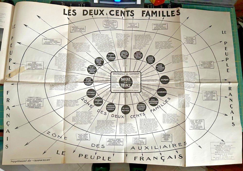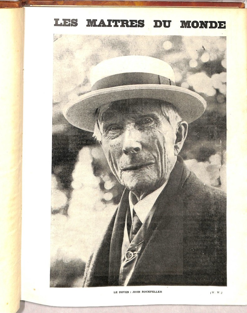 Le Crapouillot (4 Numero Special Issues: Mars 1932, Mars 1933, Mars 1936 and Juillet 1936). Paris: Office de Livres du Crapouillot. Quarto (12" x 9.5"). In French . Hardcover (leather spine and tips/marbled boards). Black & white illustrations, ads. Four special issues of monthly French magazine bound together. Includes Les Maitres du Monde (Mars 1932), Les Morts Mysterieuses (Mars 1933), Les Deux Cent Familles (Mars 1936, includes large foldout chart with minor tape repairs), and Histoire de la Police Secrets (Juillet 1936). Good condition, each issue missing cover and introductory pages. 06/24