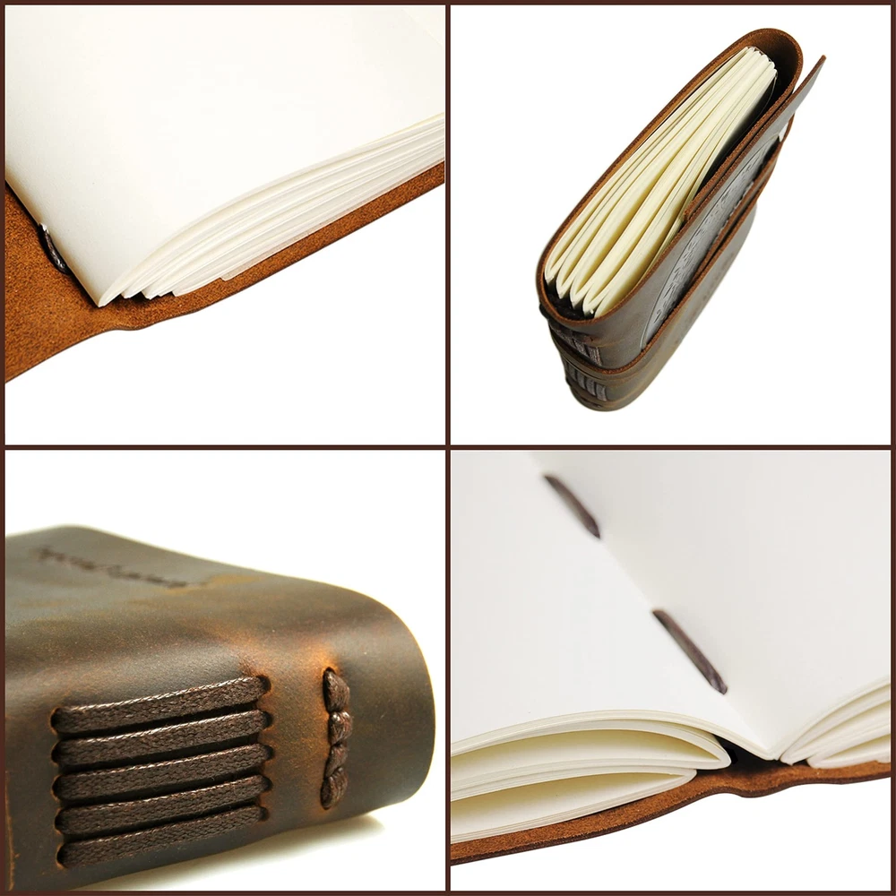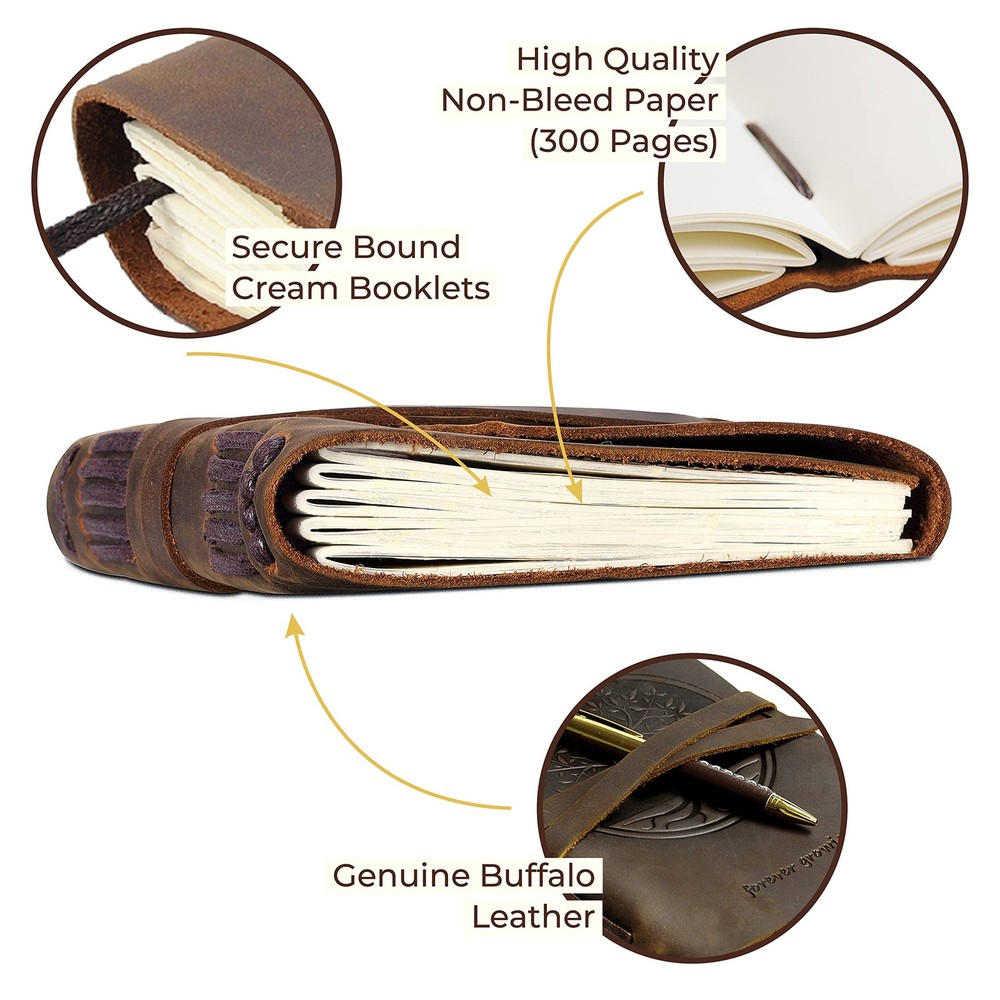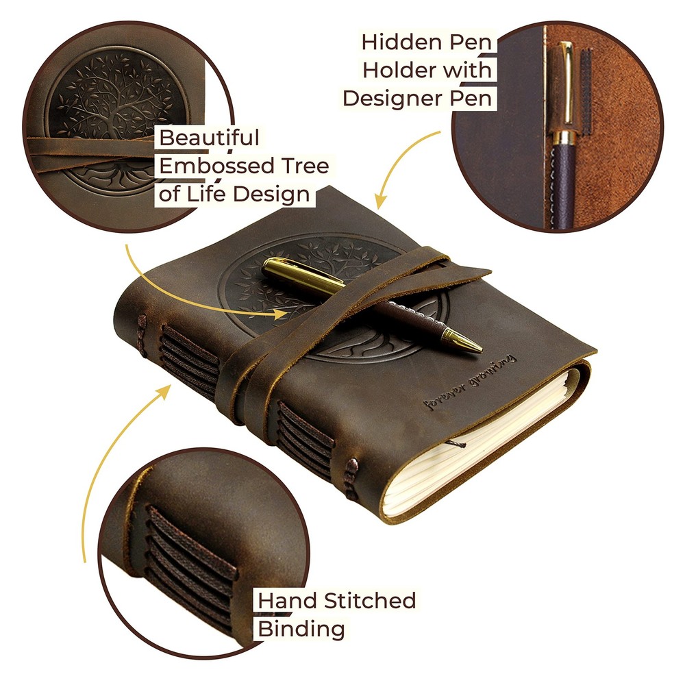 UNIQUE GIFT SET: Handmade leather journal with beautiful Tree of Life embossed front soft cover with matching bookmark, designer pen and hidden pen holder. Presented in an eco-friendly recycled box. A timeless gift for that special someone who loves to write. PREMIUM LEATHER: Crafted with delicate yet super tough buffalo leather, including a long strap that secures the journal firmly. Our genuine leather is thicker than competitors and offers lifetime durability with lasting softness. RUSTIC DESIGN: Achieves a unique and distressed look when scratched and features decorative stitching for added charm. Coated with special natural oils that make handling a joy. Plus, it has a wonderful authentic leather smell that inspires you to write daily. QUALITY CREAM PAPER: 300 premium unlined multipurpose sheets for notes, daily plans, sketches, inspiring ideas, memories and more. Zero bleed through with fountain pens. Not refillable. PERFECT SIZE: Designed with a choice of two sizes - 7x5" or 8x6" to suit a wide range of writing styles. We also offer many other sizes and styles of journals, including refillable journals. There's something for everyone!
