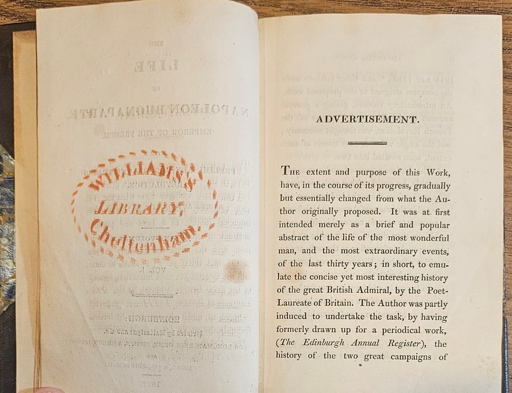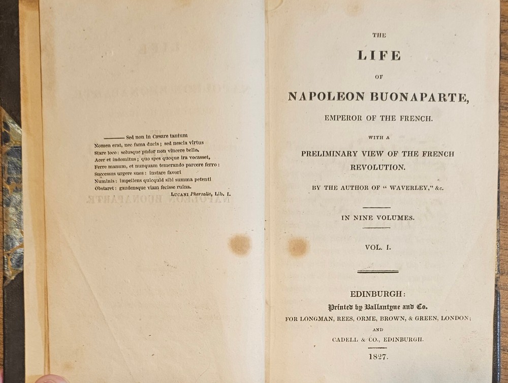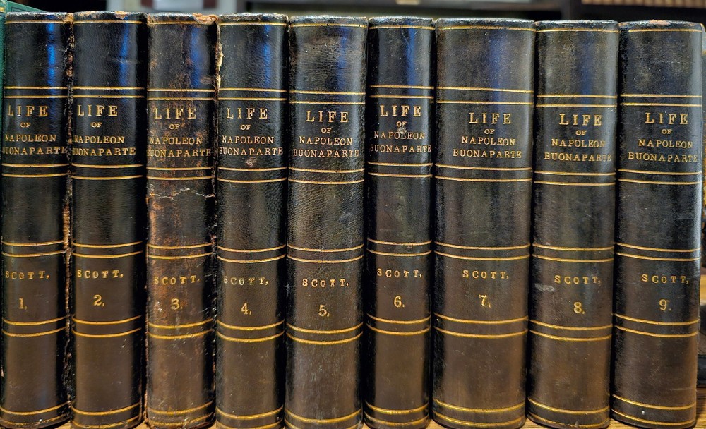 Scott, Sir Walter, THE LIFE OF NAPOLEON BUONAPARTE EMPEROR OF THE FRENCH. Edinburgh: Longman, Rees, Orme, Brown, and Green, 1827. 9vols. complete, 2nd ed., ½ leather hardcovers w/gilt titling and ornamentation to spine, 8vo (7.250x 4.625”), 9vols. approx. 4,500 pp. Contemporary ex-lib, per evidence of ink stamp, sporadic light chipping to external edges of binding, corners lightly bumped and rubbed, vols. 1 and 3 hinges started, w/vol. 3 showing signs of having the lower leather of the spine reattached with a large horizontal crack across spine, text block edges dust soiled, light staining occasionally through all volumes with the predominance in the end-papers as usual. Hinges of all volumes are surprisingly strong and tight. Quite the superlative work have we here. A wonderful and distinctive set of tomes indeed, to say nothing of their being among the very greatest exposes of Buonaparte and his empire ever written.