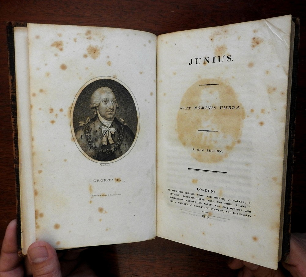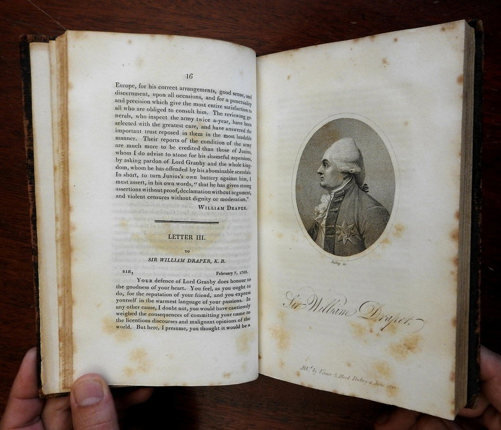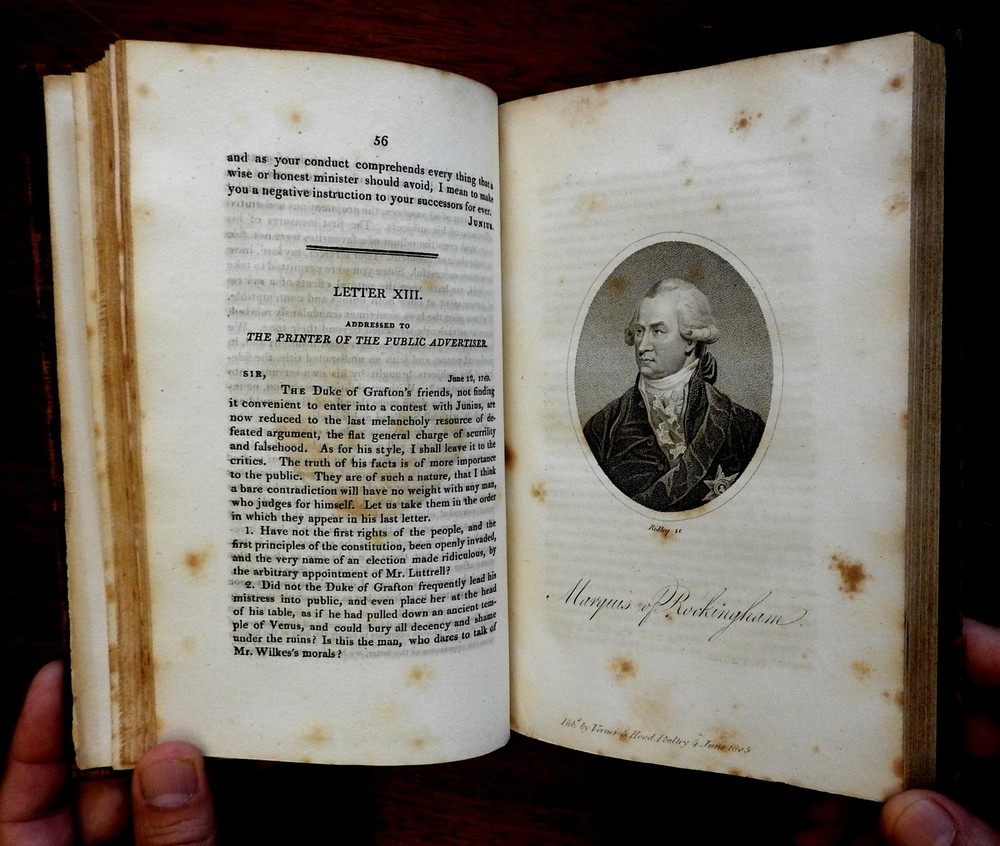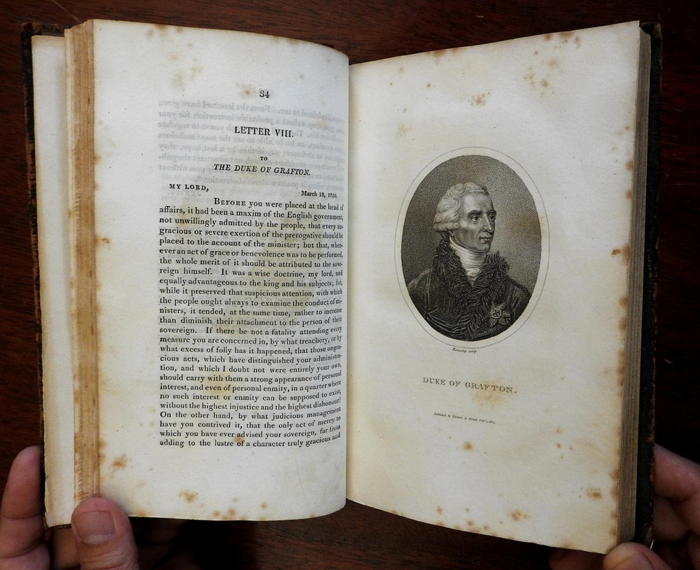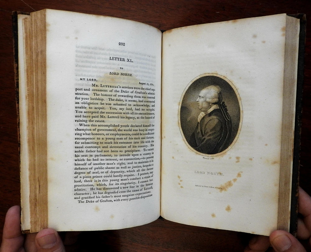 Letters of Junius 1810 British political tracts George III old leather book Letters of Junius 1810 British political tracts George III old leather book (Old Books, 19th Century Books, Letters of Junius, British Politics, George III, Leather Books). Junius - Stat Nominis Umbra. Published 1810, London for Vernor, Hood, and Sharpe... 380 pages. Text in English. Engraved frontis portrait plus nine other stipple engraved portraits throughout (total of 10). Period leather binding, smooth spine, gilt bands and compartment decorations, gilt title lettering on contrasting leather label. Front cover detached, leather dried and scuffed . Front leaves loose. Book well age worn, text block sound, tight and overall clean, as are the fine engraved plates. Junius was the pseudonym of a writer who contributed a series of letters to an English newspaper, the Public Advertiser, from 1769 to 1772. The objective of these letters was to inform the public of their historical and constitutional rights as English citizens and to point out how the government had infringed upon these rights. The writer's real identity is still debated. Please review photos for more detail and our best attempt to convey how this antique item survives. Book Measures c. 8 5/8" H x 5 1/2" W. [B605].