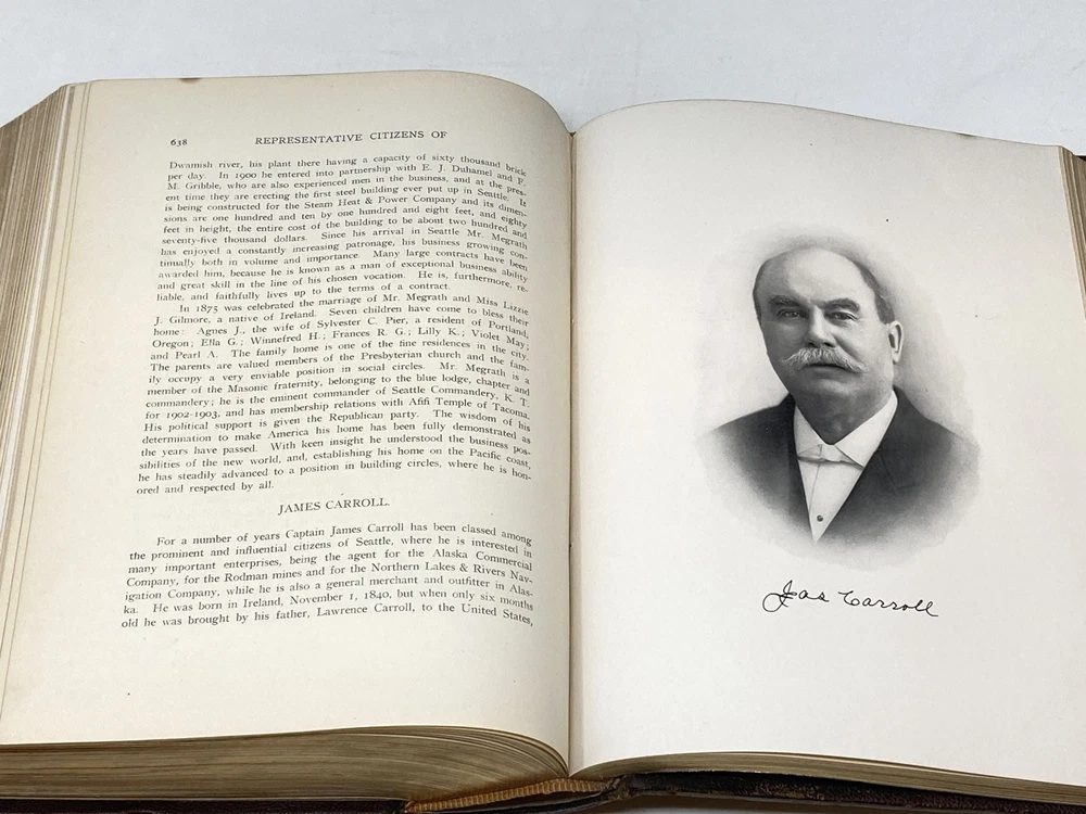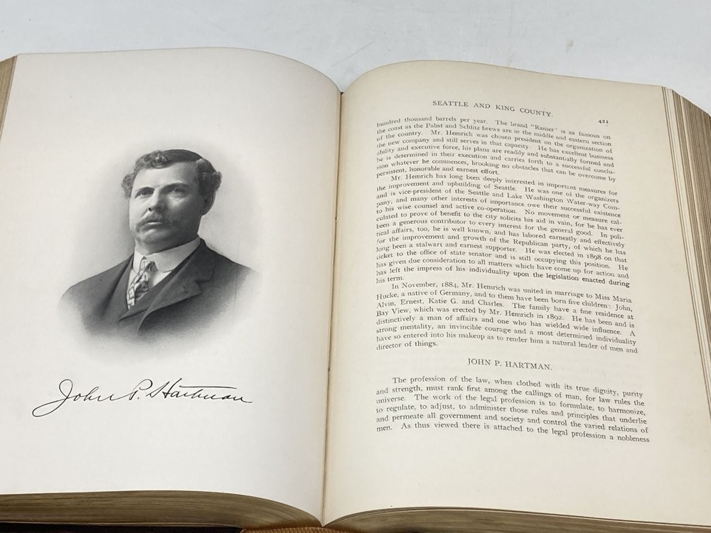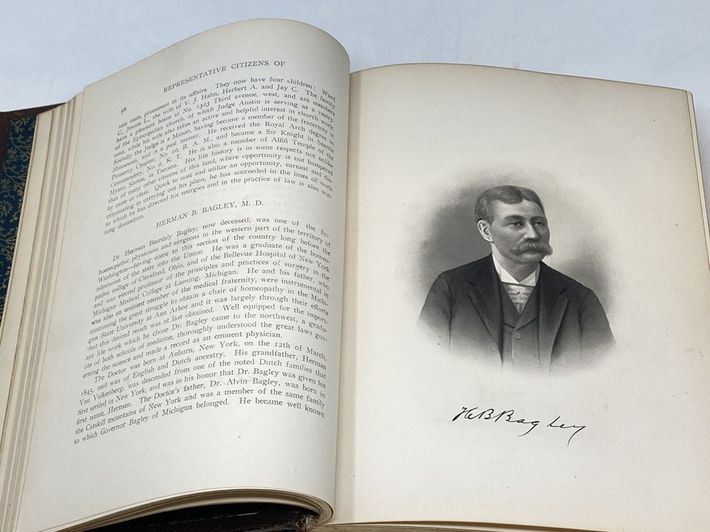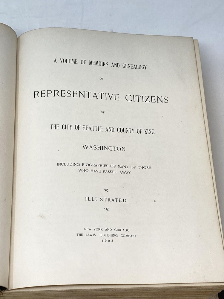 A VOLUME OF MEMOIRS AND GENEALOGY OF REPRESENTATIVE CITIZENS OF THE CITY OF SEATTLE AND COUNTY OF KING WASHINGTON INCLUDING BIOGRAPHIES OF MANY OF THOSE WHO HAVE PASSED AWAY (Henry Sicades Copy) Author: Lewis Publishing Company Title: A VOLUME OF MEMOIRS AND GENEALOGY OF REPRESENTATIVE CITIZENS OF THE CITY OF SEATTLE AND COUNTY OF KING WASHINGTON INCLUDING BIOGRAPHIES OF MANY OF THOSE WHO HAVE PASSED AWAY (Henry Sicades Copy) Publication: New York: Lewis Publishing Company, 1903 Description: Leather-bound. Quarto. Morocco (goatskin) in dark maroon (10 1/4 in. x 8 1/2 in.) Double ruled in blind, with decorative embossed corner devices to both front and back. Beveled boards. Four raised bands (five compartments). Gilt lettering ("King County Washington" to second compartment down, and "Illustrated" to fourth). All edges gilt. Lovely floriated patterned endpapers (gold daisies to dark blue background). Handsome, bright, solidly bound, lovely on the shelf. Illustrated with photographs. This copy belonged to noteworthy Puyallup tribe member Henry Sicade's, a descendant of Chief Leschi copy with his signature and year to front free endpaper. Sicade (1866–1938) served on the Puyallup Tribal Council and the Fife City Council, and additionally, holding important positions with the tribal police and judicial systems, as well as the City of Tacoma. Henry Sicade's signature and year. (Note: The date after the handwritten signature is 1902, and the book's publication date is listed as 1903, which suggests that Sicade had an advance copy of this book.). Near Fine. Seller ID: 86332 Subject: Americana Aardvark Rare Books Eugene, OR We work hard to make your Bookbuying Experience safe, easy and fun. Aardvark Books is a proud member of the ABAA (Antiquarian Booksellers Association of America) and IOBA, Independent Online Booksellers Association. Ezra is also an accredited and Qualified Appraiser of Books and Manuscripts, with a designation from the ASA (American Society of Appraisers), with considerable Archive experience as well. Shipping All books shipped to US destinations are sent via the US Postal Service. Faster shipping is available, please ask before paying. We will combine shipping on items purchased at the same time in order to help reduce costs. International shipping is also available. Please inquire for a shipping quote before ordering. This listing was created by Bibliopolis.
