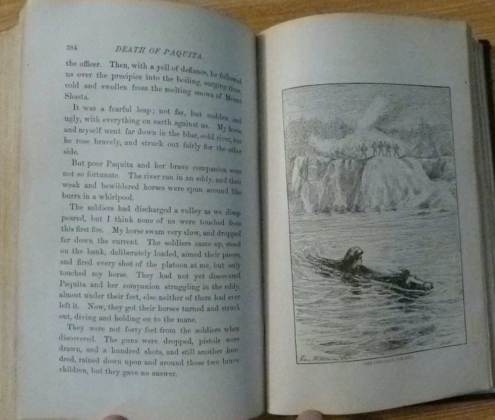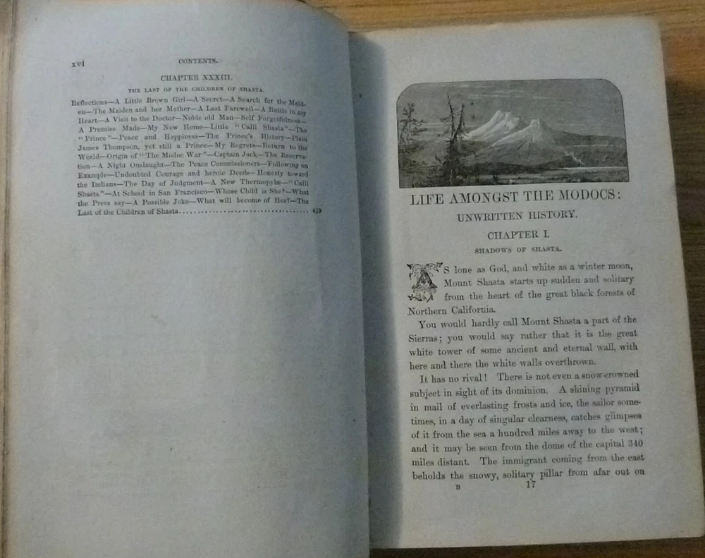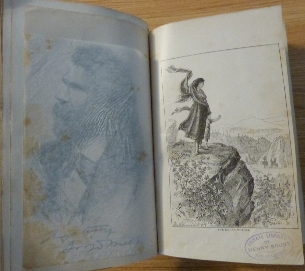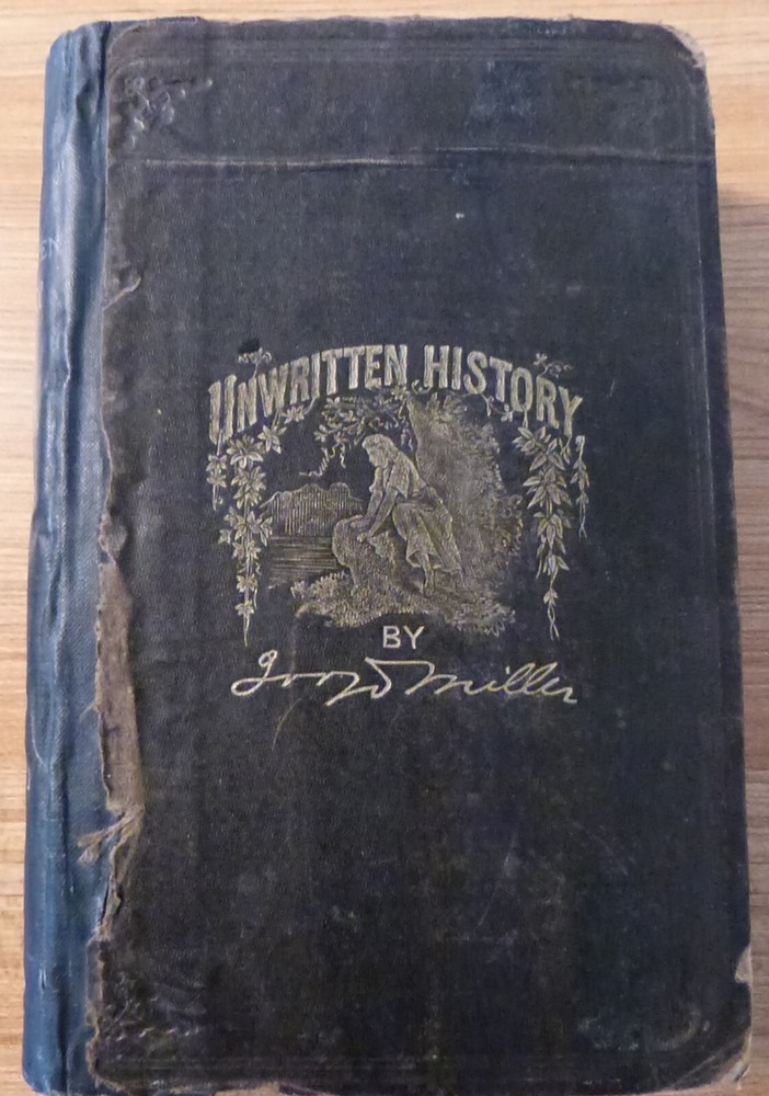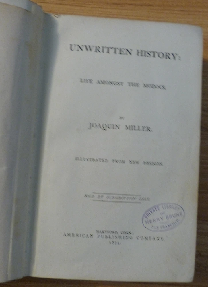 For sale, Unwritten History: Life Amongst The Modocs, written by Joaquin Miller, published by American Publishing, dated 1874, a first American edition. This is an autobiographical account of Joaquin Miller's account of his time among the gold mining camps and Modoc Indian villages of Northern California. This is a hardcover book with black leather covers with gold gilt writing and design on the front cover, 445 pages, illustrated through out. Condition of the book is fair, ex-library twice over. Originally belonged to the Henry Brune private library, then to a Marin county public library. Covers show moderate plus to heavy wear to the covers, moderate plus edge/corner bumping. Some library markings at the bottom of the spine cover, inside of front cover, title page. Front hinge is cracked and has been re-enforced with white hinge tape at the title page. Rear hinge is a little sloppy but still connected. Binding is tight. There is some yellowed scotch tape residue on the first blank page as well as the last blank page at the rear. A few of the pages have very small edge tears. Buyer pays $6.85 USPS media mail domestic shipping. International shipping available through the ebay international shipping program. Payment is through the ebay managed payment system. Please email me if you have any questions. Thanks for looking.