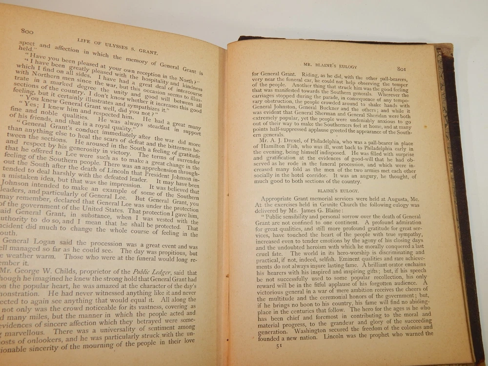 This vintage book titled "Life and Public Service of General Grant" by Colonel Herman Dieck is a collector's edition illustrated biography of President Grant. The leather-bound book, published by Thayer, Merriman & Co. in 1885, is an original piece of historical literature. The book is written in English and covers the topic of President & General Grant's life and public service. It is a must-have for any collector of historical books. Acceptable, covers show much wear, spine especially, wear to boards on corners, pages complete and bound. See pictures for more details. Thanks for looking. Please review the attached pictures and do not hesitate to message me with questions. Don't forget to check out my other listings as I'm always happy to combine shipping to reduce costs. When making multiple purchases please put items in your shopping cart and request an invoice before paying. (The invoice request only works on your PC, not your phone App.) I ship promptly and more than 50% of my material is reused or recycled. U.S. shipping charges are stated in each listing and are determined by weight, size of package, shipping material and distance. Please check my feedback from all my satisfied customers. Payment is expected within 4 days of auction closing and feedback is given after package is received. Normally packages are mailed in 1-2 days after payment. I want you to be satisfied with your purchase. Unless I have made an error in the listing-Buyer pays return shipping fees. No combined shipping or returns on International or third-Party shipping.