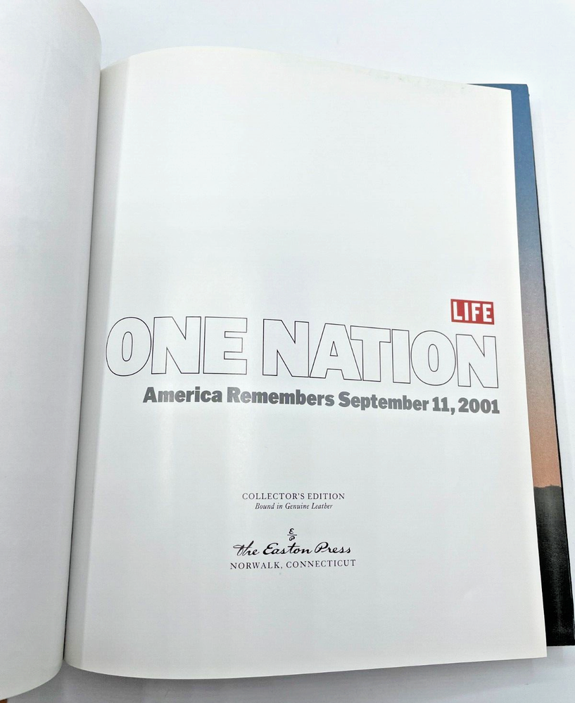 This special edition book titled "One Nation: America Remembers September 11, 2001" is a historical piece that captures the tragic event that changed the world forever. The book is bound in high-quality leather and is beautifully illustrated, making it a great addition to any book collection. Published in 2001, the book is authored by Life Magazine Editors and provides a unique perspective on the United States in the 21st century. It is written in English and is a must-have for anyone interested in history. Smoke-free home. Save my eBay Store as a favorite for other collectibles. I will gladly combine shipping. If you pay for multiple items at the same time, I refund for combined shipping. Items added daily. Thanks for looking!