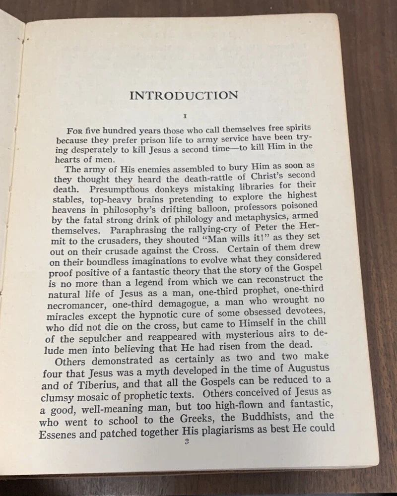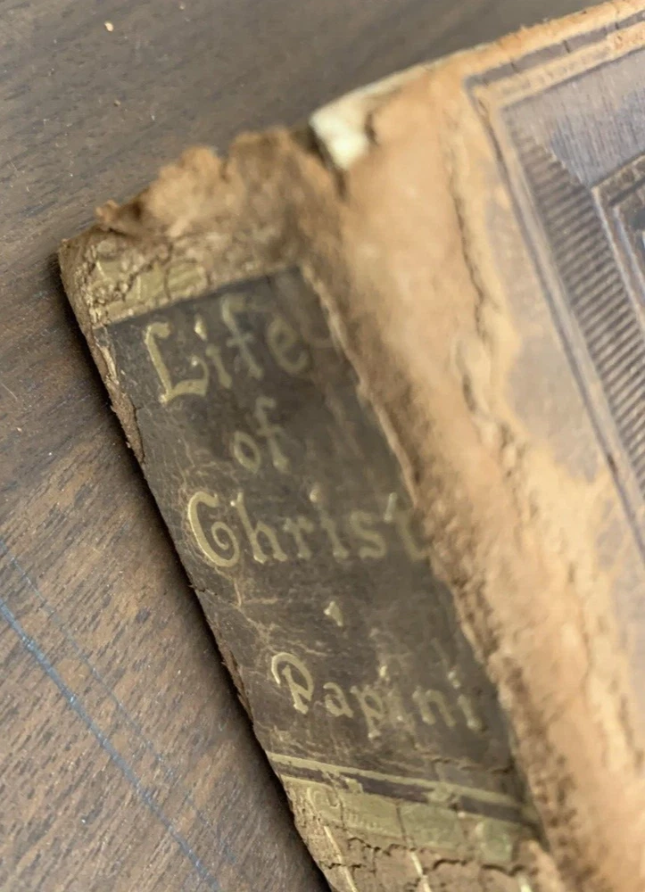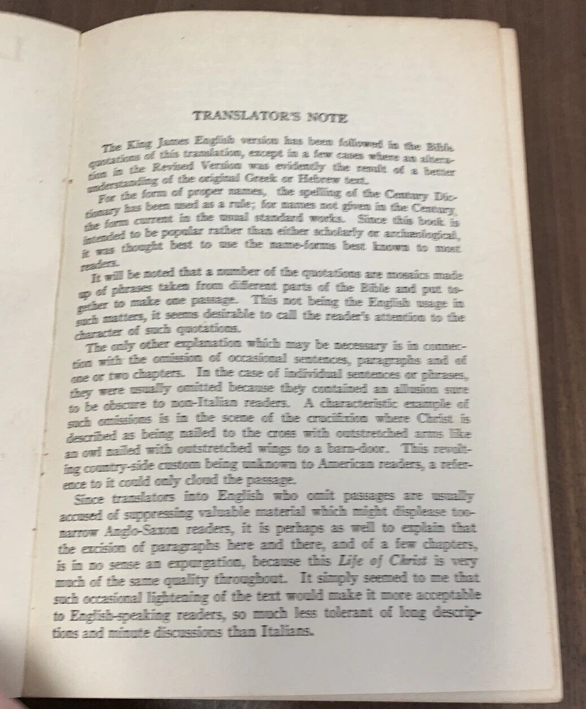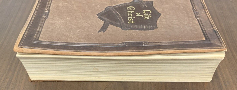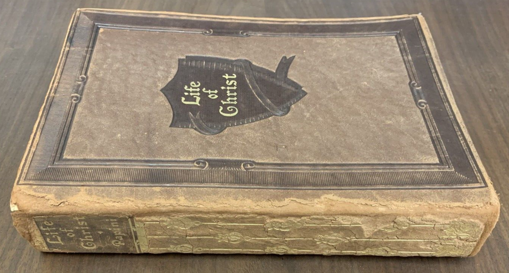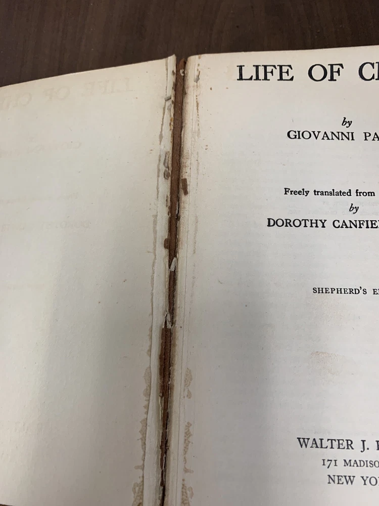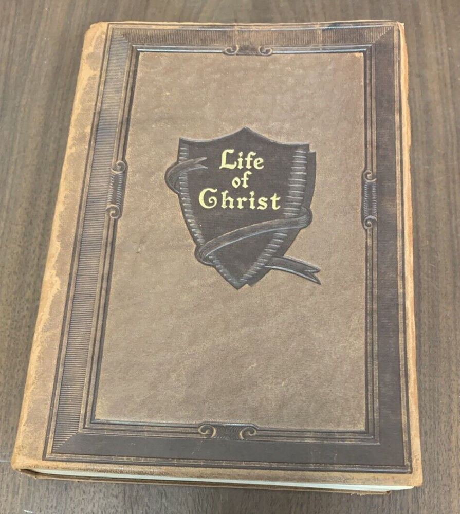 Life Of Christ by Giovanni Papini Translation by Dorothy Canfield Fisher Published in 1923 by Walter Black Shepherd's Edition. Embossed leather cover. Rare with leather cover. Book is in very good condition considering age. Former owner's name on ffp. Date of 1923 on inside cover. Leather cover is in very good condition/slightly curled on right opening, open spine. Wear at head of spine.Tight, square and unmarked except as noted. See photos 5.2"x7.5" 416pp with index br