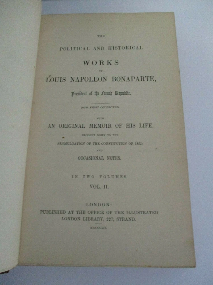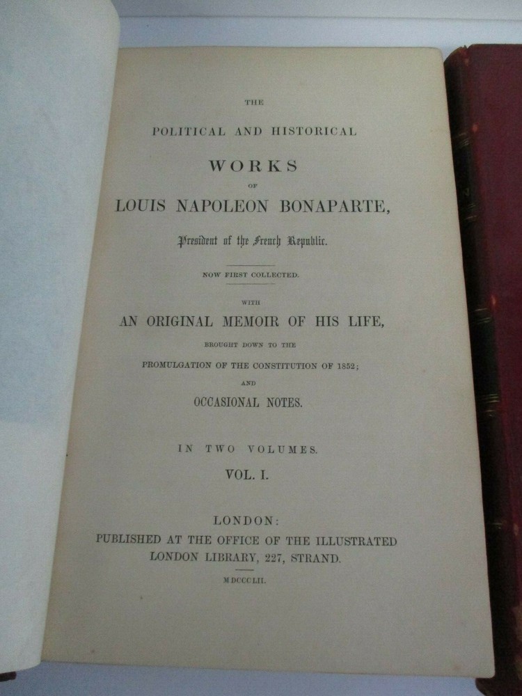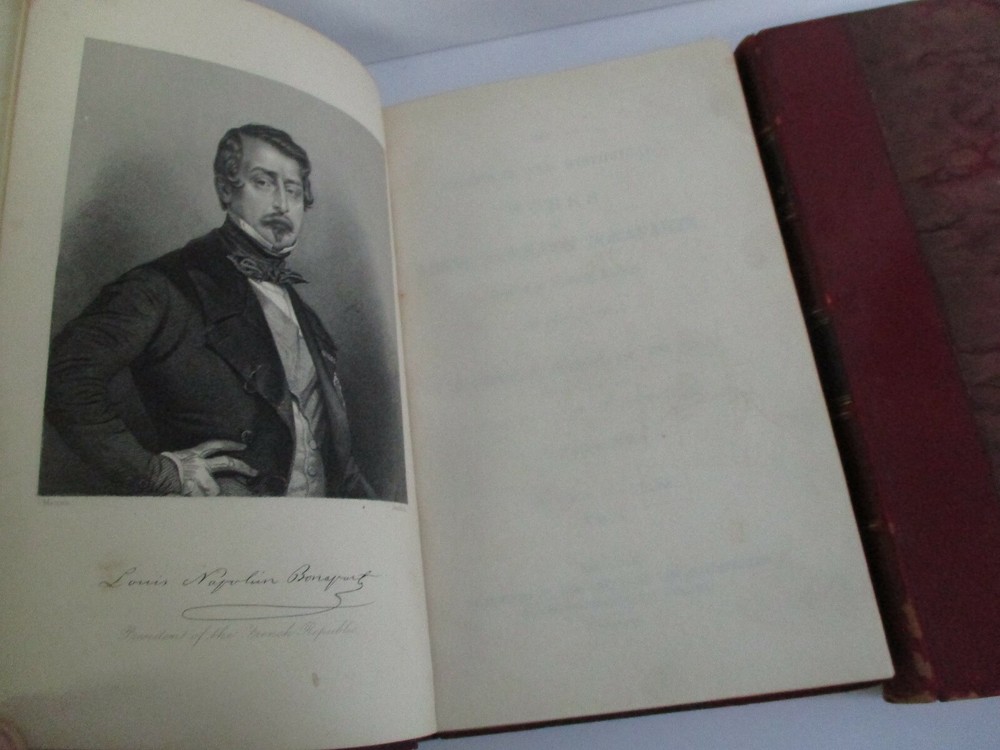 The political and historical works of the President of the French Republic with an original memoir of his life... Each volume measures 9" x 5 5/8" with 3/4 leather and marbled boards binding, marbled endpapers, frontis engraving in Vol I, 462 + 439 pages, top page edge gilt. Thank you