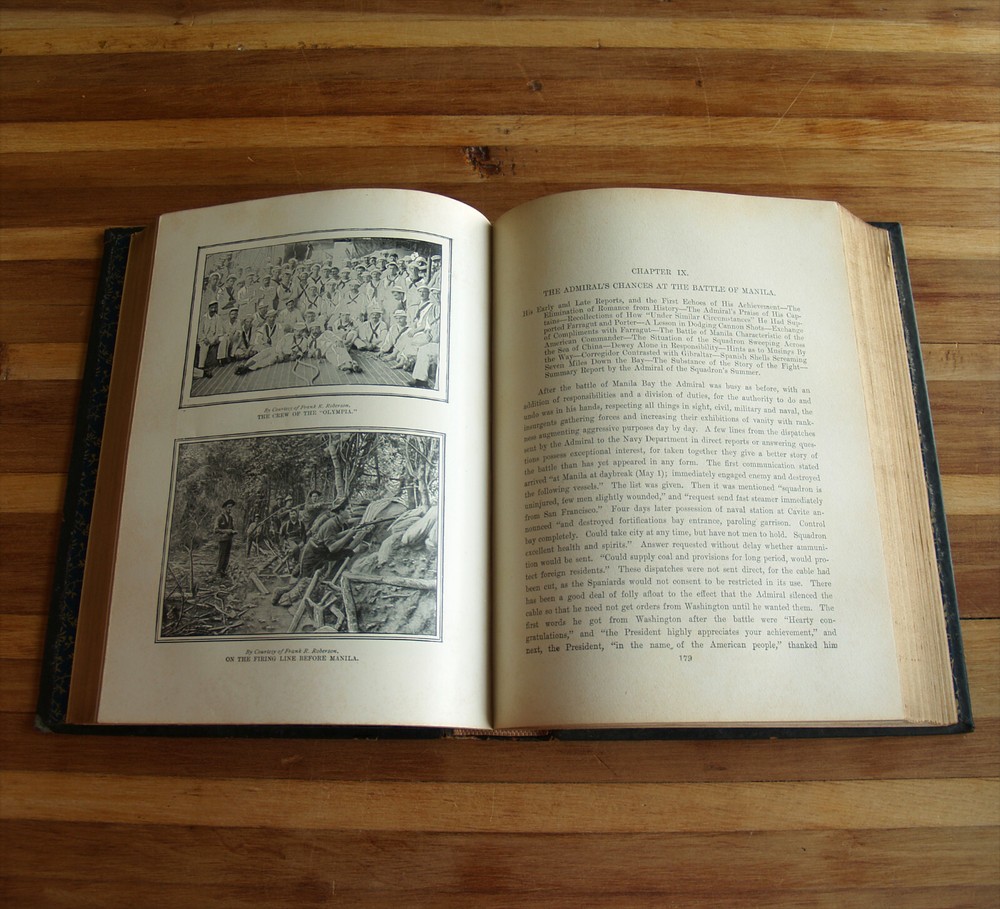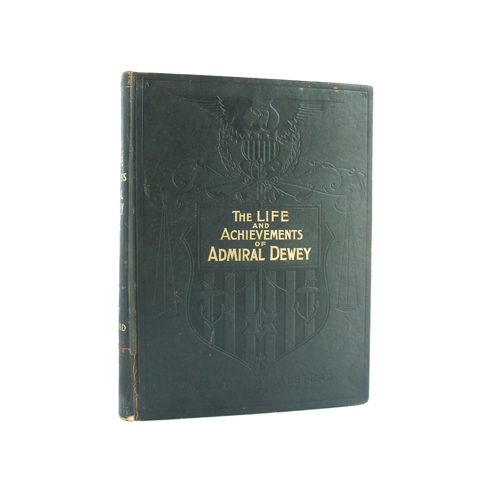 This antique hardcover book is bound in black leather boards with bright gilt lettering and etched decorations featuring an eagle motif and a large shield on the front cover. Wear to spine, inner pages browned, wear and soil. Decorative endpapers. All page edges gilt. Illustrated with black-and-white pictures, this book tells the story of Admiral Dewey's military career. 468 pages; approx. 6"x9". LIFE AND ACHIEVEMENTS OF ADMIRAL DEWEY FROM MONTPELIER TO MANILA Murat Halstead Our Possessions Publishing Co., 1899 First edition
