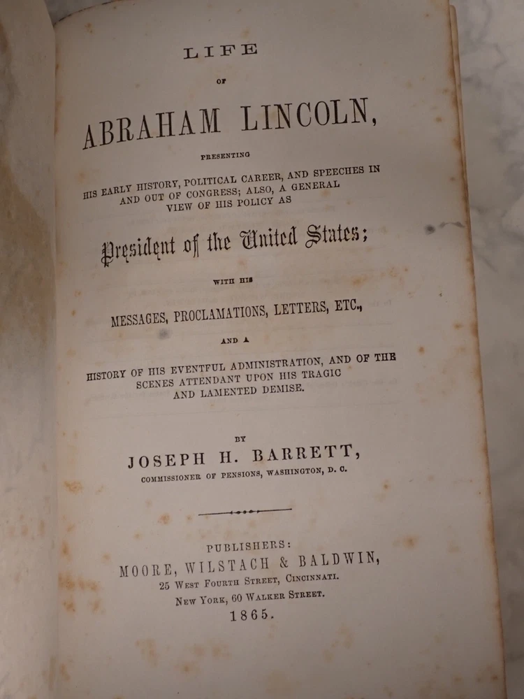 Life of Abraham Lincoln. Joseph H Barrett. 1865 This book is in poor condition. Heavy wear and staining. Covers detached and spine missing. Any questions, feel free to ask. SHIPPING FREE VIA LOWEST COST OPTION. Expedited can be had for additional cost. Just contact me before buying if you wish to pay for expedited shipping.