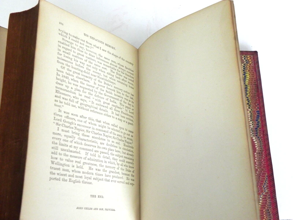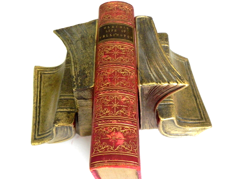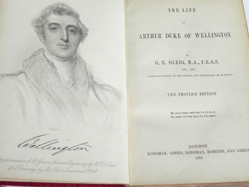 **Life of Arthur Duke of Wellington by G. R. Gleig (People's Edition) 1864 ** Leather ** Gilt Edges ** Gilt Tooling on spine and around boards (front and back) ** 6 Comparments ** Leather label on spine George Robert Gleig (20 April 1796 – 9 July 1888) was a Scottish soldier, military writer, and priest. (See Wikipedia for more information) ***** The book is in very good condition for the age of book (1864). Between 1st free end paper and 2nd free end paper looks like there might have been a repair (see picture) Minor rubbing/scuffing along spine and boards. Light toning. The book is very tight and there are no remainder marks, not ex-library. Any issues have been reflected in the pricing. Does not include bookends. Please see pictures for more information and detail. Please feel free to contact me with any questions you might have. I will be glad to take additional pictures. I tried to describe the book through words and pictures the best I can but if you are not 100% satisfied with the purchase, please know you can return the book for full refund. Ships carefully wrapped in bubble wrap and packed securely in a box. Will ship within 1 business day of receiving payment. Thank you for looking! <meta name="viewport" content="width=device-width, initial-scale=1">