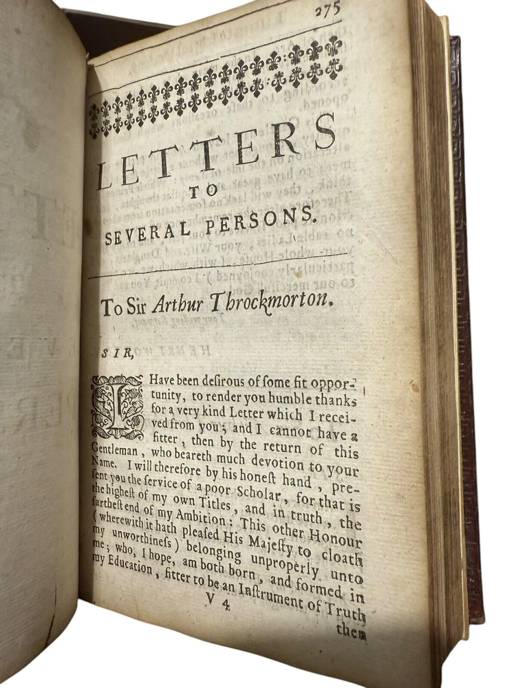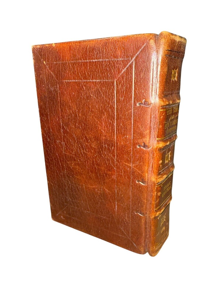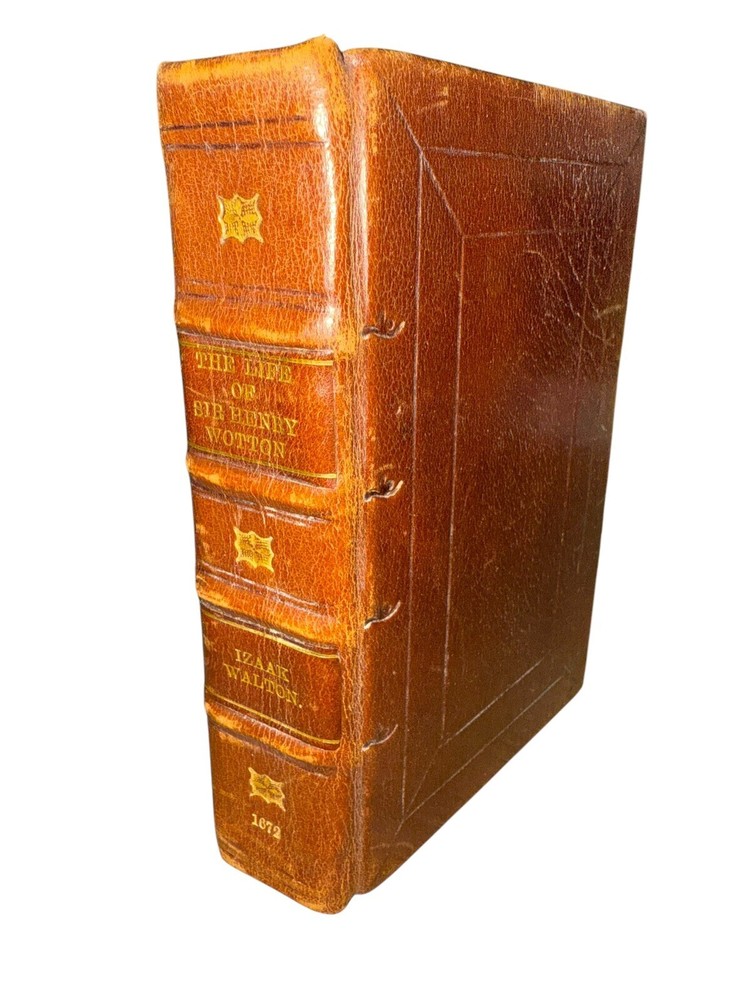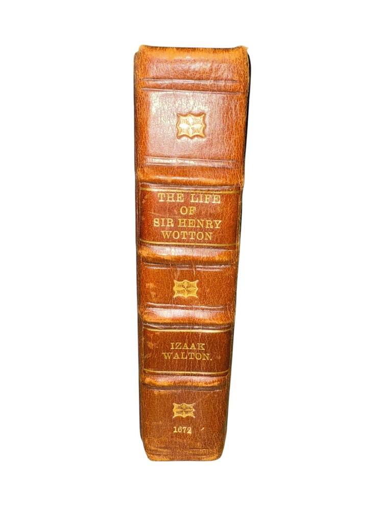 The Life of Sir Henry Wotton Izaak Walton (ed.) London 1672 First Collected Edition, Later Binding Condition: Rebound in full brown leather with raised bands, gilt spine titling, and blind-tooled compartments; minor shelf wear with tight, sound hinges. Modern marbled endpapers. Text block toned with scattered edge wear, occasional small tears, some professional repairs noted at preliminaries. Front free endpaper partially adhered near dedication leaf from rebinding. Copperplate engravings sharp and well-preserved; includes portraits of Villiers, Devereux (with annotation attributed to Walton), and Charles I. No interior markings or prior ownership inscriptions; text remains clean and highly legible throughout. The 1672 collected works of Sir Henry Wotton, edited by Izaak Walton, presenting Wotton’s essays, letters, meditations, and political writings alongside three fine copperplate portraits and decorative 17th-century ornamentation. Includes correspondence with prominent figures of Jacobean England as well as early marginalia identifying the Essex portrait. Wotton’s writings reflect the intellectual and diplomatic world of pre-Civil War England. The 19th-century fine leather rebinding preserves this significant early printing in excellent collector’s condition. *** Please take a moment to view all photos for the best sense of the item’s condition. If only one photo is shown, rest assured the description reflects it carefully. Your item will be shipped promptly and packaged with care.