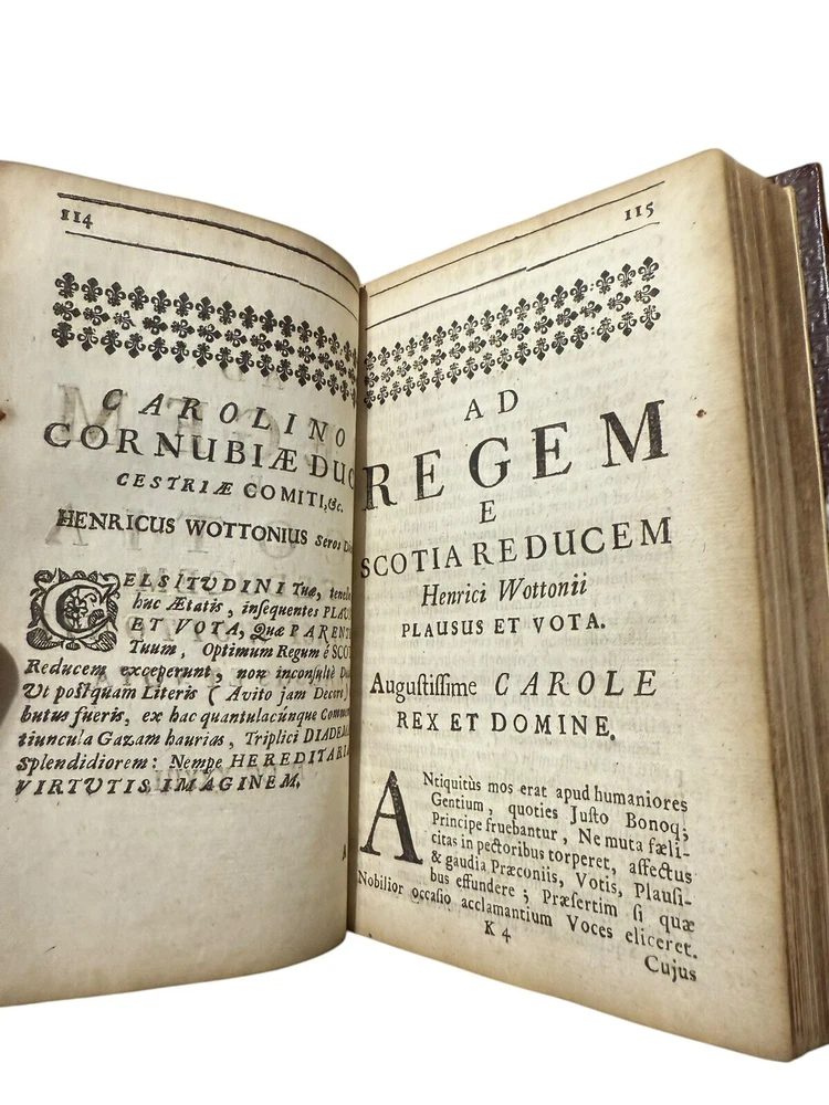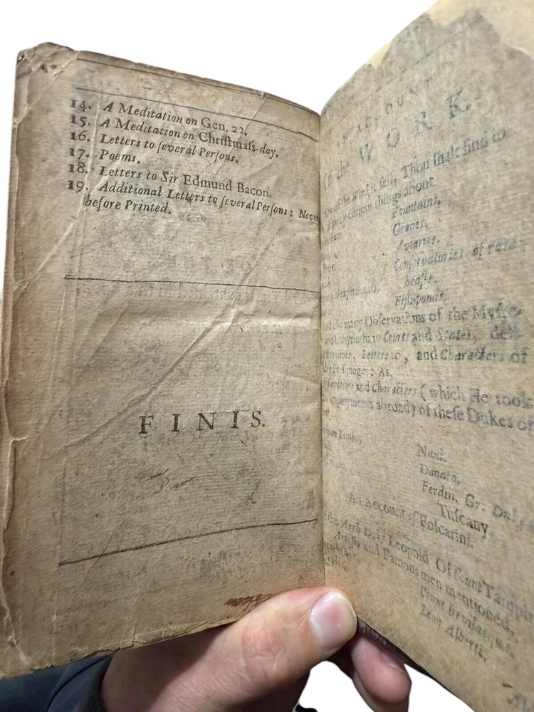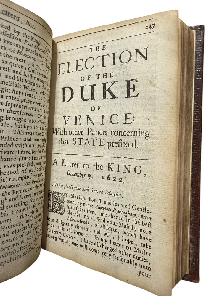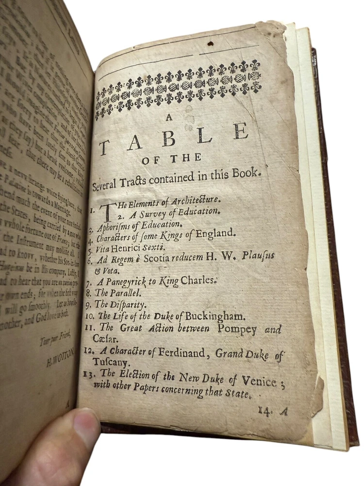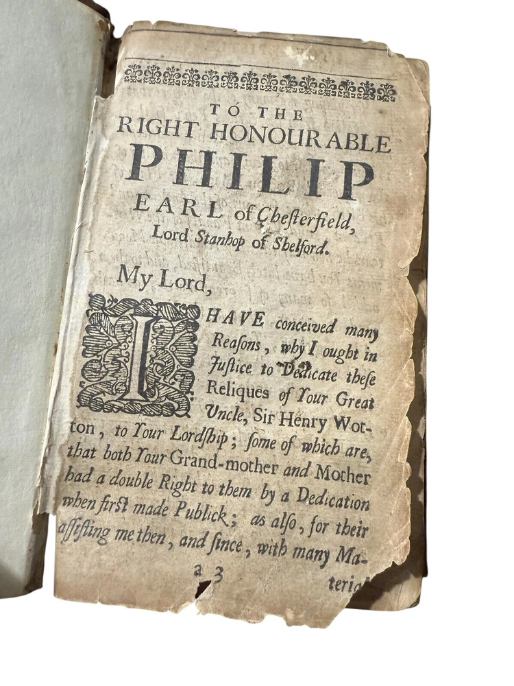 The Life of Sir Henry Wotton Izaak Walton (ed.) London 1672 First Collected Edition, Later Binding Condition: Rebound in full brown leather with raised bands, gilt spine titling, and blind-tooled compartments; minor shelf wear with tight, sound hinges. Modern marbled endpapers. Text block toned with scattered edge wear, occasional small tears, some professional repairs noted at preliminaries. Front free endpaper partially adhered near dedication leaf from rebinding. Copperplate engravings sharp and well-preserved; includes portraits of Villiers, Devereux (with annotation attributed to Walton), and Charles I. No interior markings or prior ownership inscriptions; text remains clean and highly legible throughout. The 1672 collected works of Sir Henry Wotton, edited by Izaak Walton, presenting Wotton’s essays, letters, meditations, and political writings alongside three fine copperplate portraits and decorative 17th-century ornamentation. Includes correspondence with prominent figures of Jacobean England as well as early marginalia identifying the Essex portrait. Wotton’s writings reflect the intellectual and diplomatic world of pre-Civil War England. The 19th-century fine leather rebinding preserves this significant early printing in excellent collector’s condition. *** Please take a moment to view all photos for the best sense of the item’s condition. If only one photo is shown, rest assured the description reflects it carefully. Your item will be shipped promptly and packaged with care.