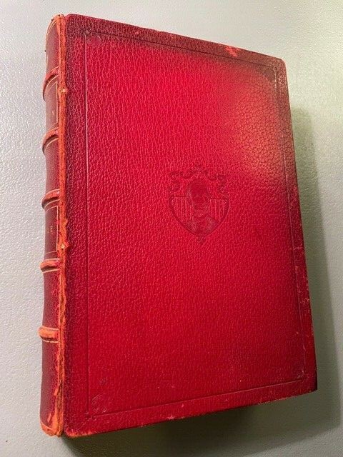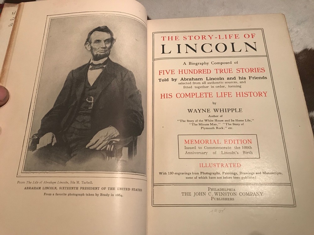 The Story Life of Lincoln: A Biography composed of Five Hundred True Stories by Wayne Whipple. Published by John C Winston, Philadelphia, 1908. 1st Edition. 708 pgs. 6 1/2" by 9" inches. Special "Memorial" limited edition of 800 copies in VG minus condition. unnumbered. Full red leather binding with wear to extremities. Head and tail of spine and corners bumped. Front board starting to crack but still holding firm. Former owners bookplate on pastedown. Pages are uncut. Some light foxing to pages. Otherwise pages are clean and tight to binding. An overall well preserved copy of a classic biography of Abraham Lincoln published with material provided by the Springfield Historical Society in celebration of the 100th anniversary of Lincoln's birth. Illustrated throughout with 150 illustrations and a nice Frontis-piece illustration of Lincoln in vg condition. Scarce in this binding. U.S. History. Civil War. Abraham Lincoln.