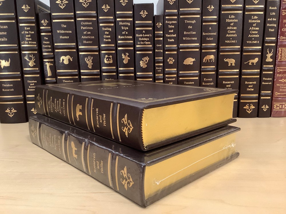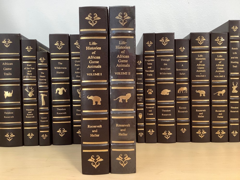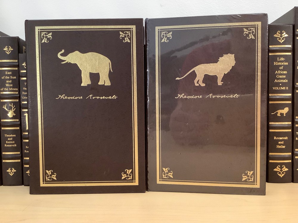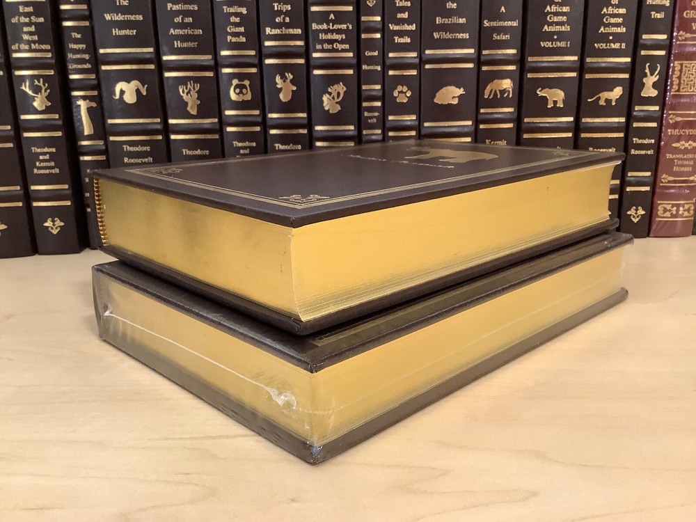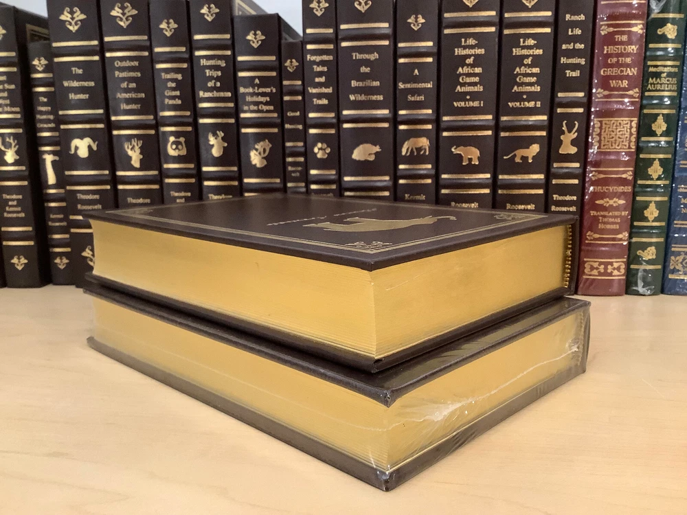 Life-Histories of African Game Animals Vol I & II - Theodore Roosevelt from the “Classics Library of Hunting & Outdoor Adventure” bound in leather, with gilt edged pages Item Condition: A leatherbound hardcover set of two volumes, in Very Good condition. Volume I is open, and Volume II is sealed. Volume I – There are no names, bookplates or stamps from previous owners inside. The binding is tight and the pages are clean. The gilt page edging is bright with scrapes, dings and marks to it. The leather is in nice condition with some wear, and minor bumping to the corners and spine. Interior photos are from this copy. Volume II – Is still in its original seal. It is beginning to open and there are some flaws in the gilt edging. The corners and spine have mild bumping to them. Dimensions for each book are approx: 9.25" x 6.25" x 1.25 - 1.5” These books will ship in a box with bubble wrap. Photos are of the actual books that will be shipped.