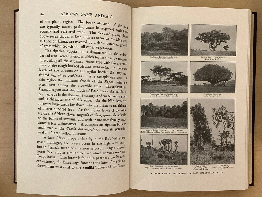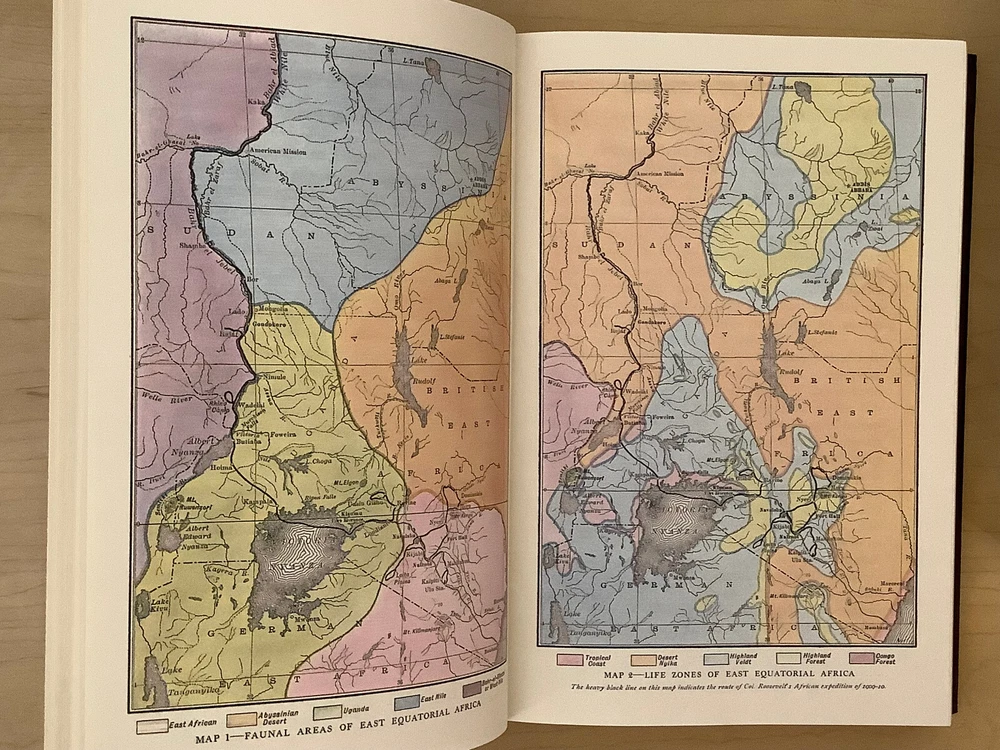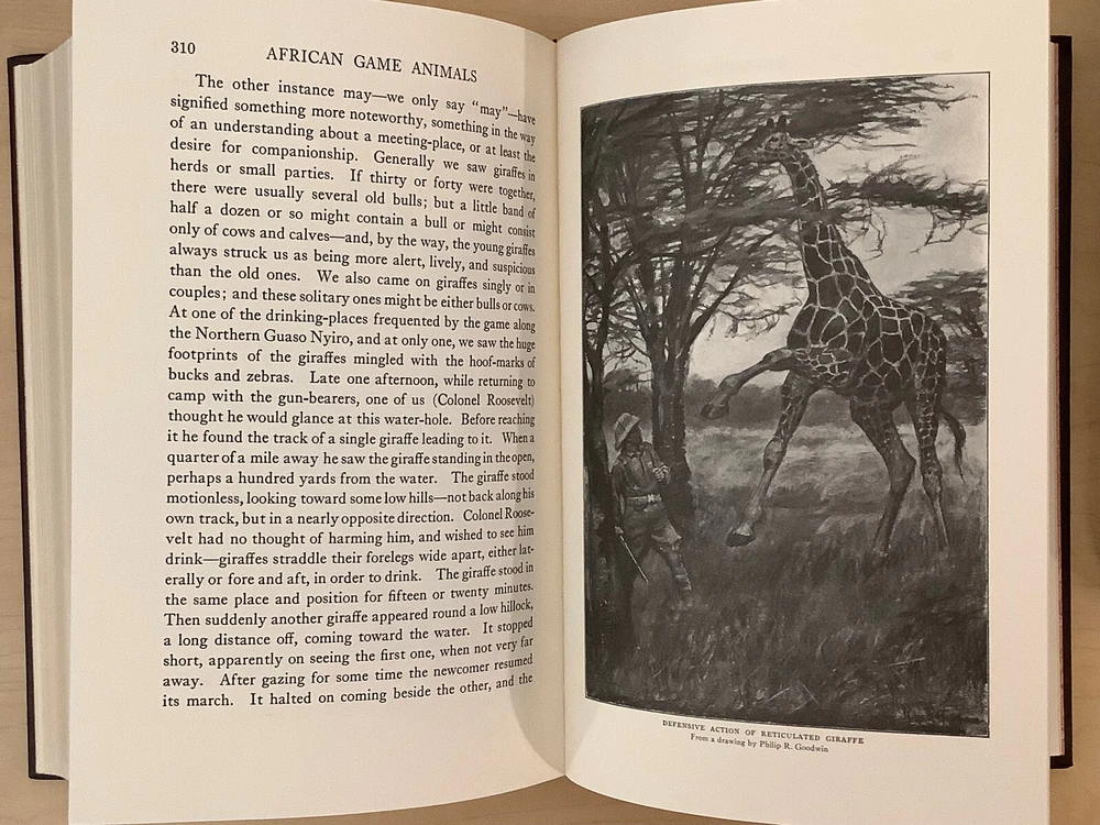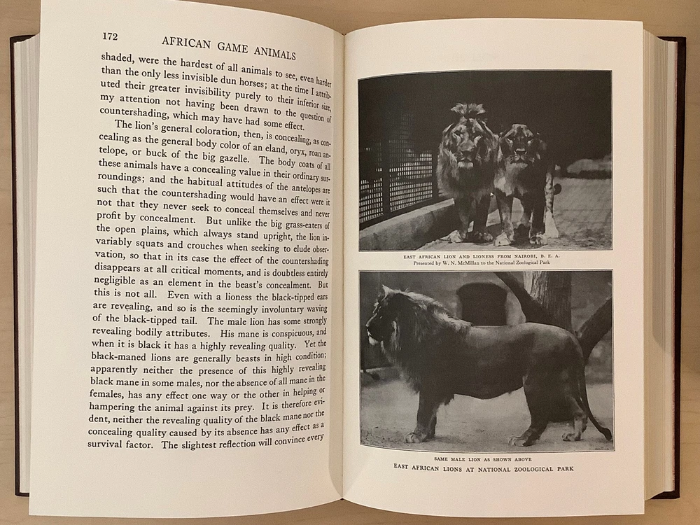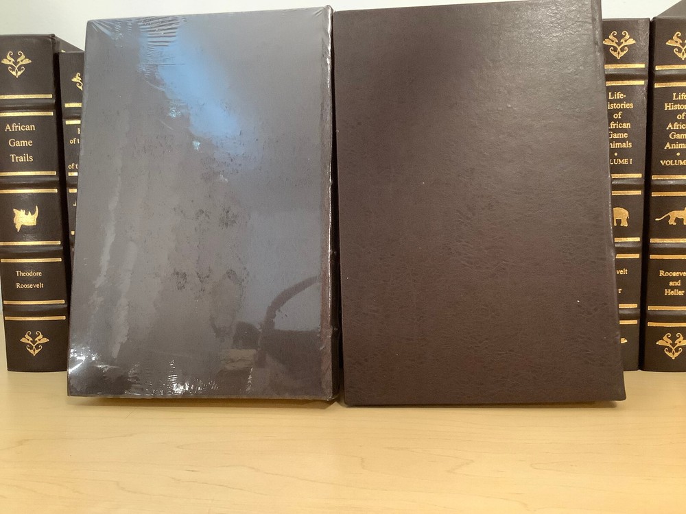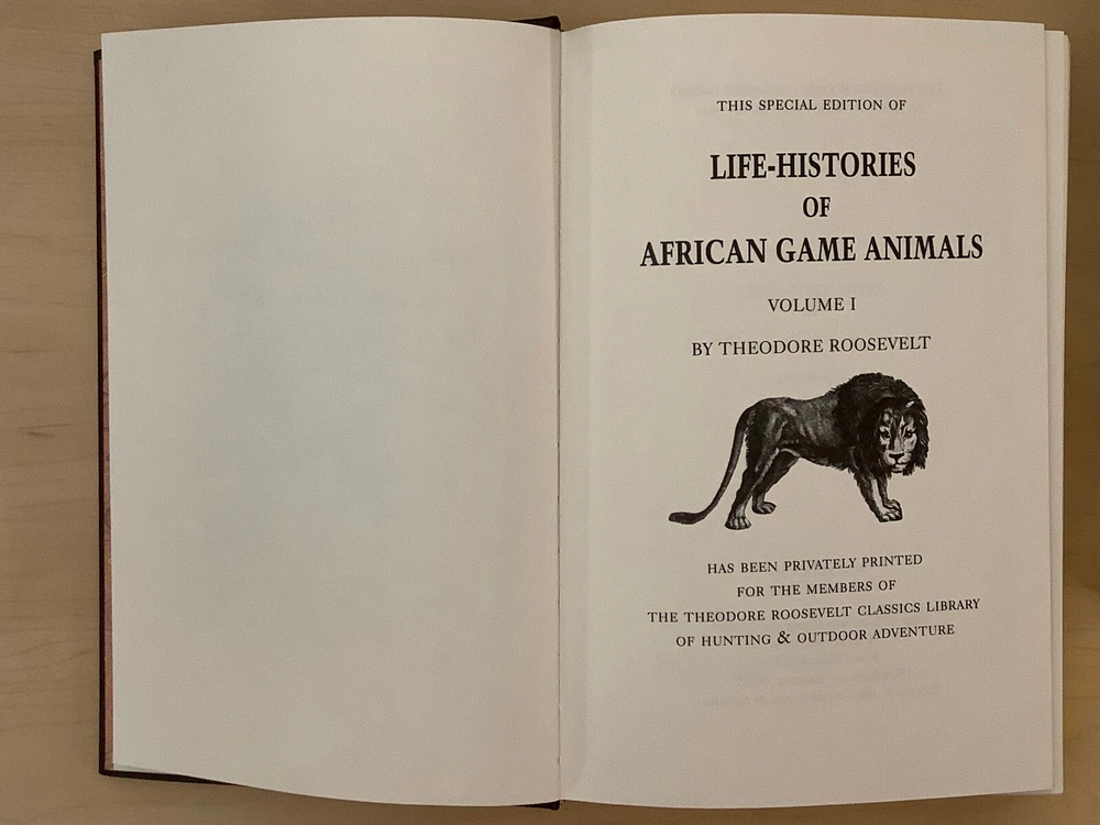 Life-Histories of African Game Animals Vol I & II - Theodore Roosevelt from the “Classics Library of Hunting & Outdoor Adventure” bound in leather, with gilt edged pages Item Condition: A leatherbound hardcover set of two volumes, in Very Good condition. Volume I is open, and Volume II is sealed. Volume I – There are no names, bookplates or stamps from previous owners inside. The binding is tight and the pages are clean. The gilt page edging is bright with scrapes, dings and marks to it. The leather is in nice condition with some wear, and minor bumping to the corners and spine. Interior photos are from this copy. Volume II – Is still in its original seal. It is beginning to open and there are some flaws in the gilt edging. The corners and spine have mild bumping to them. Dimensions for each book are approx: 9.25" x 6.25" x 1.25 - 1.5” These books will ship in a box with bubble wrap. Photos are of the actual books that will be shipped.