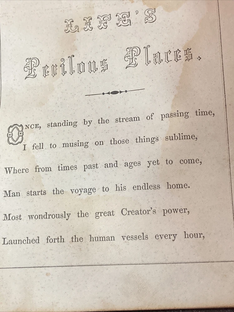 Life’s perilous places Book 1863 E. S. Stanley Extremely Rare. Needs to be rebound. Leather cover is a bit warped. Not bad considering it’s age....