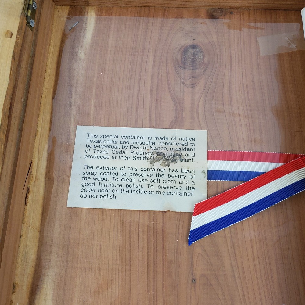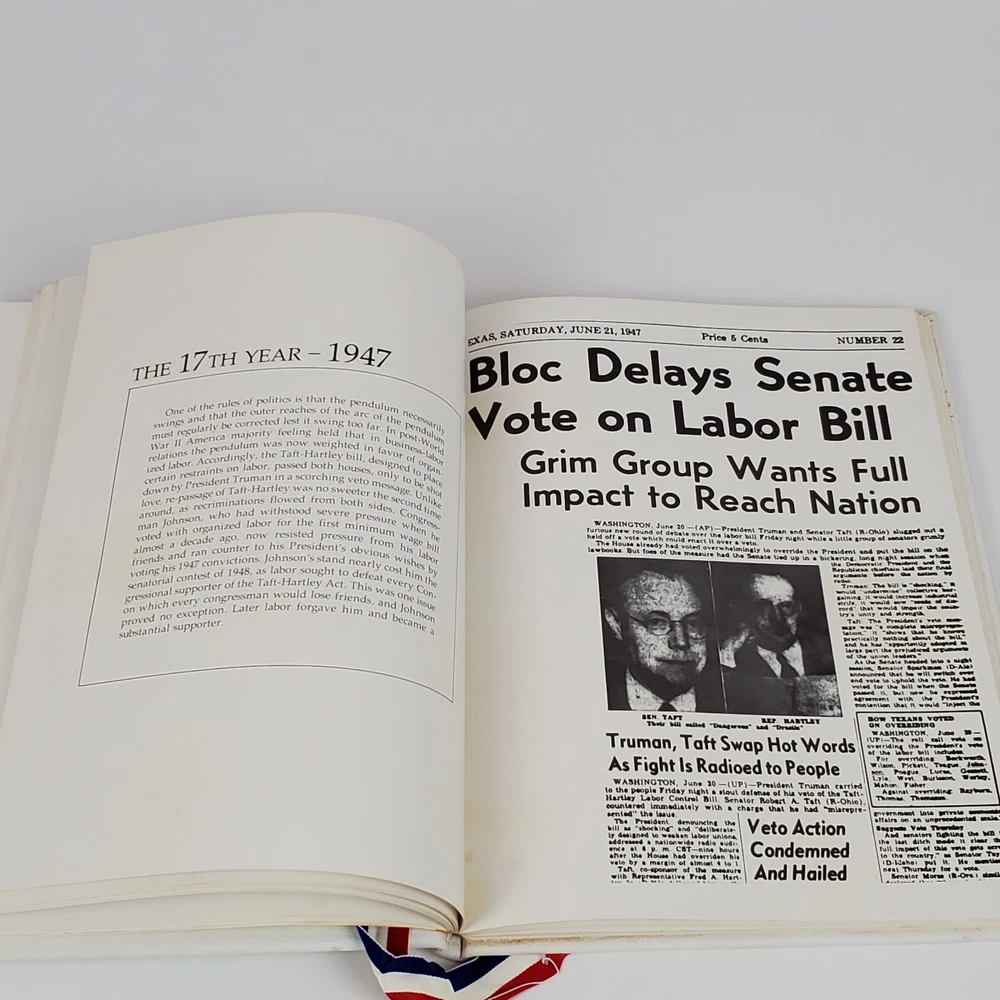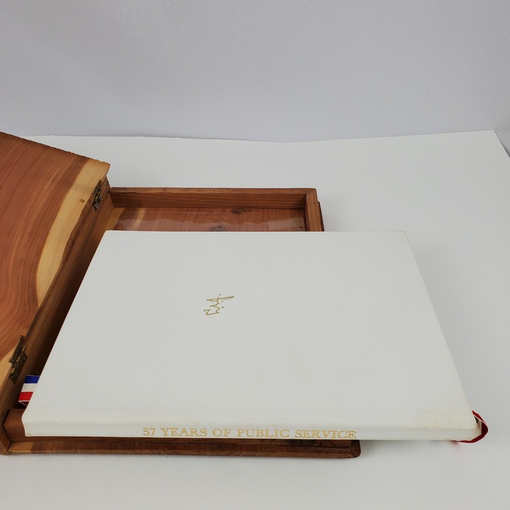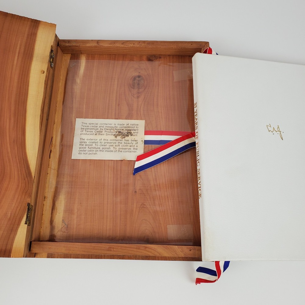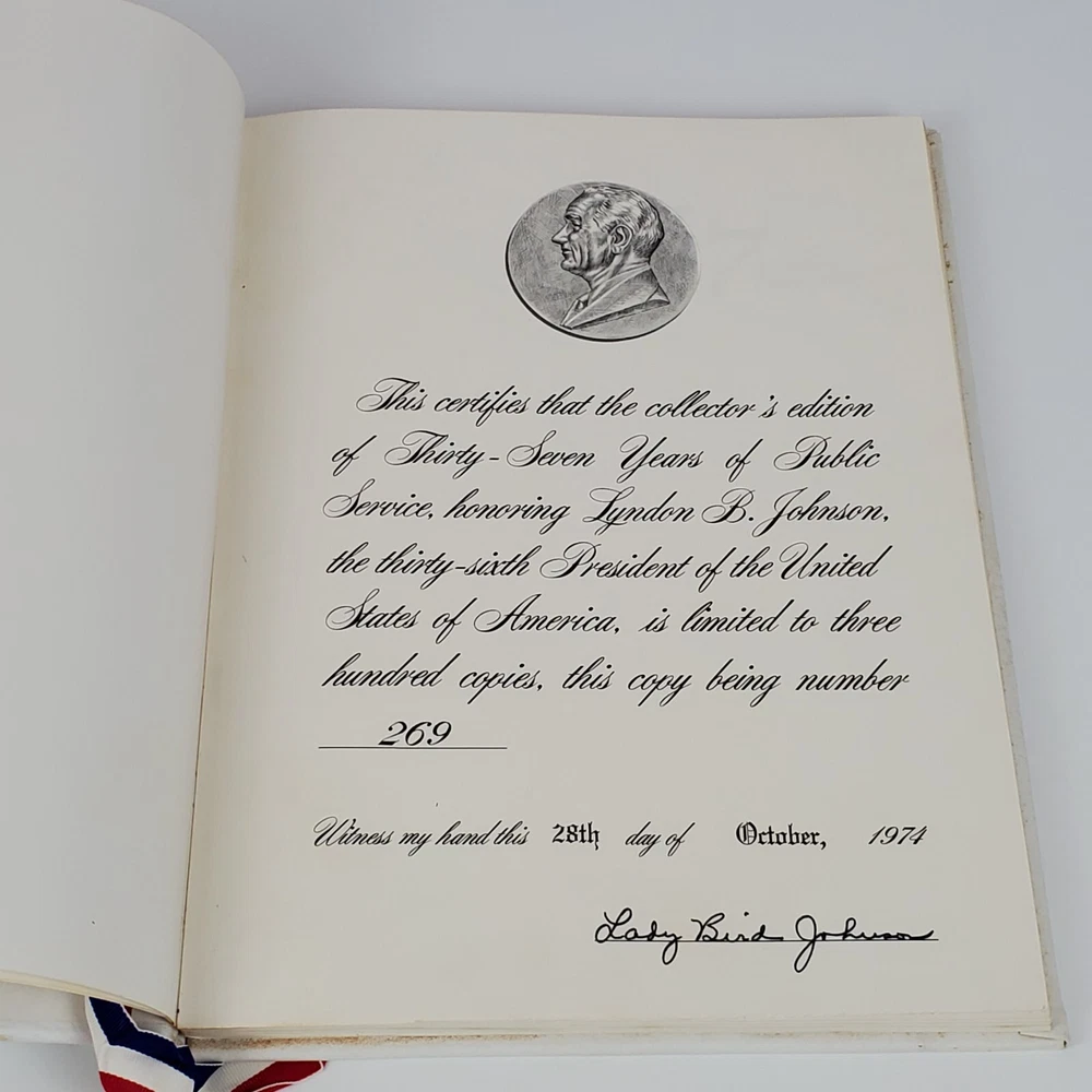 Limited Edition 37 Years Of Public Service Lyndon B. Johnson By Joe B. Frantz. Overall Good Vintage Condition. There are some stains on the first 4 pages which are blank. The red, white, and blue silk bookmarks will be steamed and pressed prior to shipping. Please see pictures. Pages are still crisp. This very special Limited Edition book is unpaginated, full white leather, gilt lettering on spine and cover. Silk red, white, and blue bookmarks. Native Texas Cedar and Mesquite hinged clamshell box with "L.B.J" carved on the front cover. Limited Edition of 300 copies, this being number 269, signed by Mrs. Lady Bird Johnson on October 28th, 1974. Book contains many color photos as well as black and white photos. Publisher: Shoal Creek Publishers, INC. Austin, Texas. Author: Joe B. Frantz. Copyright: 1974 Library of Congress Catalog Card Number: 73-91025