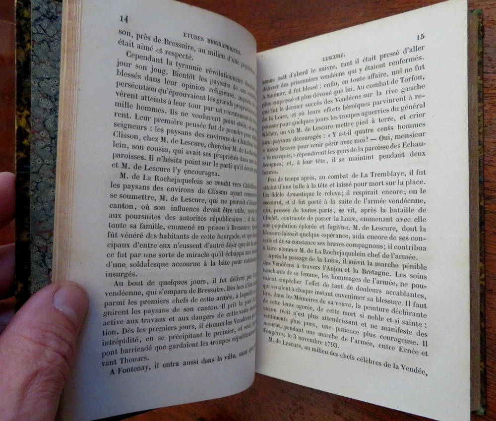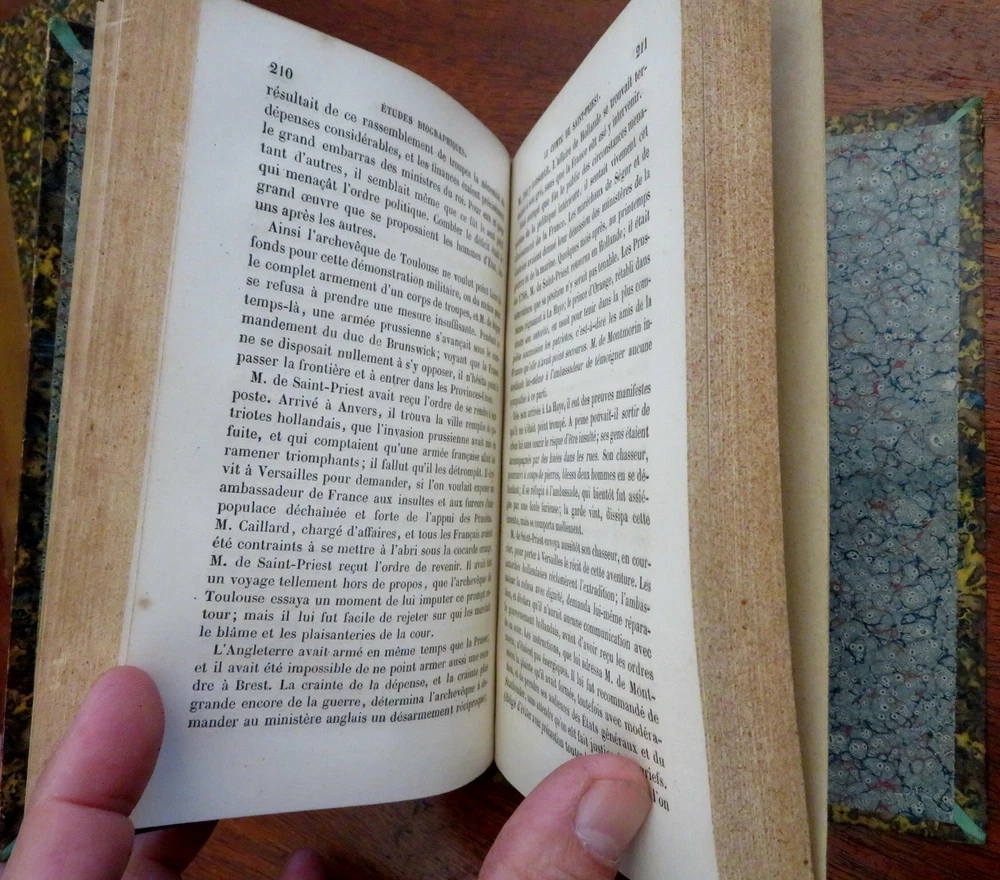 Literary & Historical Studies de Barante 1859 leather 4 vol. French set Literary & Historical Studies de Barante 1859 leather 4 vol. French set (Old Books, 19th Century Books, Leather Books, French Books, Literature, History.). Etudes Litteraires et Historiques, by de Barante. Published 1859, Paris by Didot et Cie. 4 volumes, each c. 425 pages. Text in French. Attractive antiquarian 1/4 leather binding, smooth spine, gilt bands, gilt title lettering on contrasting red leather labels, marbled covers & end papers. Set is physically old and shows some signs of handling and time. Set is not new or in "new" condition. Bindings age worn, spine leather is dried and crackled although still supple, mostly light minor signs of careful handling and time but nothing offensive or severe, set remains overall attractive on the shelf. Paper is gently toned, still clean, tight, sound internally. The set displays a pleasing and unique age patina and is in overall nice antiquarian condition, any age flaws which may be present appear to us easy to overlook or forgive. Please review photos for more detail showing how this set survives. The asking price reflects the condition based on our examination and 35+ years full time exposure to antiquarian books, maps and printed ephemera of all types and genres. Flaws seen and/ or described have been taken into account. Books Measure c. 7 1/4" H x 4 1/2" W. [B7386].