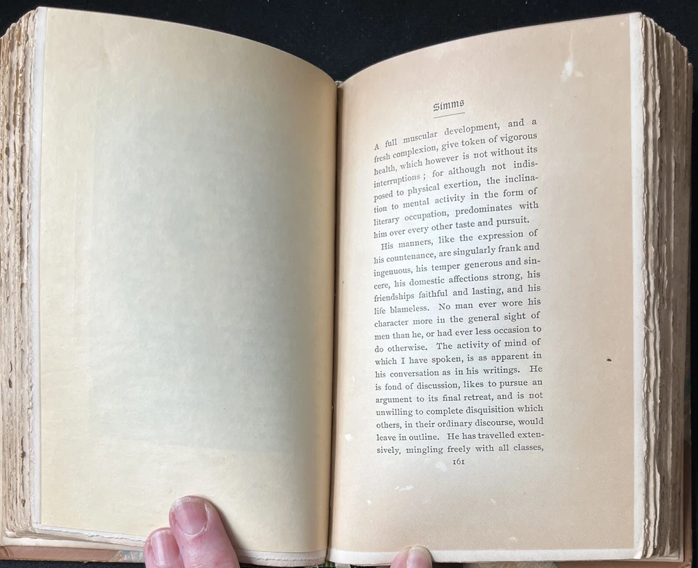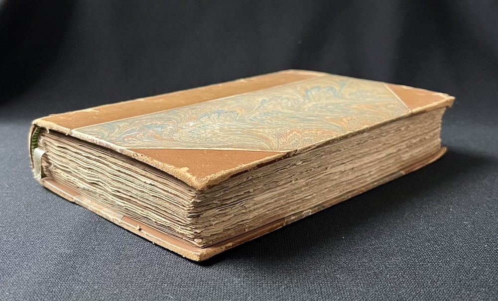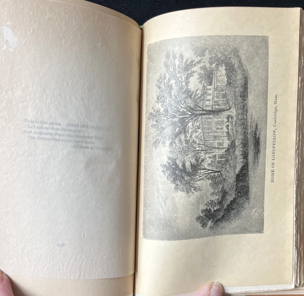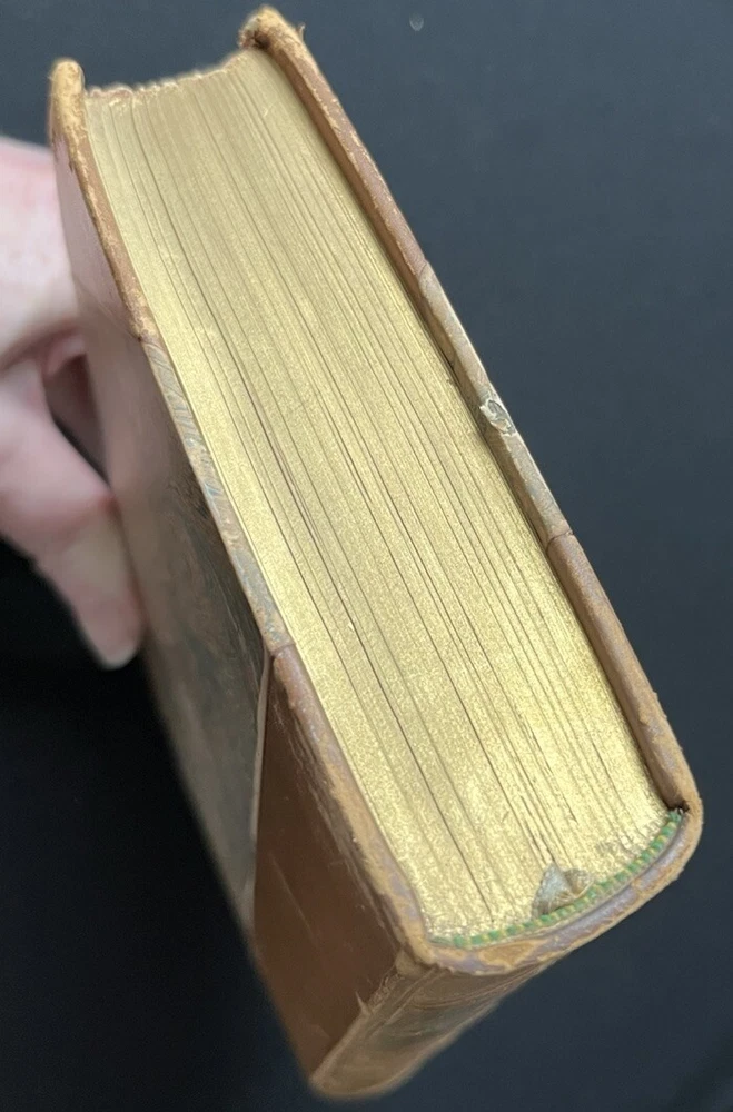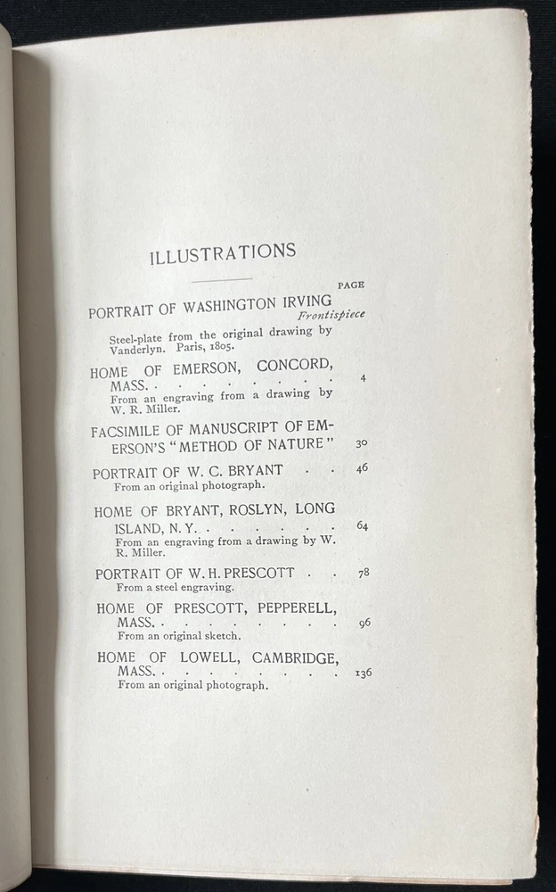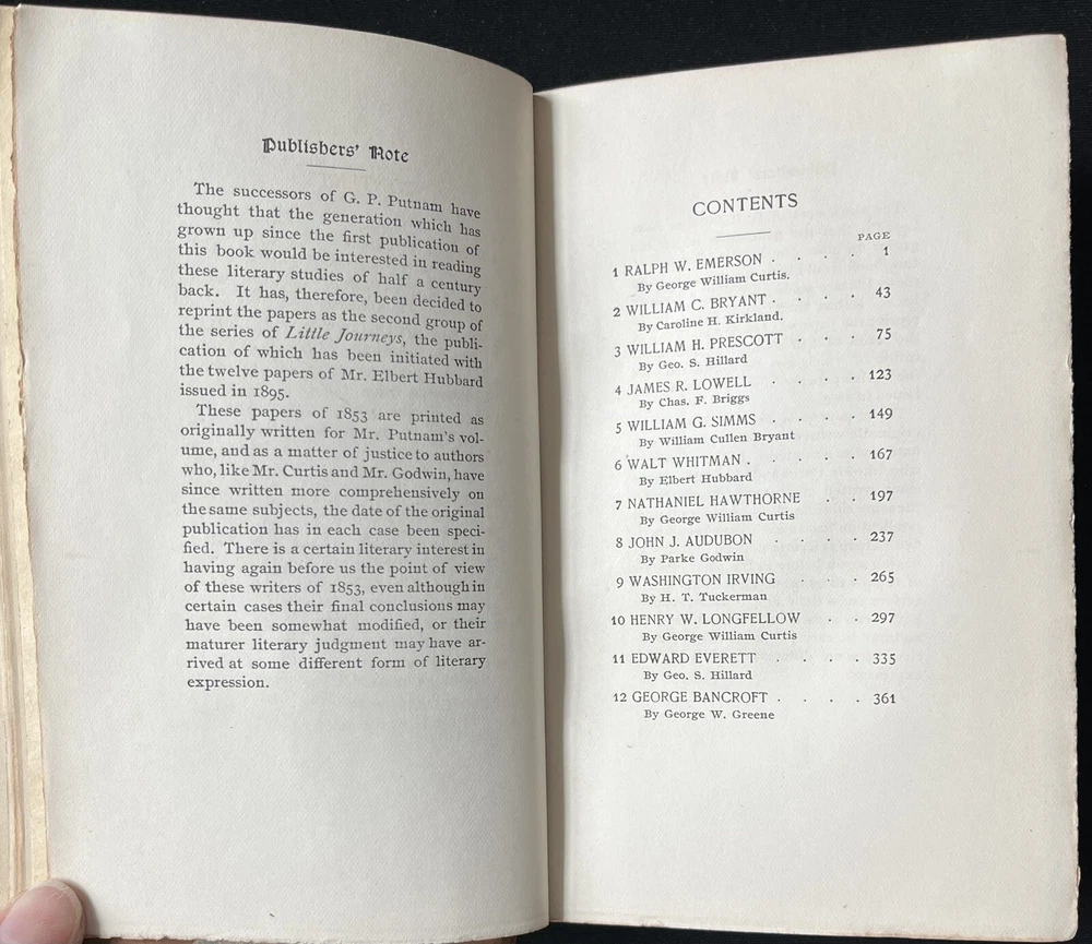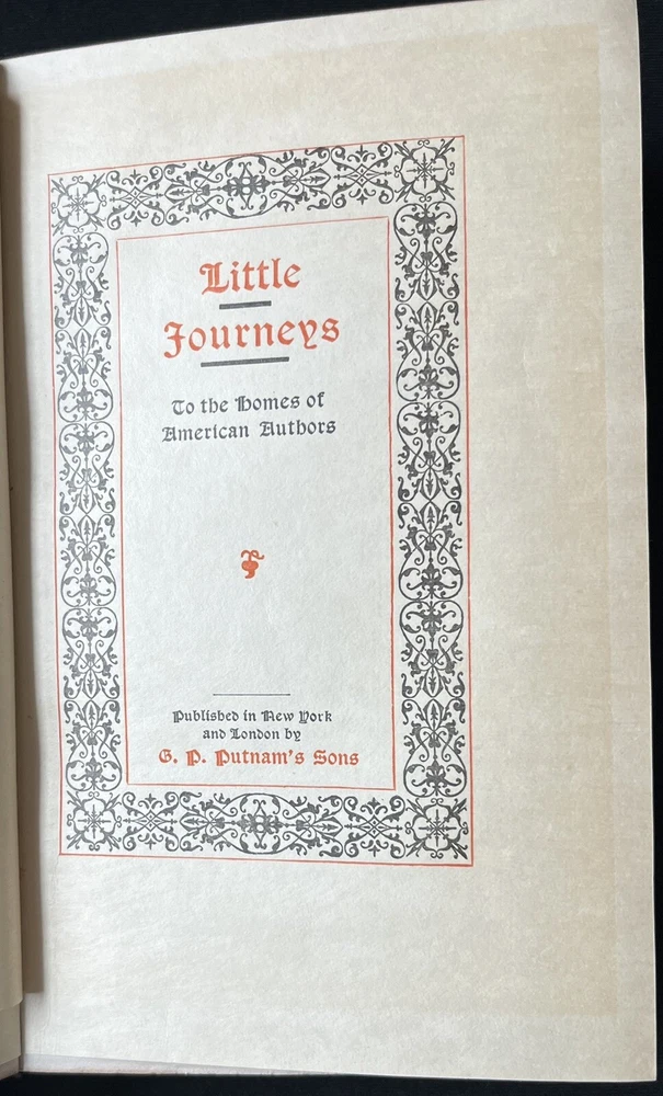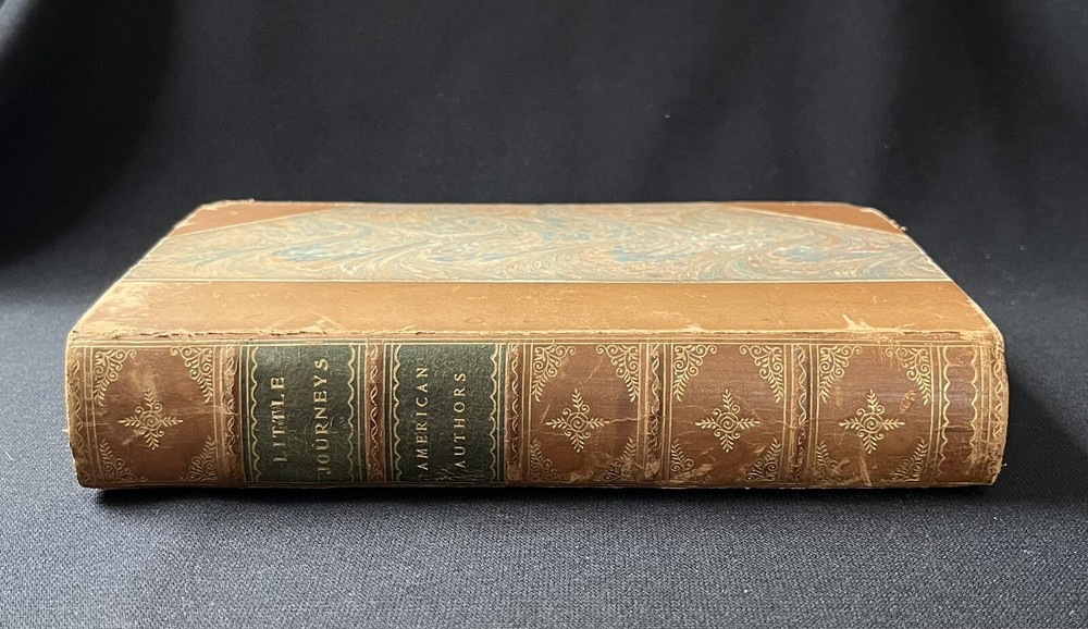 This is an antique book titled "Little Journeys to the Homes of American Authors”. It is a collection of papers written to provide a short biography of key American authors, including a description of where they lived, and a critique of their writing. Each paper is written by a different author. The book was published in 1896 by G.P. Putnam’s Sons in New York. The book has a leather binding, marbled boards and leather corners. The spine has ridges. The spine cover and the upper edges of the pages are gilded in gold. The book also comes with illustrations. The book is travel ready being 6.75 x 4.5 inches. The book is in wonderful condition for its age. The binding is intact and tight, and the pages are clean and free of tears. The edges of the pages are worn, as they are rough cut. Pages opposite of illustrations have a fair amount of foxing (shown in a photo). The cover has signs of wear consistent with its age. The leather on the back corners is worn (see photos). This is a wonderful book to add to any collection of antique literature about American authors.