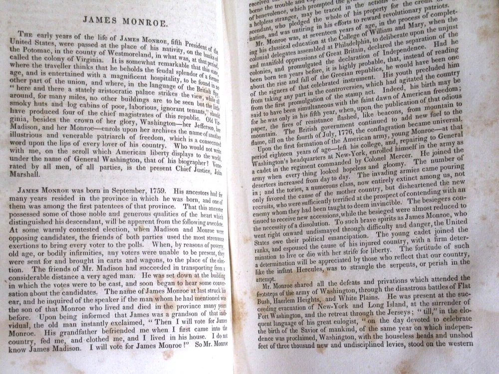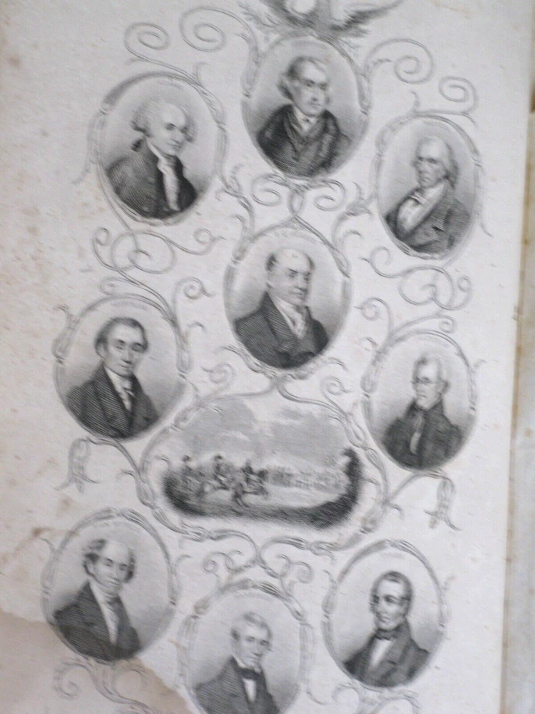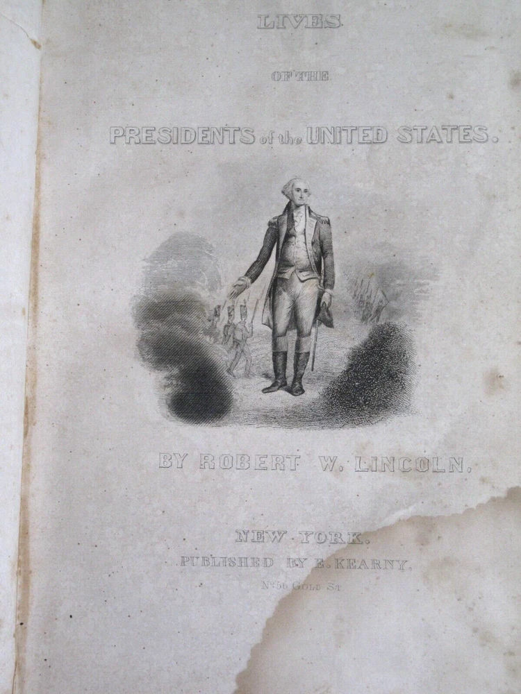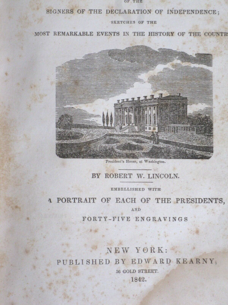 This antique book, titled Lives of The Presidents of The United States with Biographical Notices of the Signers of the Declaration of Independence also has 45 Engravings, and is a fascinating historical piece. It was written by Robert F. Lincoln and published by Edward Kearny in New York in 1842. Presidents covered are Washington through Tyler. Please note in the pictures some water damage in the lower corner of the pages which while prominent in the early pages, lessens and then disappears as pages progress. The text is still very readable. There is minor foxing. The pages and interior bindings are firm and tight. The leather binding and English language make it a valuable addition to any collection, while the subject of biography & autobiography and the topic of historical events make it a must-read for history enthusiasts. Being printed in 1842, adds to its historical significance.