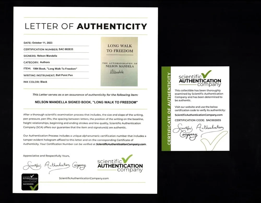 Unveil the Story of Courage with Nelson Mandela’s Autobiography: Nelson Mandela Signed Copy of "Long Walk to Freedom" - The Autobiography of an Epochal Leader. We are profoundly privileged to present a rare and significant piece of political history: a first edition copy of "Long Walk to Freedom," signed by the late Nelson Mandela. This autobiography is not just literature; it is an intimate journey through the life of one of the most emblematic figures of the 20th century, a testament to resilience, and a narrative that altered the dialogue on human rights and freedom. Item Details: Title: "Long Walk to Freedom", Author: Nelson Mandela, Publication Date: 1994, Autograph: Nelson Mandela, Condition: Preserved in near mint condition, with an intact dust jacket. Historical Significance: "Long Walk to Freedom" chronicles Nelson Mandela's life from his early years in a rural village to his inauguration as the first democratically elected President of South Africa. Mandela's autograph transforms this first edition into a unique embodiment of historical importance. Each page brings to life the struggle against apartheid and the pursuit of racial equality - themes that resonate powerfully to this day. In a world that witnessed Mandela's transformative journey from a prisoner to president, this signed edition conveys a profound message of hope and reconciliation.