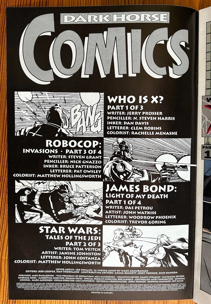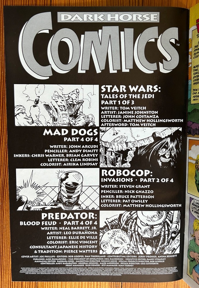 This listing is for FOUR (4) DARK HORSE COMICS comic books; issues #7 - #10 . Published by Dark Horse Comics in 1993 . These comics are in good to great condition. See photos. Star Wars: Tales of the Jedi Written by Tom Veitch. Art by Janine Johnston. Lettered by John Costanza. Colored by Matthew Hollingsworth. Afterword by Tom Veitch. Mad Dogs Written by John Arcudi. Pencilled by Andy Dimitt. Inked by Chris Warner and Brian Garvey. Lettered by Clem Robins. Colored by Airika Lindsay. Robocop: Invasions Written by Steven Grant. Pencilled by Nick Gnazzo. Inked by Bruce Patterson. Lettered by Pat Owsley. Colored by Matthew Hollingsworth. Predator: Blood Feud Written by Neal Barrett, Jr. Art by Leo Duranona. Lettered by Ellie de Ville. Colored by Eric Vincent. Consultant for Japanese History and Tradition: Pierce Watters. Who is X? Written by Jerry Prosser. Pencilled by N. Steven Harris. Inked by Dan Davis. Lettered by Clem Robins. Colored by Rachelle Menashe. James Bond: Light of my Death Written by Das Petrou. Artist by John Watkiss. Lettered by Woodrow Phoenix. Colored by Trevor Goring. Godzilla: Blast from the Past Written by Randy Stradley. Pencilled by Bobby Rubio. Inked by Brian Garvey. Lettered by Clem Robbins. Colored by Matt Hollingsworth. Predator: The Pride of Nghasa Written by Chuck Dixon. Art by Enrique Alcatena. Lettered by Clem Robins. Colored by Chris Chalenor. Cover Art by Joe Phillips, Wade Grawbadger, Ray Lago and John Watkiss. These comics come bagged and boarded. Bundle with my other listings to save on shipping! I will happily ship all of your winnings in one package. :-)