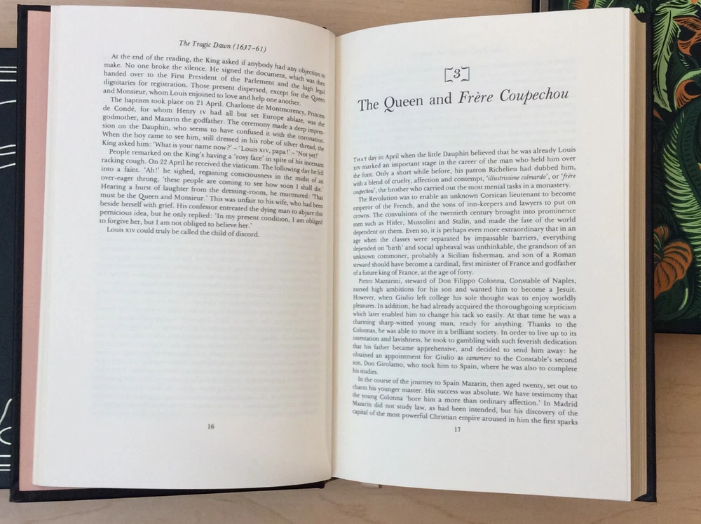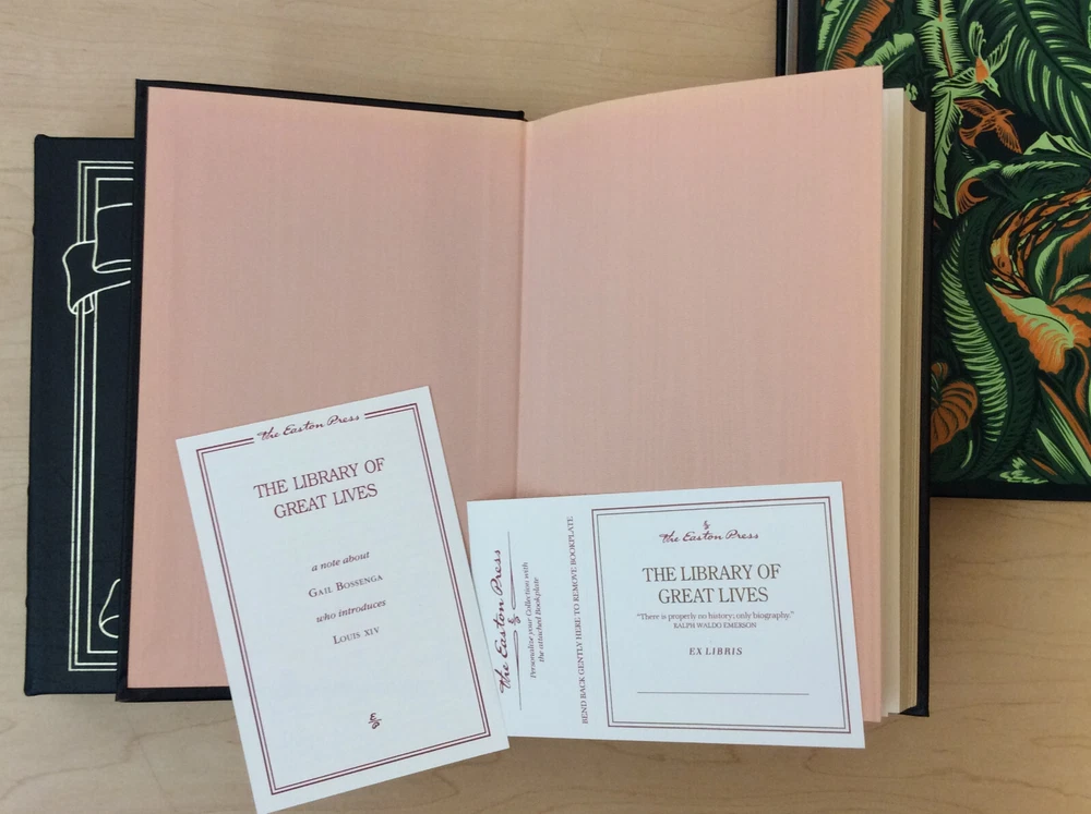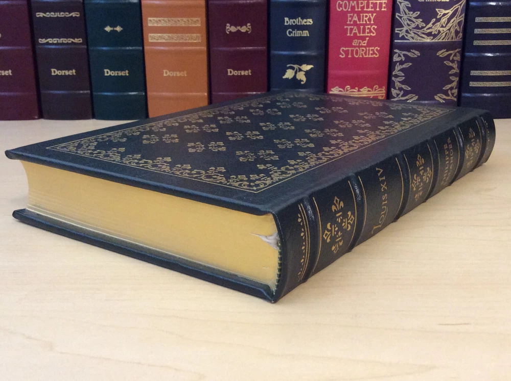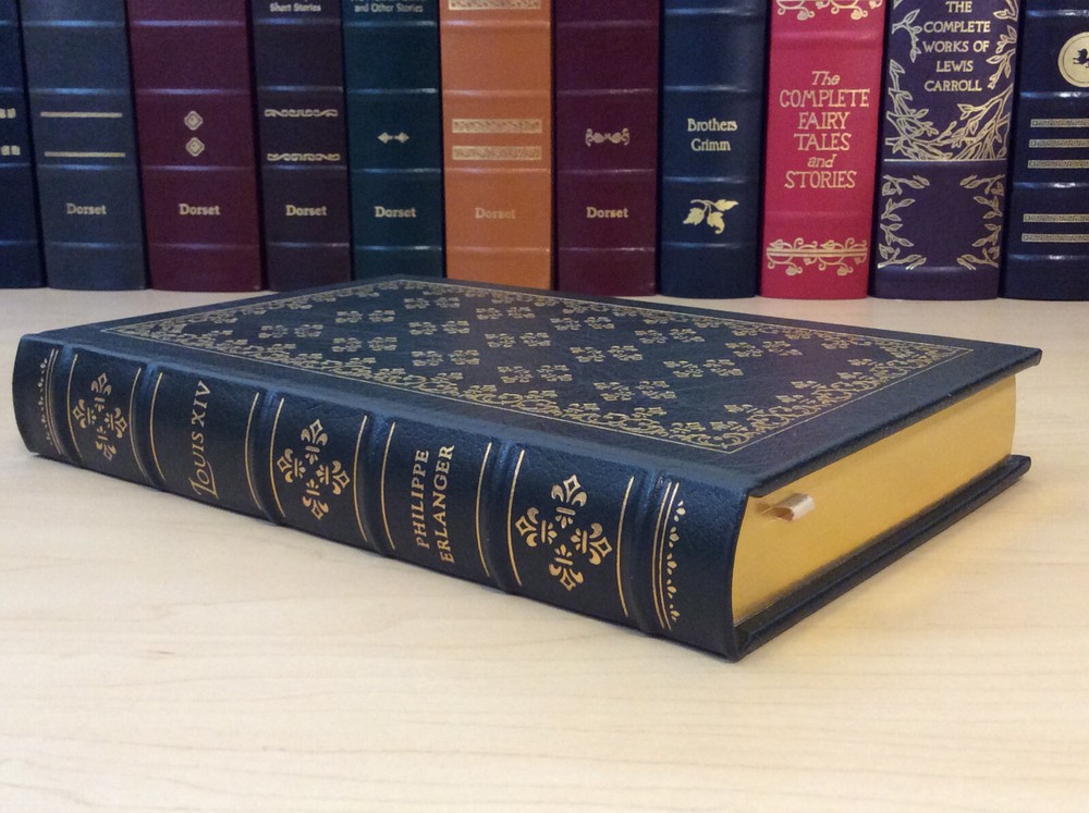 Louis XIV by Philippe Erlanger bound in dark green leather, with gilt edged pages, a ribbon marker and moire endpapers an Easton Press blank loose bookplate is included Item Condition: This is an Easton Press leatherbound, in Very Good condition, there is a loose blank bookplate included. There are no names or stamps of previous owners inside. The binding is tight and the pages are clean. The gilt edging is bright with some minor signs of wear. The leather is in nice condition, with some minor wear. In the photos the color looks dark blue or even black - but in direct sunlight it looks dark green. Dimensions are approx: 9.5" x 6.25" x 1.25" This book will ship in a box with bubble wrap. Photos are of the actual book that will be shipped.
