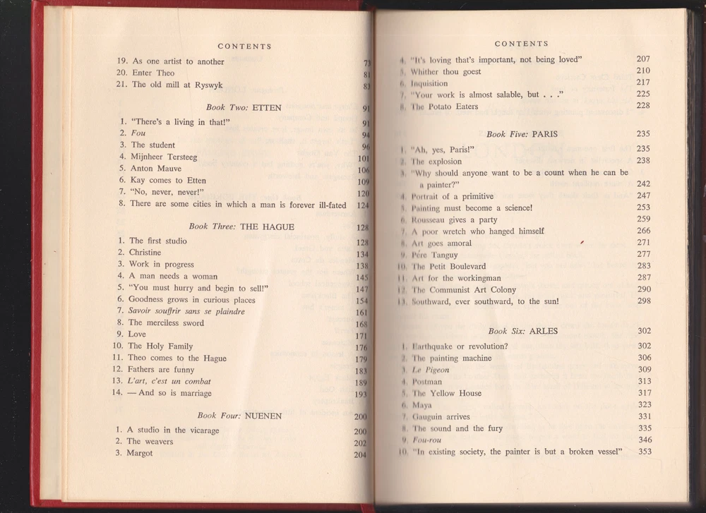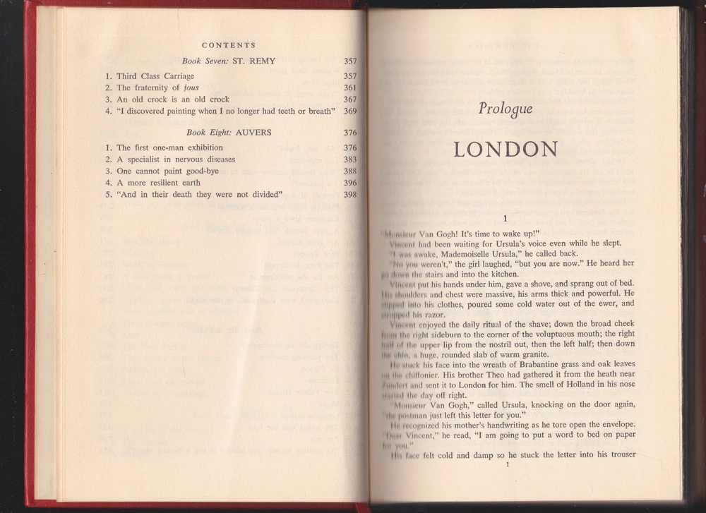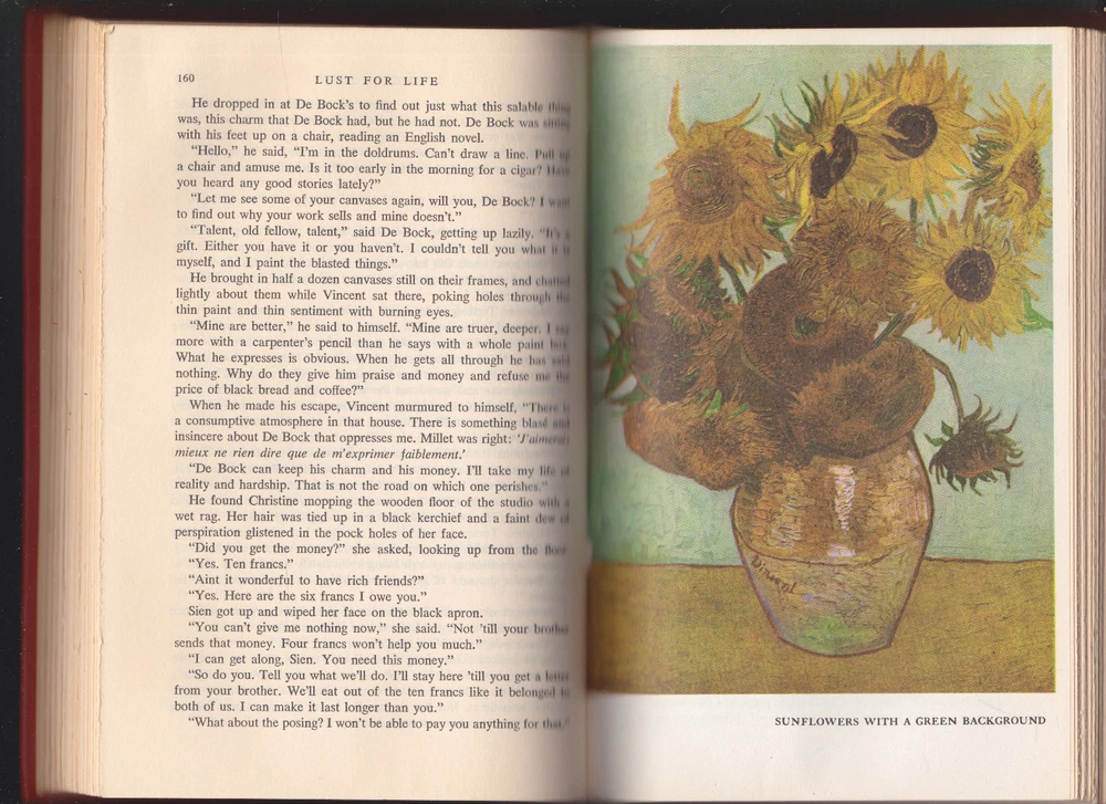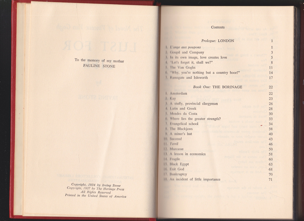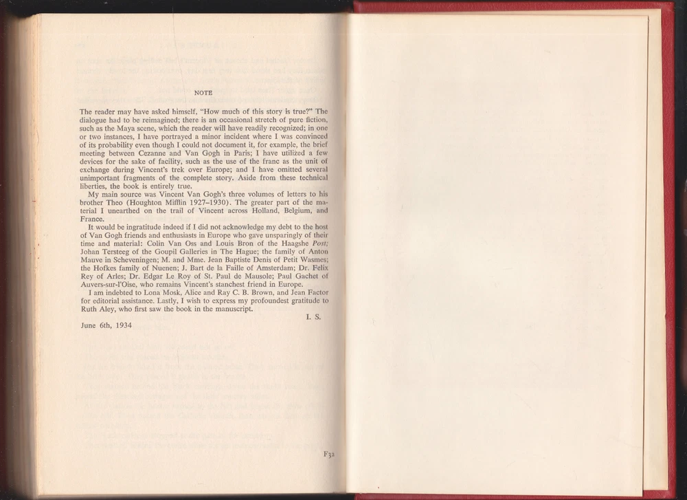 Extremely Rare Out-of-Print Original 1937 Edition. Pages clean, crisp and unmarked. The lightest shelf wear, No tears of the leather. No cover wear. A hint of tanning of the outer pages as expected from time. The gold lining on the top of the book has the lightest wear. Inscribed inner cover in cursive. Images on listing, are of this book. HARDCOVER - LEATHER BOUND_____________ The most famous of all of Stone’s novels, it is the story of Vincent Van Gogh—brilliant painter, passionate lover, and alleged madman. Here is his tempestuous story: his dramatic life, his fevered loves for both the highest-born women and the lowest prostitutes, and his paintings—for which he was damned before being proclaimed a genius. The novel takes us from his desperate days in a coal mine in southern Belgium to his dazzling years in the south of France, where he knew the most brilliant artists (and the most depraved whores). Finally, it shows us Van Gogh driven mad, tragic, and triumphant at once. No other novel of a great man’s life has so fascinated the American public for generations.