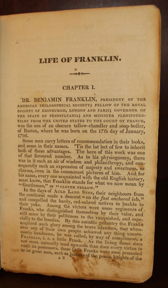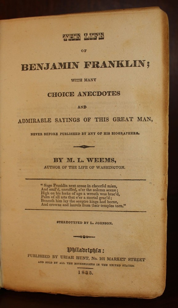 The Life of Benjamin Franklin Author: M. L. Weems Title: The Life of Benjamin Franklin Publication: Philadelphia: Uriah Hunt, 1835 Description: This book measures approximately 7" x 4.25", with 239 numbered pages. This book is in very good minus condition. Moderate wear and staining to the full leather binding. Circular cup ring visible on the front board. Both hinges are cracked. Handwriting on front and rear pastedowns and endpapers. Scattered foxing throughout. "The Life of Benjamin Franklin" was written by Weems, an American minister, evangelical bookseller, and author who also wrote the first biography of George Washington. He is most famous for his stories about Washington - specifically the cherry tree tale. Please view the many other rare titles available for purchase at our store. We are always interested in purchasing individual or collections of fine books. Inventory # (N1-14). Seller ID: 3648 Subject: Autobiography/Biography/Memoir , Non-Fiction Ernestoic Books Terms All orders ship within two business days. Standard mail is USPS Media Mail. Expedited and international shipping are also available. We offer combined shipping on multiple orders. All items are guaranteed to be as described or they may be returned within 30 days of receipt for a full refund. This listing was created by Bibliopolis.