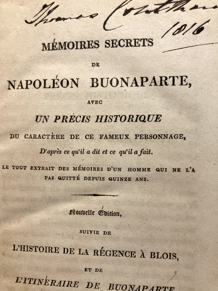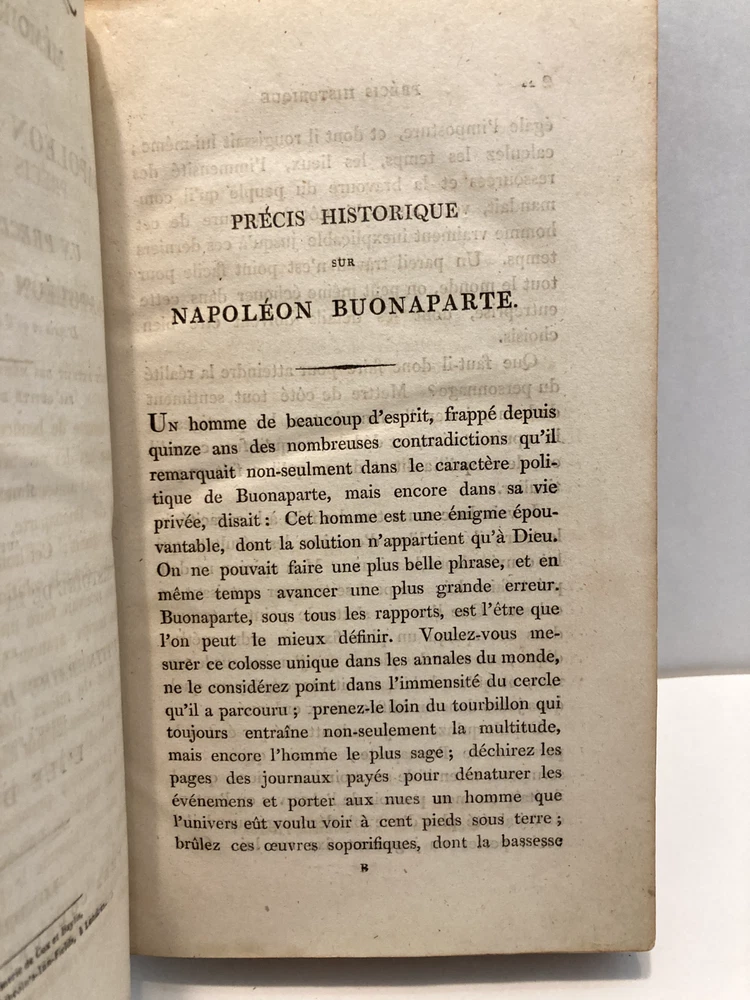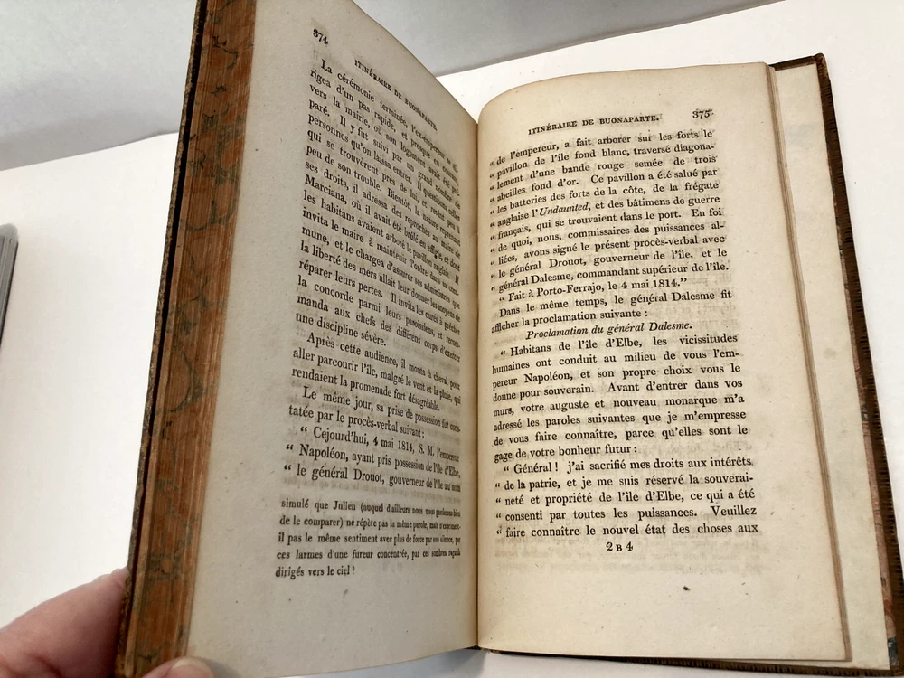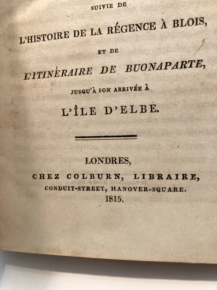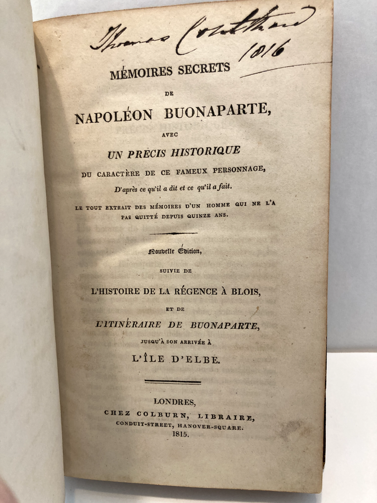 This Book Is In French.This rare and culturally important antiquarian book is "new edition" published in 1815 in London by Chez Colburn, Libraire, Conduit-Street, Hanover-Square. New edition probably means a 2nd edition of sorts. It is bound in leather with decorative tooling and gilding on the edges and spine. End papers are marbleized. The edge of the front cover along the spine is cracked and leather on the spine has some flaking. The boards have been reattached--presume that they will easily come off again. A previous owners signature is at the top of the title page. See pictures. From title page: Secret memoirs of Napoleon Buonaparte, with a historical summary of the character of this famous personage, according to what he said and what he did. All taken from the memoirs of a man who has not left her for fifteen years. The history of the regency at Blois, and of Buonaparte's itinerary, until his arrival at the island of Elba.