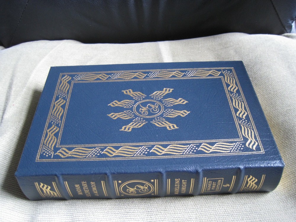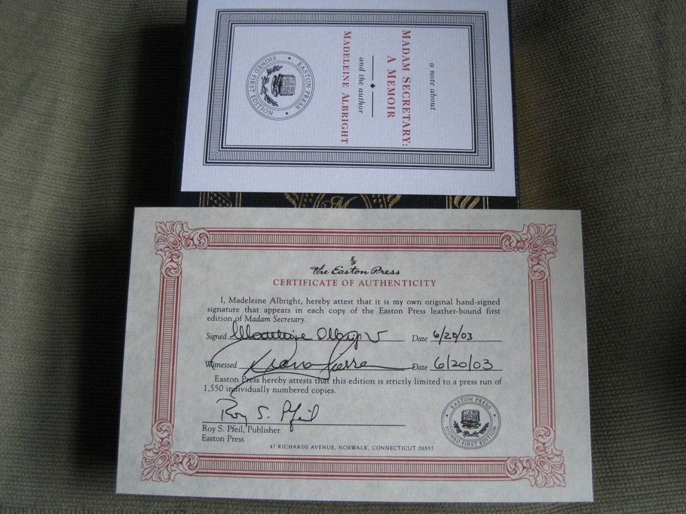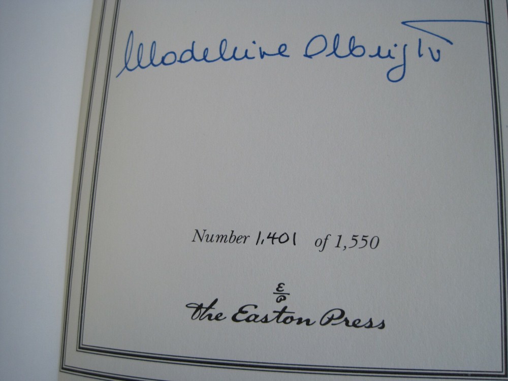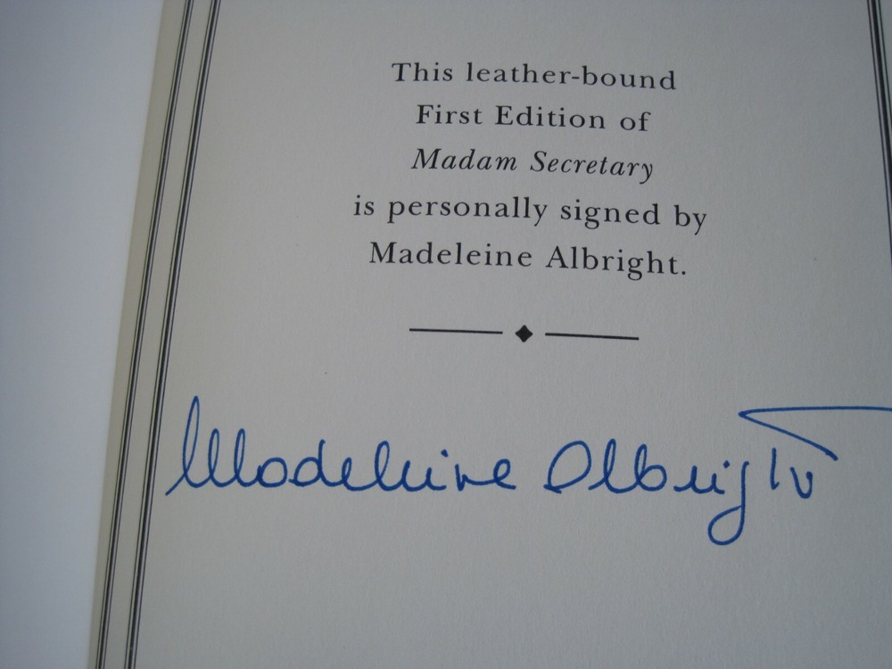 This is a leather bound signed numbered first edition of former Secretary of State Madeleine Albright's best-selling memoir - "Madam Secretary - A Memoir". A national bestseller, Madam Secretary is a riveting account of the life of America's first woman Secretary of State, Madeleine Albright. For eight years, during Bill Clinton's two presidential terms, Albright was a high-level participant in some of the most dramatic events of our time—from the pursuit of peace in the Middle East to NATO's intervention in the Balkans to America's troubled relations with Iran and Iraq. In this thoughtful memoir, one of the most admired women in U.S. history reflects on her remarkable personal story, including her upbringing in war-torn Europe and the balancing of career and family responsibilities, and on America's leading role in a changing world. The book is new, unread, and in great condition. It includes the signed and dated certificate of authenticity and the publisher's note card. Signed by the author on the limitation page. This is book number 1401 of only 1550 copies ever printed of this limited first edition. Easton Press books are the golden standard in the publishing industry, highly collectible and lasting generations. Easton Press Full Genuine Leather Dubbed Spine Accented Wit 22 kt. Real Gold Satin Ribbon Page Marker Distinctive Cover Design Gilded Page Edges To Protect Against Humidity High Quality Acid - Free paper Smyth-Sewn Pages Silk-Moire Endleaves I combine multiple items for savings on shipping charges. I ship worldwide. Please ask about international shipping charges and/or different shipping options.Thank you!