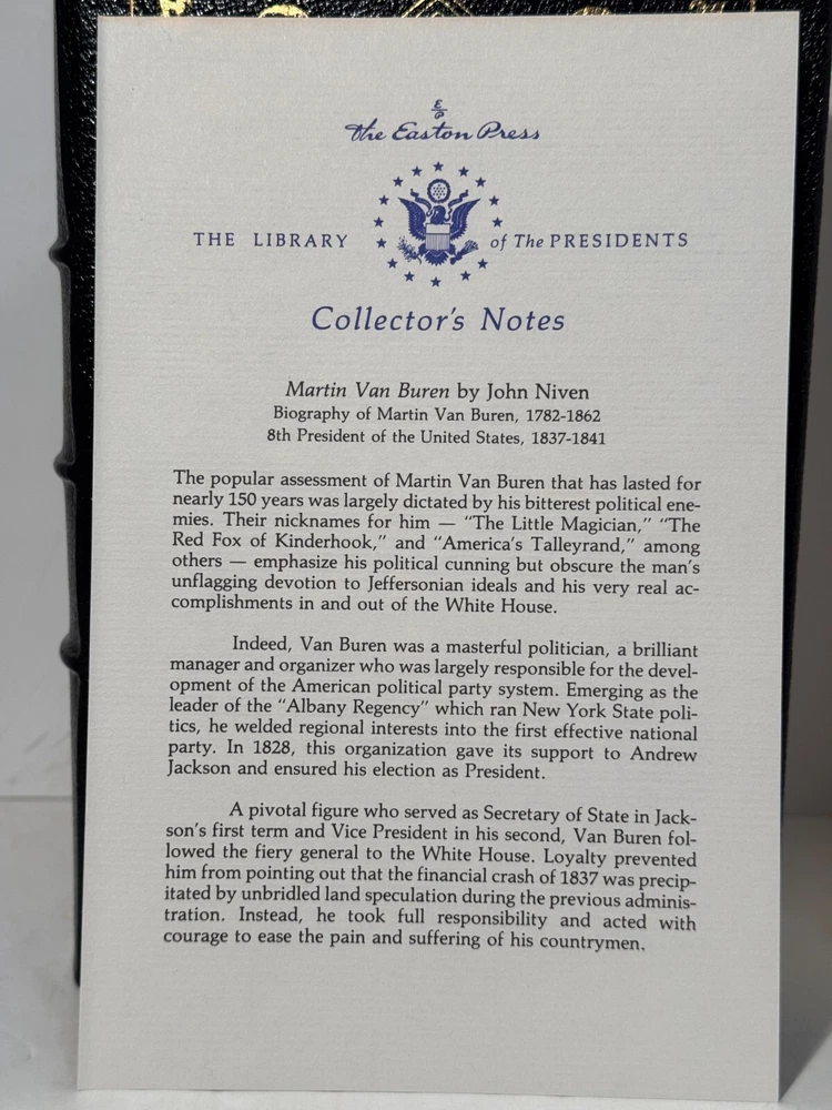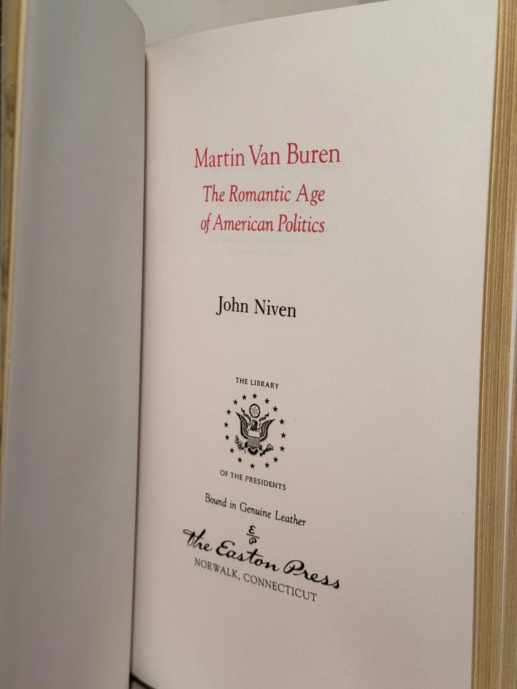You are bidding on a very fine copy of a 1st Edition, 1st Printing of the Easton Press' THE LIBRARY OF THE PRESIDENTS series edition of John Niven's MARTIN VAN BUREN - THE ROMANTIC AGE OF AMERICAN POLITICS. This is a one-volume edition about the life and times of one of the less-talked-about Presidents, Martin Van Buren. Bound in beautiful genuine moroccan cowhide leather, the book features raised bars on the spine, gold tooling on the cover and spine, End-pages decorated with the seals of the U.S. Presidents, satin silk sewn-in bookmark, 22k gold dust on page ends on all 3 sides. Printed on archival quality acid-neutral paper, that will last for generations without diminishing in quality or looks. INCLUDES ORIGINAL, LIBRARY OF THE PRESIDENTS INSERT. LIMITED, COLLECTOR'S EDITION FROM THE SERIES OF THE LIBRARY OF THE PRESIDENTS. Free Shipping in all of Continental United States. All other buyers, please check with me for shipping rates before bidding. ***NOTE: If you are dissatisfied with your purchase for any reason, please contact me first directly, and I will do all in my power to make sure you are satisfied with your purchase. *** See my other listings. I have a large collection of rare and collectible books, most leatherbound, others of first edition, first printing, even unpublished manuscripts. I will combine them during shipping so you can receive them together. Just message me your intent to buy more than one book, and I will hold them to be shipped together. Abell Happy Buying!