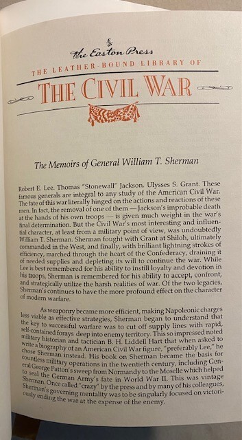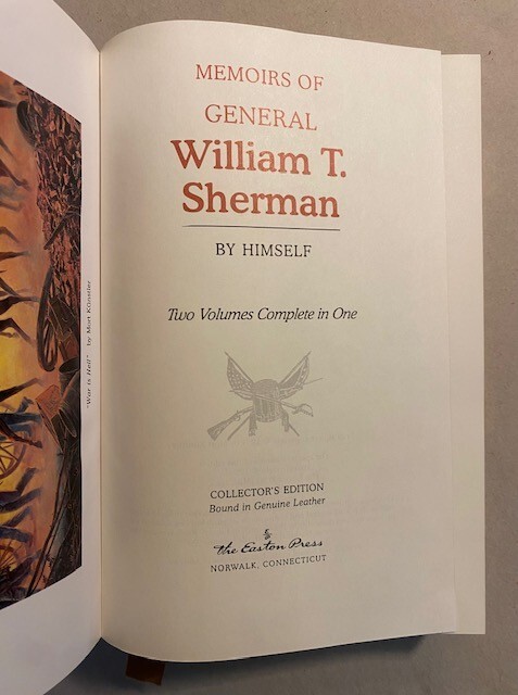 MEMOIRS of GENERAL WILLIAM T. SHERMAN: Two Volumes Complete in One, by Himself (William T. Sherman)- Published by The Easton Press, Norwalk, Connecticut- 1996- FIRST 'EASTON PRESS' EDITION/ COLLECTOR'S EDITION- This is NOT an ex-library book or reprint edition- BINDING is 'GENUINE LEATHER' HARDCOVER with titles and ornate decorations in gold on front and back covers and spine; binding and text are exceptionally neat, clean, bright and solid, NEAR FINE. From the EASTON PRESS collection, the page edges are GOLD GILT, and the BEAUTY of the BOOK is enhanced by its RIBBON MARKER and MOIRE ENDLEAVES (SILK END-PAPERS).... 409 pages with COLOR ILLUSTRATED FRONTIS of a PAINTING 'War is Hell,' by Mort Kunstler, and B&W ILLUSTRATIONS, timetables, throughout. Beautiful COLLECTOR'S EDITION of ' MEMOIRS of GENERAL WILLIAM T. SHERMAN ,' by GENERAL WILLIAM T. SHERMAN in NEAR FINE condition. LEATHER HARDCOVER with. GOLD GILT titles, GOLD textblock, satin ribbon, satin endpapers. AMERICANA, AMERICAN HISTORY, WAR, MILITARY, PRESIDENTS of the UNITED STATES, MILITARIANA, CIVIL WAR. Published by specialty press EASTON PRESS, Connecticut in a SPECIAL COLLECTOR'S EDITION. Our family business takes pride in serving our customers with utmost care- carefully packaging and promptly shipping in cardboard boxes with Delivery Tracking Confirmation. Thank you for supporting a family owned and operated business in the United States.