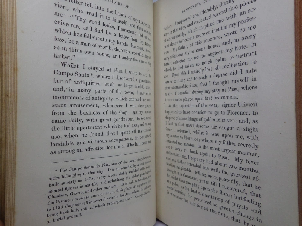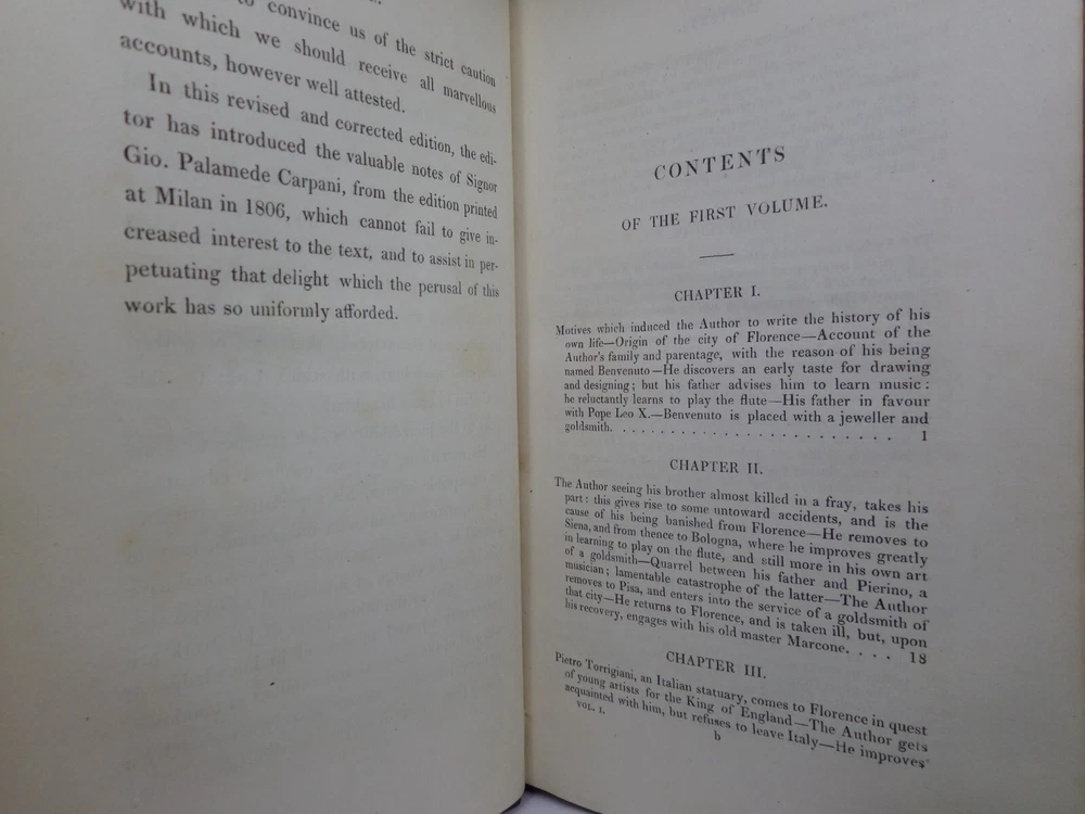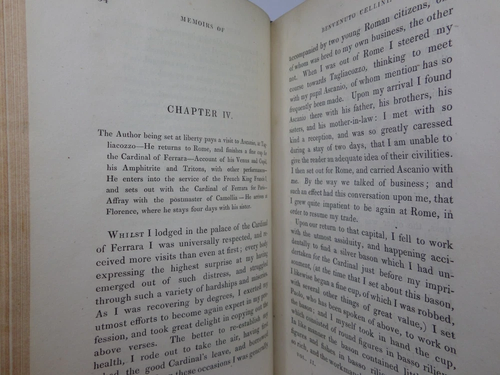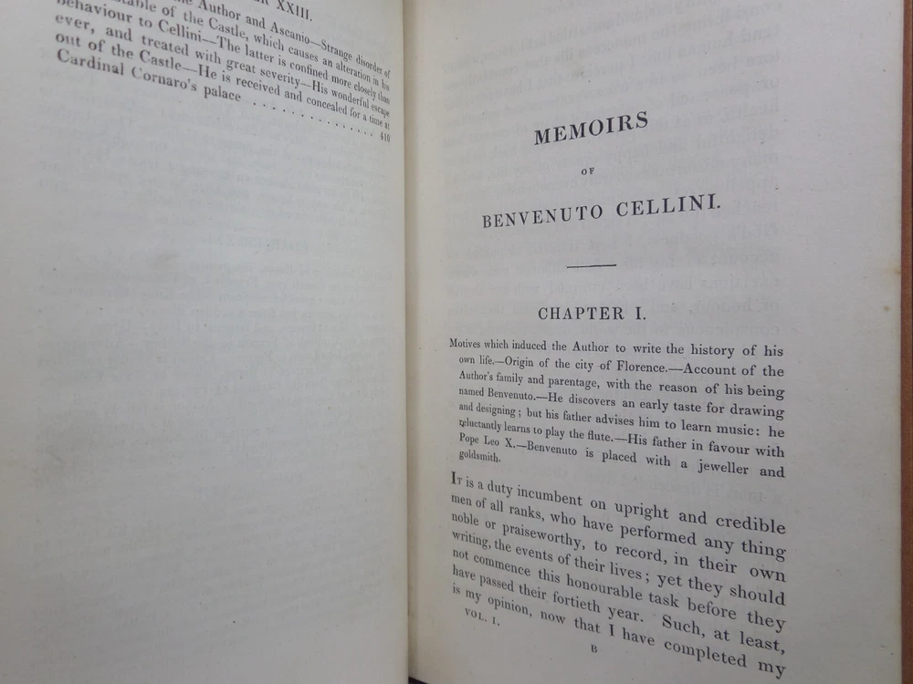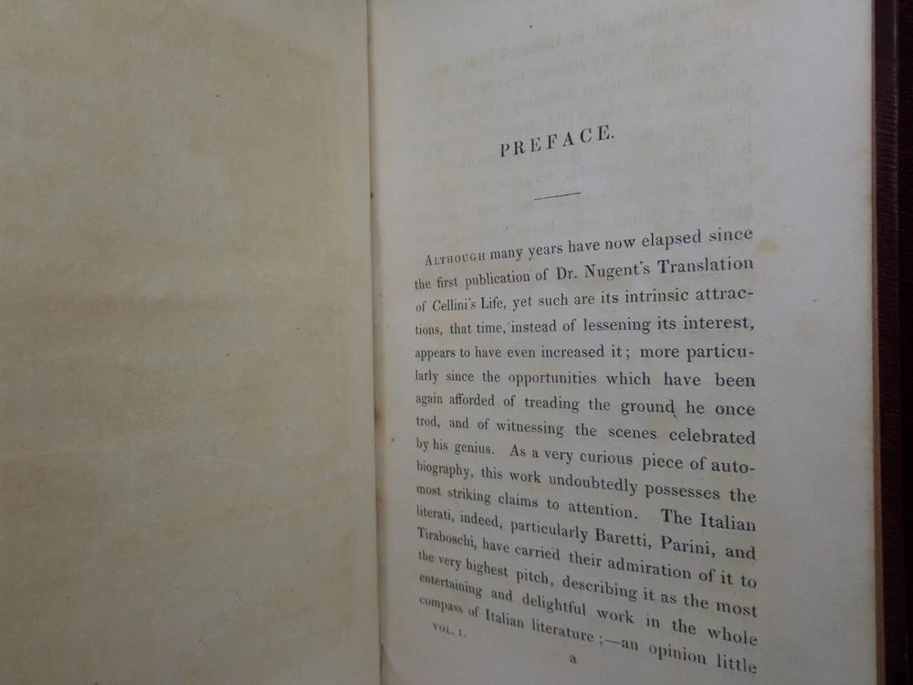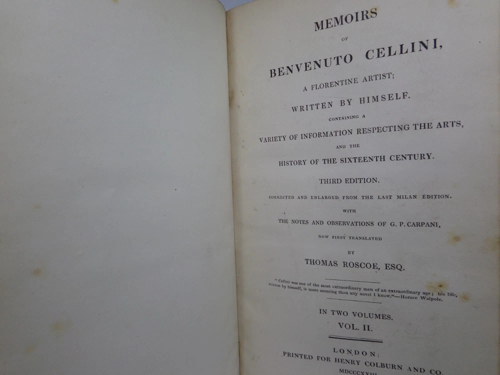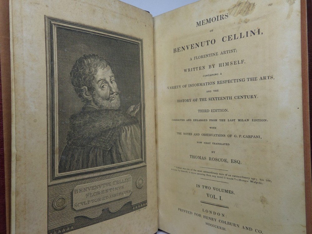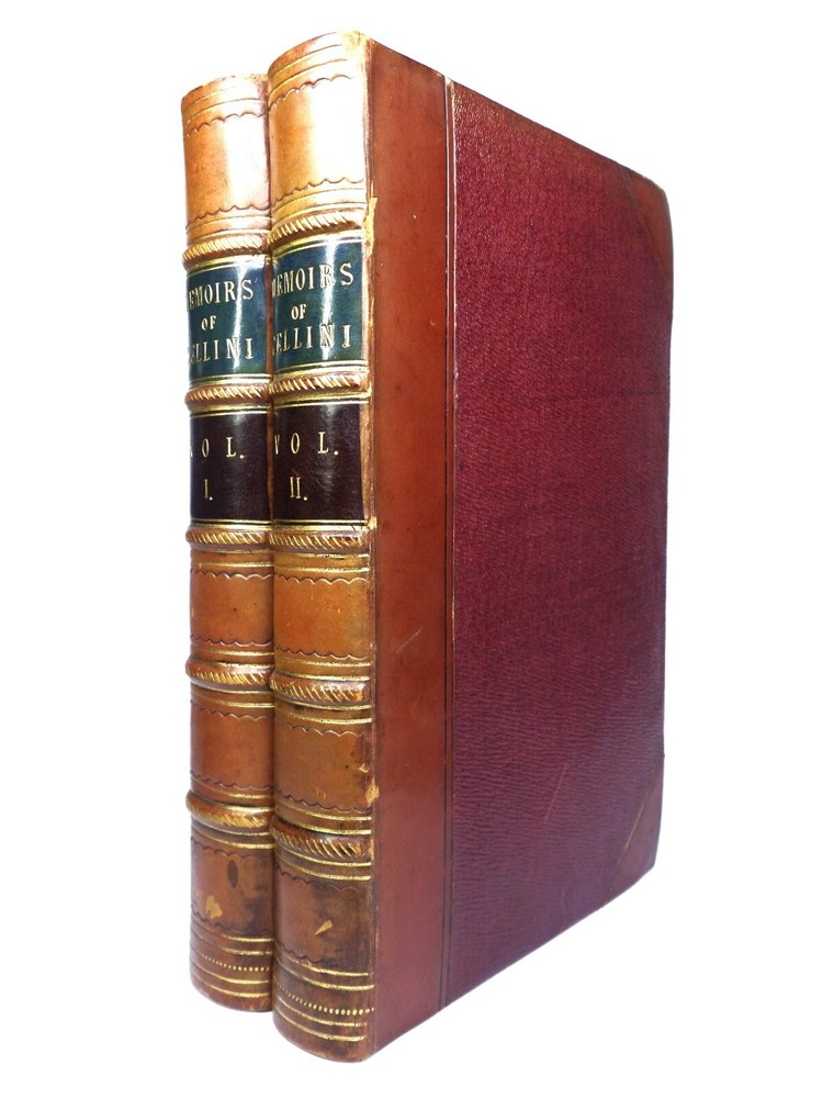 [CELLINI, Benvenuto]. Memoirs of Benvenuto Cellini, a Florentine Artist; Written by Himself. Containing a Variety of Information Respecting the Arts, and the History of the Sixteenth Century. With the Notes and Observations of G. P. Carpani, now First Translated by Thomas Roscoe. London Henry Colburn, MDCCCXXIII. [1823]. Third edition, corrected and enlarged from the last Milan edition; complete in two volumes, leather-bound, hardcover, octavo (21cm x 13.5cm), pp. xvi, 428; xi, 428. English text, translated from Italian by Thomas Roscoe. Bound in contemporary half-calf, spine gilt with contrasting morocco lettering-pieces; volume 1 with a portrait frontispiece; printed foot-notes throughout. Printed by S. and R. Bentley. Condition: VERY GOOD. Binding tight and secure with the hinges and joints intact, some light rubbing to extremities. The interiors with some very light intermittent scattered foxing, the title-page and frontispiece toned. A handsome set. International tracked shipping - dispatched promptly and securely. Please view my other rare books.