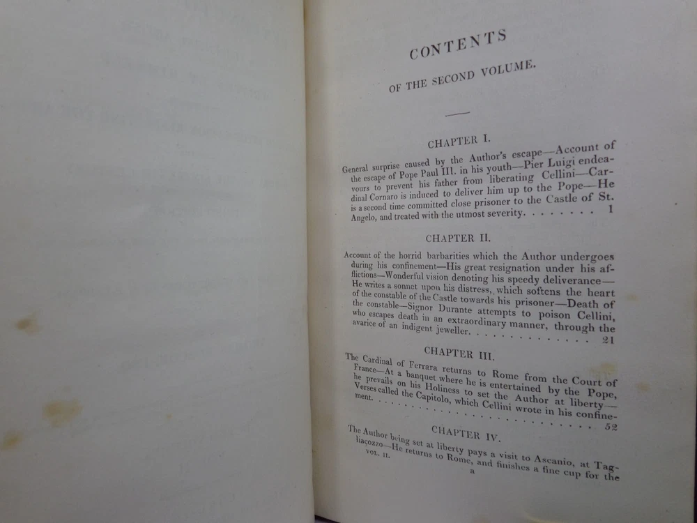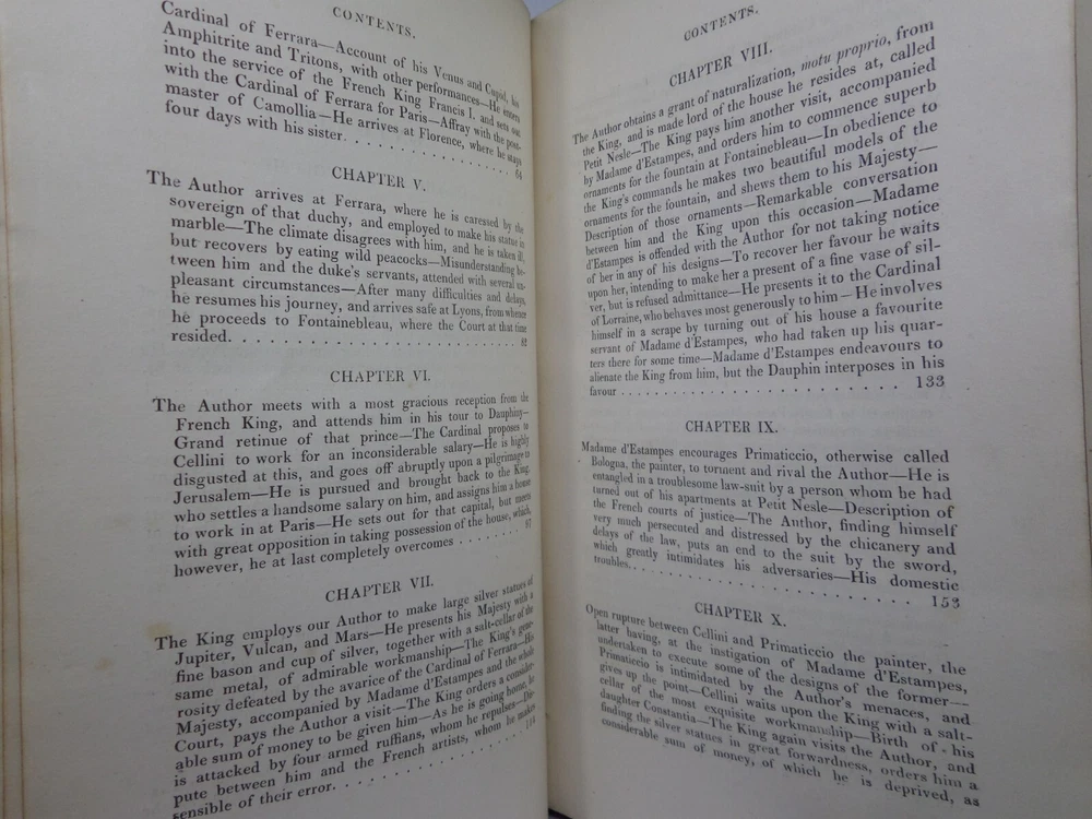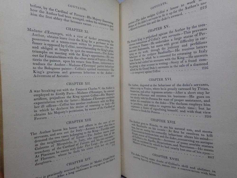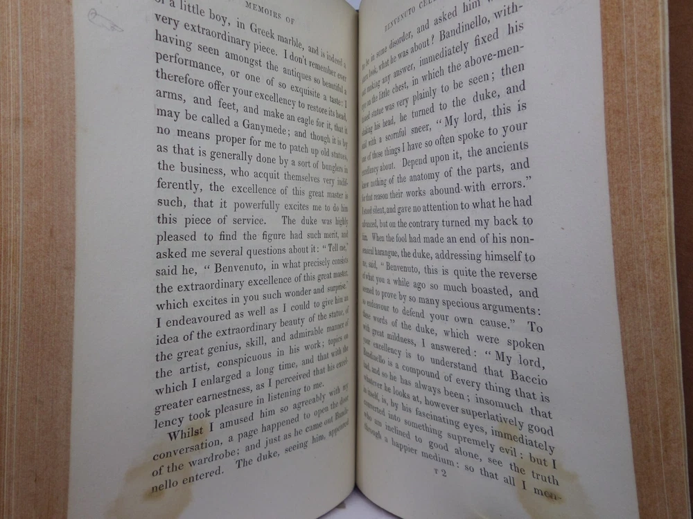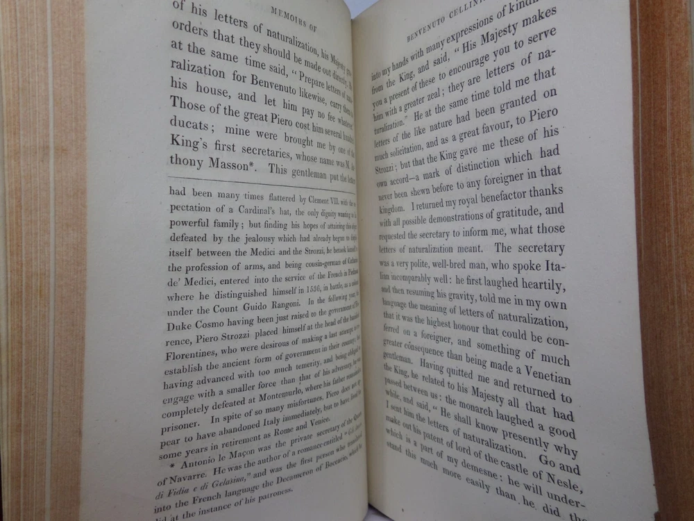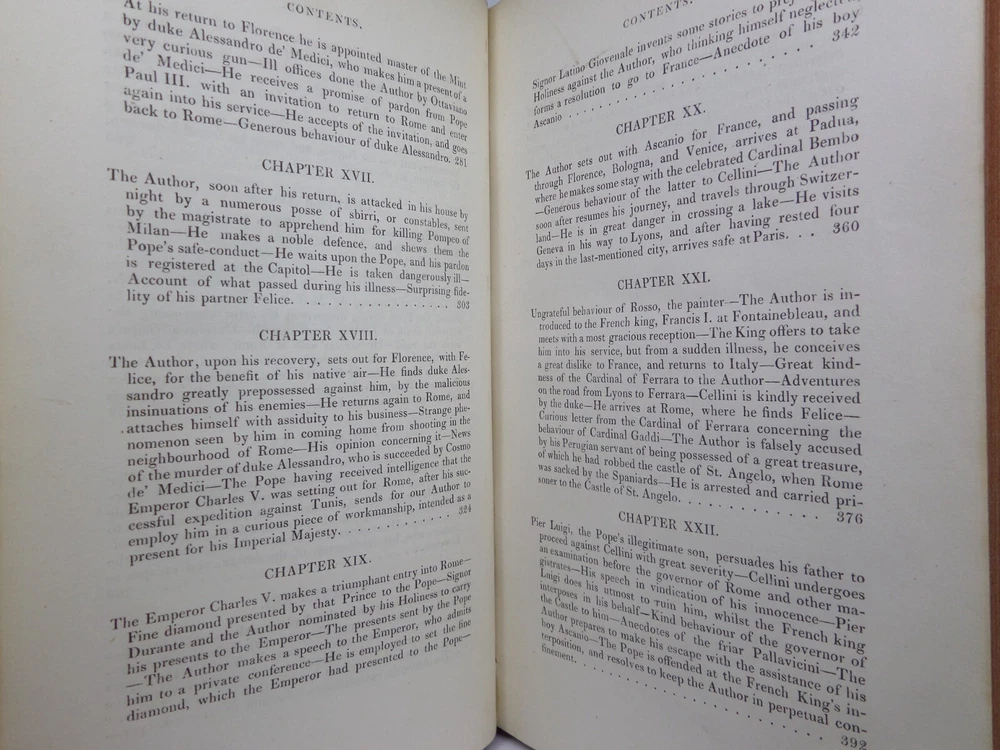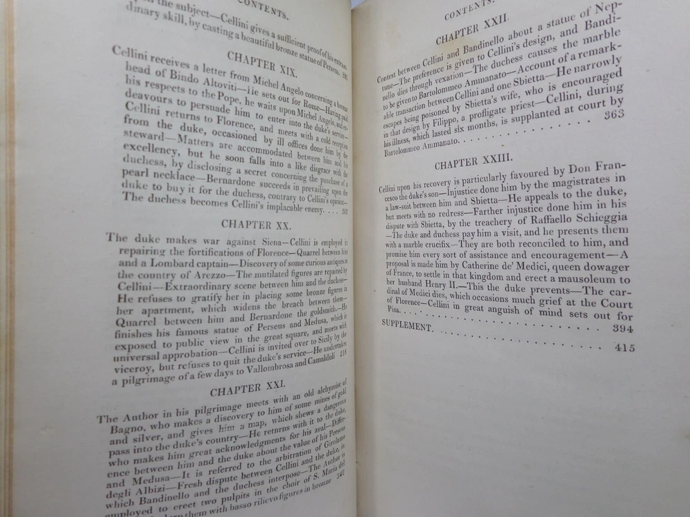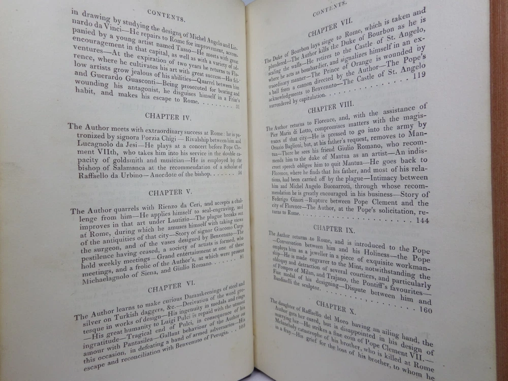 [CELLINI, Benvenuto]. Memoirs of Benvenuto Cellini, a Florentine Artist; Written by Himself. Containing a Variety of Information Respecting the Arts, and the History of the Sixteenth Century. With the Notes and Observations of G. P. Carpani, now First Translated by Thomas Roscoe. London Henry Colburn, MDCCCXXIII. [1823]. Third edition, corrected and enlarged from the last Milan edition; complete in two volumes, leather-bound, hardcover, octavo (21cm x 13.5cm), pp. xvi, 428; xi, 428. English text, translated from Italian by Thomas Roscoe. Bound in contemporary half-calf, spine gilt with contrasting morocco lettering-pieces; volume 1 with a portrait frontispiece; printed foot-notes throughout. Printed by S. and R. Bentley. Condition: VERY GOOD. Binding tight and secure with the hinges and joints intact, some light rubbing to extremities. The interiors with some very light intermittent scattered foxing, the title-page and frontispiece toned. A handsome set. International tracked shipping - dispatched promptly and securely. Please view my other rare books.