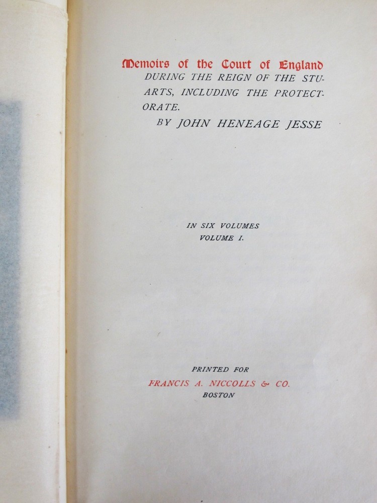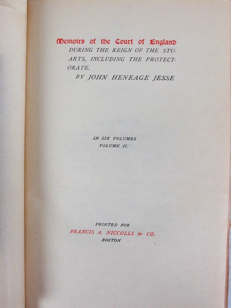 WELCOME TO MY AUCTION YOU ARE VIEWING Memoirs of The Court of England During the Reign of the Stuarts Including the Protectorate by John Heneage Jessee Francis A. Niccolls Co. Boston Edition De Luxe #340/1000 Copies More Pictures Below Item Description: " Memoirs of the Court of England During the Reign of the Stuarts Including the Protectorate " by John Heneage Jesse. Volumes I and II (of 6) Published by Francis A. Niccolls Co., Boston, Edition De Luxe. Number 340 of 1,000 Copies. Condition: Good. Armoral bookplate to the front pastedowns. The boards are clean and tight. There is wear/chipping to the corners and spine ends. Vol. II has a split on the front board, but is fully attached. The binding and hinges are solid and tight. The pages are clean and unmarked. There is no writing or markings, no foxing. No torn or missing pages. An excellent addition to a library or collection. Hardcover. Three-quarter red morrocco leather over marbled boards, 5 raised bands to the spines with gilt lettering. Top edge gilt. Marbled endpapers. Frontispiece, 13 full-page engravings with captioned tissue guards. 323, 336 pages. 6 1/8 x 9" tall. Sketches of the principal personages and of the social details of various periods in the history of England. An excellent addition for a library or collection. Contents Vol. I. James I; Anne of Denmark, Queen of James I; Henry, Prince of Wales; Elizabeth, Queen of Bohemia; Lady Arabella Stuart; Lodowick Stuart, Duke of Richmond; Frances Howard, Duchess of Richmond; Mary Villiers, Countess of Buckingham; Thomas Sackville, Earl of Dorset; Robert Cecil, Earl of Salisbury; Robert Carr, Earl of Somerset; Frances Howard, Countess of Somerset; Henry Howard, Earl of Northampton. Volume II. William Herbert, Earl of Pembroke; Philip Herbert, Earl of Pembroke and Montgomery; Mary, Countess of Pembroke; James Hay, Earl of Carlisle; Francis, Lord Bacon, Viscount St. Albans; Edward, Lord Herbert of Cherbury; Archee, the Court Fool; Charles I; Henrietta Maria. Buy with confidence... Fast Shipping--Includes Free Delivery Confirmation and Insurance. We have 18 years experience selling on Ebay and maintain 100% Feedback. Please Check out my other items ! Be sure to add me to your favorites list ! Condition Glossary: MINT - as new FINE - clean and with no wear but not as crisp as mint NEAR FINE - clean with only minimal shelf wear - no writing or tears VERY GOOD - clean with light shelf wear, possible owner's name, any marks or tears are disclosed GOOD - worn edges and corners, possible smudges or markings inside, edge tears, FAIR - more wear than "good", not attractive at all but still solid enough to read EX-LIBRARY - Any book listed as ex-lib may contain the following flaws: front free endpaper removed, library card pocket, jacket glued to the endpapers, tape and sticker residue, other library notations, discard stamps, etc. We accept Paypal only. Payment is due within 5 days of the close of Auction. We Offer: Domestic Media Mail, Priority, FedEx, and Priority International We Offer: USPS Domestic and International Shipping We Ship 5 Days a Week. Monday-Friday Free Delivery Confirmation--Confirmation Number will be automatically emailed to you as soon as your shipping label is printed. Cross-border buyers are responsible for any customs, duties, etc. imposed by the buyer's home country. RETURNS : Returns are accepted. While every effort is made to accurately describe every item minor flaws may not always be noted. Please review the description and condition of an item prior to bidding. If you have any questions please do not hesitate to Email us. REFUNDS: You may return your item for a full refund within 30 days. You are required to ship the item back with insurance and tracking at your own expense. Refunds will be issued in the form in which item was paid. We at Lorikayltd strive for 5 Stars and 100% Feedback. No sale is final until you are satisfied with your purchase. We know you have many choices buying online--and we appreciate your business Auction Template Design © In My Cedar Chest - Unauthorized Duplication Prohibited.