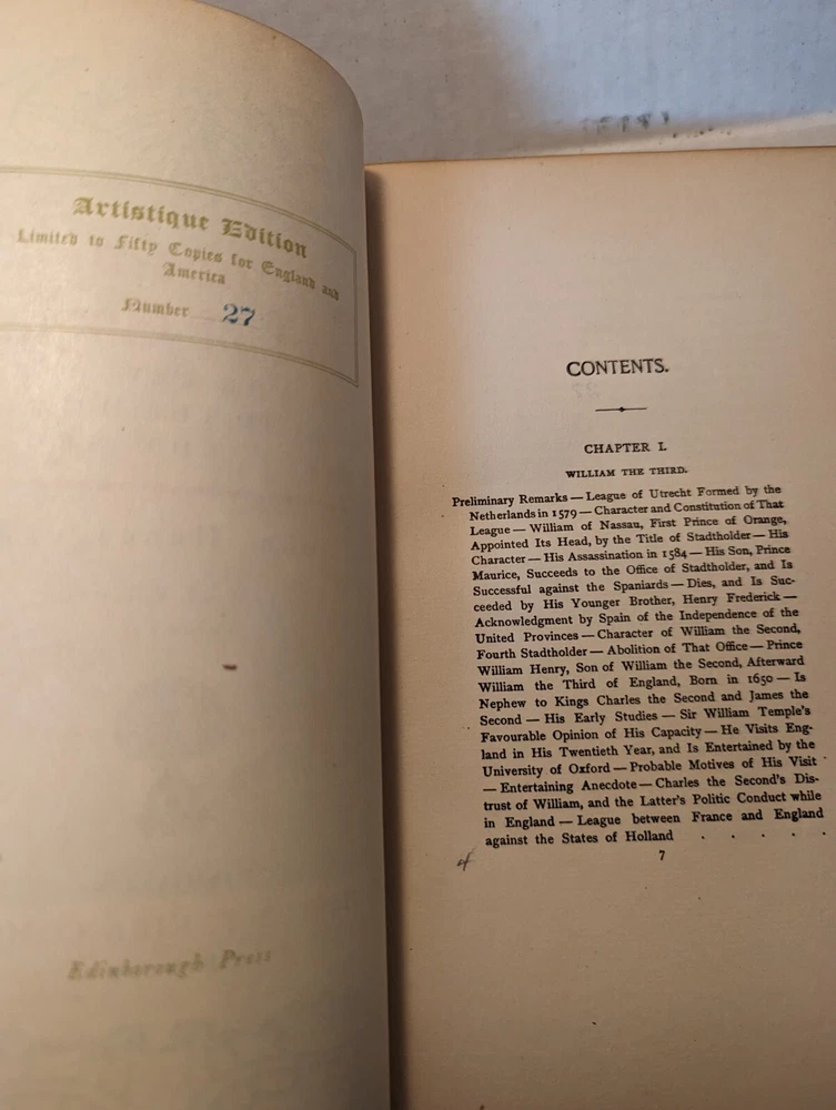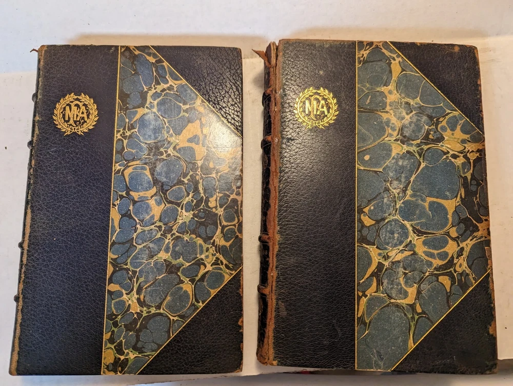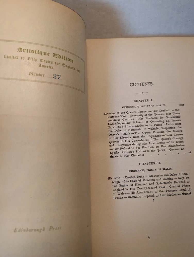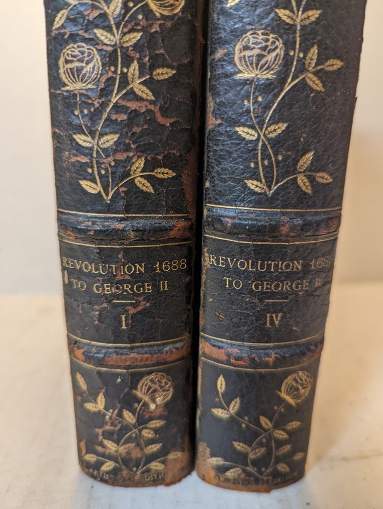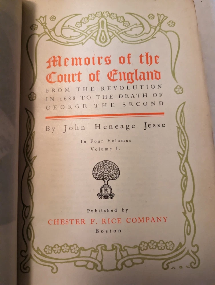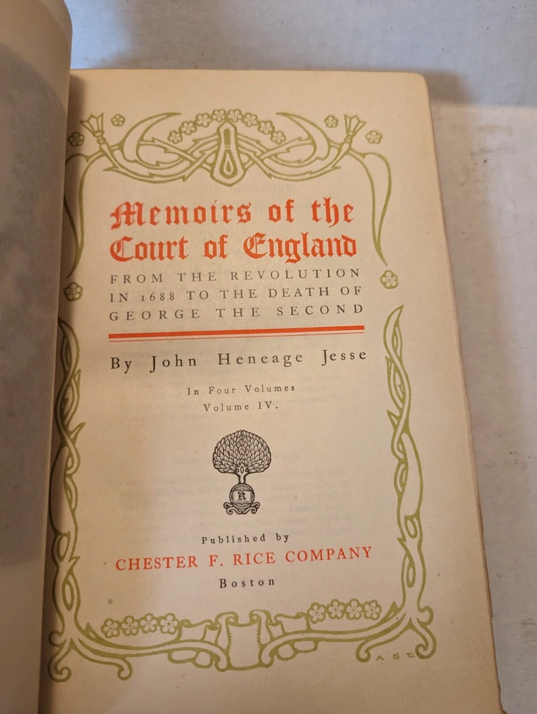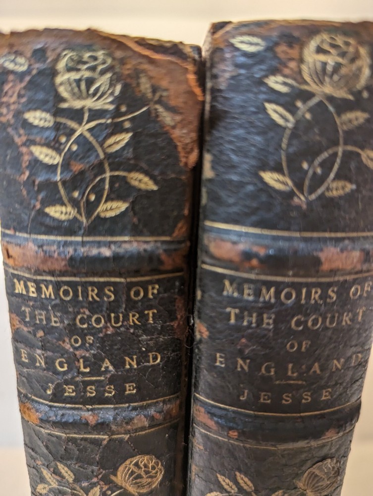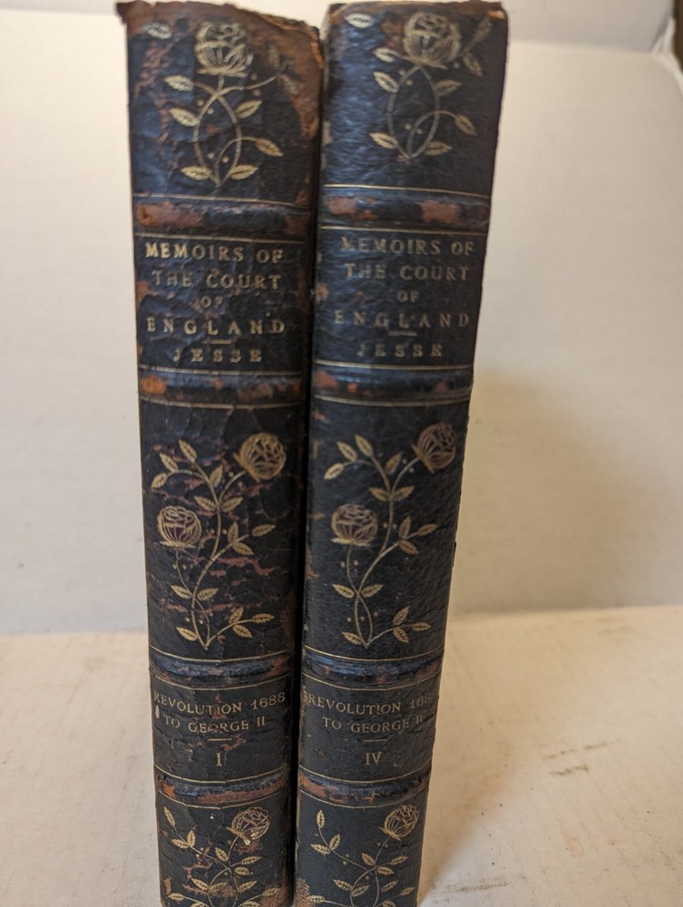 MEMOIRS OF THE COURT OF ENGLAND. Revolution 1688 To George II Vol 1 & IV BY JOHN HENEAGE JESSE. These are #27 out of a printing of 50 copies. The pages are in good condition, no stains or foxing. the book covers have some wear, on volume 1 the front cover has been broken off the binding. See photos.