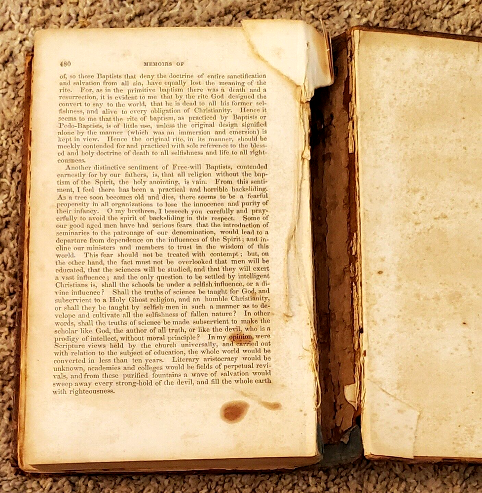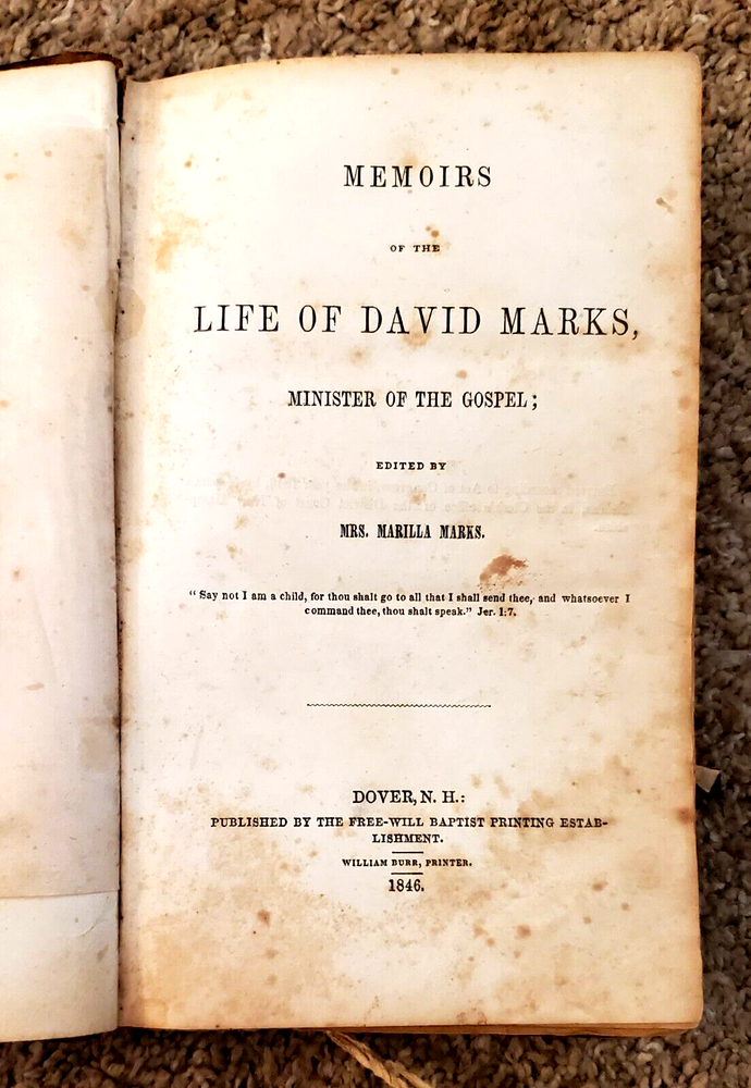 THIS VOLUME ENDS ON P 480 AND I UNDERSTAND IT SHOULD END ON P 516 SO IT IS MISSING 36 PAGES AT THE VERY END. Some used book dealers list a 1831 complete volume for $1000+. This volume is dated 1846 with a copyright date 1846. NOTE: VERY INTERESTING FOR MORMON HISTORY - Marks visited the Mormon center one year after the publication of the Book of Mormon and is the first to offer a critical revieww= "In 1827 David Marks (a non-Mormon minister) went to Palmyra and Manchester, New York where he "made considerable inquiry respecting . . . [Joseph] Smith" and learned from "several persons in different places" that Joseph was "about 21 years [old]; that previous to his declaration of having found the plates he made no pretensions to religion." Marks book is the first to mention Mormonism as a religion. Marks not only mentions Mormonism, but went to Palmyra, New York to investigate the tablets and to speak to the witnesses about the Religion and the Tablets. It offers a very unique perspective of religion in the eastern United States during his life time. He is buried in Oberlin, Ohio.