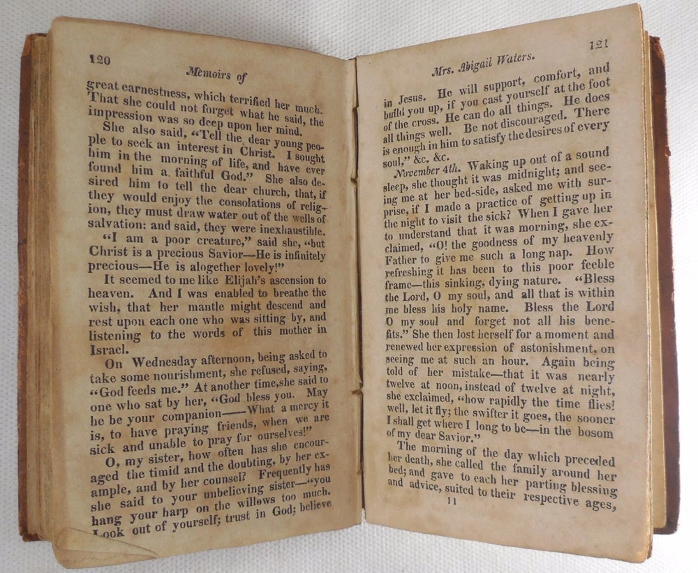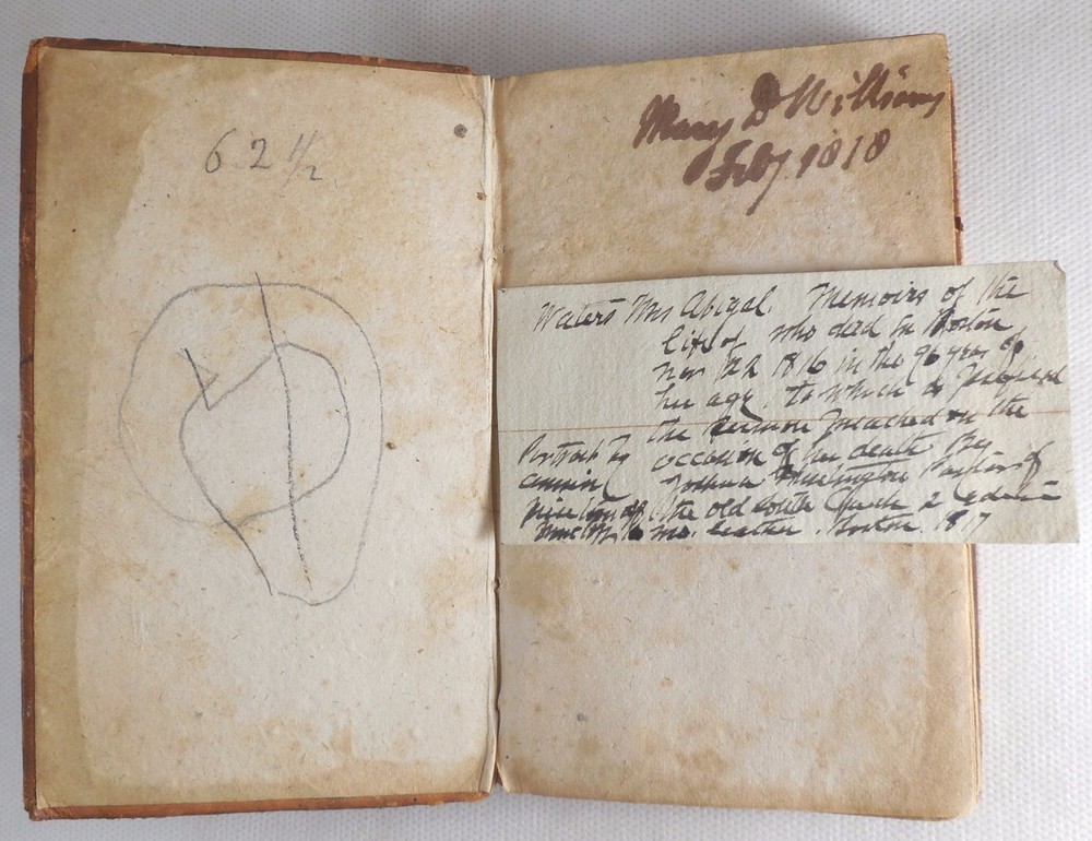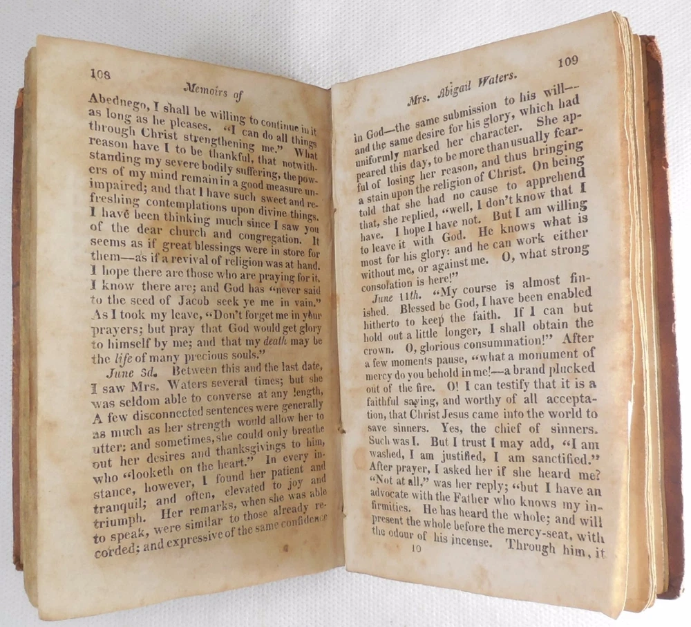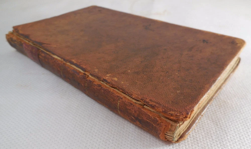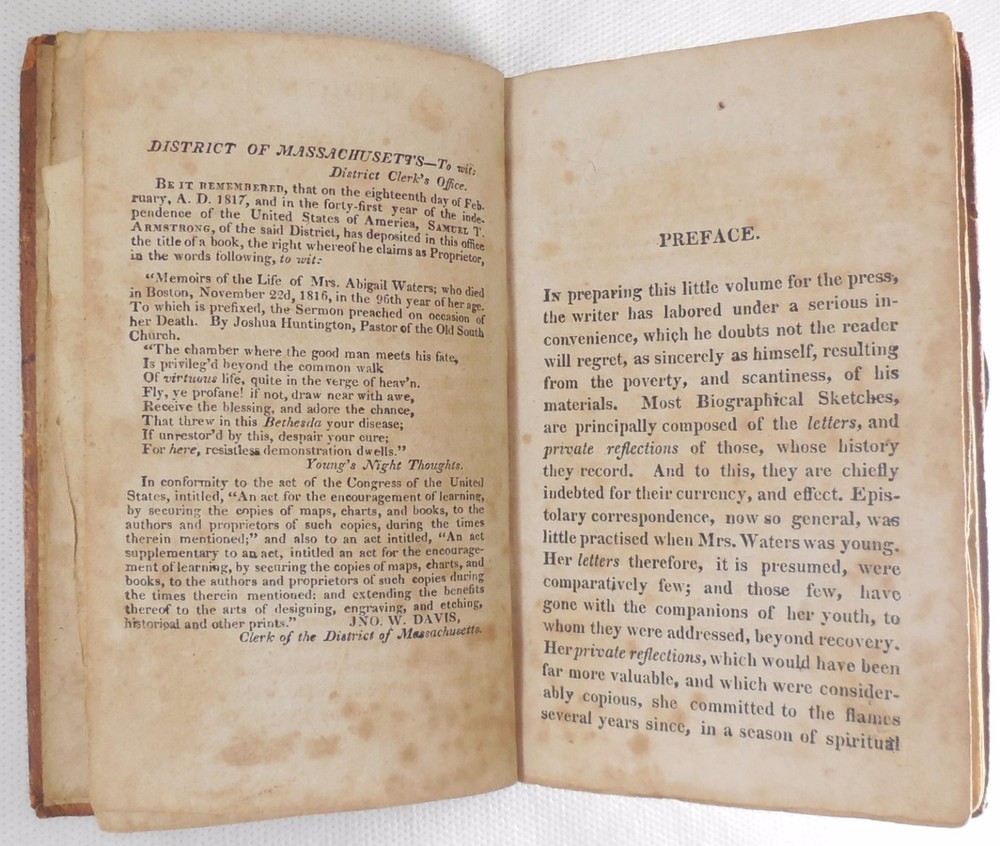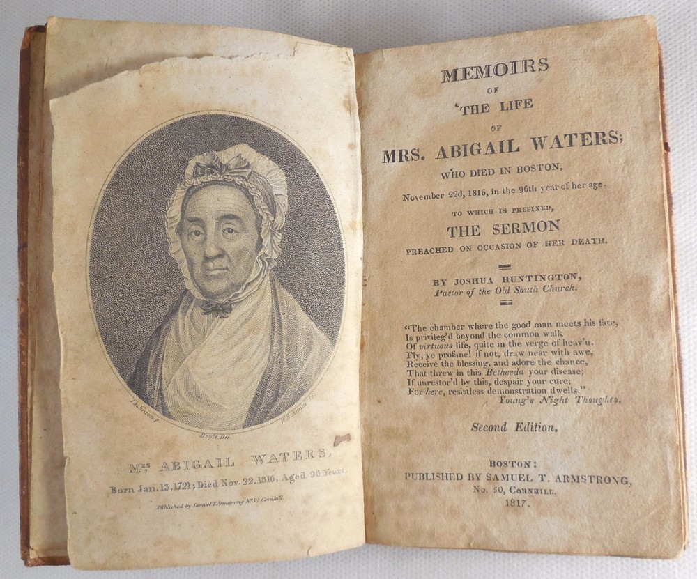 Memoirs of the Life of Mrs. Abigail Waters by Joshua Huntington Waters died in Boston on November 22, 1816 in the 96th year of her life. This sermon was given by Joshua Huntington, pastor of the Old South Church. Includes frontis of Waters with birth and death dates. 144 pages. 3.5" by 5.75". Ephemera: a handwritten note in brown aged ink. Second Edition published by Samuel T. Armstrong. Boston, MA. 1817. Hardback is overall in GOOD condition. Leatherbound covers are show commensurate wear and aging. Boards show dirt, scuffing, abrasions to the finish and more notable wear along the edges where leather is missing. Corners are bumped and worn with exposed boards. The front shoulder is cracked though intact along the front hinge. Spine has red title block with gilt lettering and border and shows six remaining gilt bands; leather to spine is cracked and flaking with portions of the ends missing, most notably to the tail where the textblock is partially exposed. Please see photos. Binding is secure. Front pastedown bears a pencil marks and numbers. Please see photos. Ffep bears writing in aged ink. Frontispiece is present though partially detached and shows foxing and age-toning with a tear running diagonally at the head margin. Ephemera is aged with no appreciable wear. Interior is lightly wrinkled with gentle age-toning and foxing. Pages exhibit typical age-warping and expected creases, with some bumped corners. Inside pages are free of writing and intentional marks. Text block edges are darkened, with a protruding signature along fore edge. Book may exhibit additional minor signs of age or wear. JS0170909 AS IS! Please see photos. More photos available upon request. International first class shipping includes a handling charge to cover insurance. Domestic orders over $250 include a handling charge to cover signature confirmation. #panoplybooks #rarebooks #bookboutique #collectiblebooks #antiquebooks #vintagebooks #bookstore