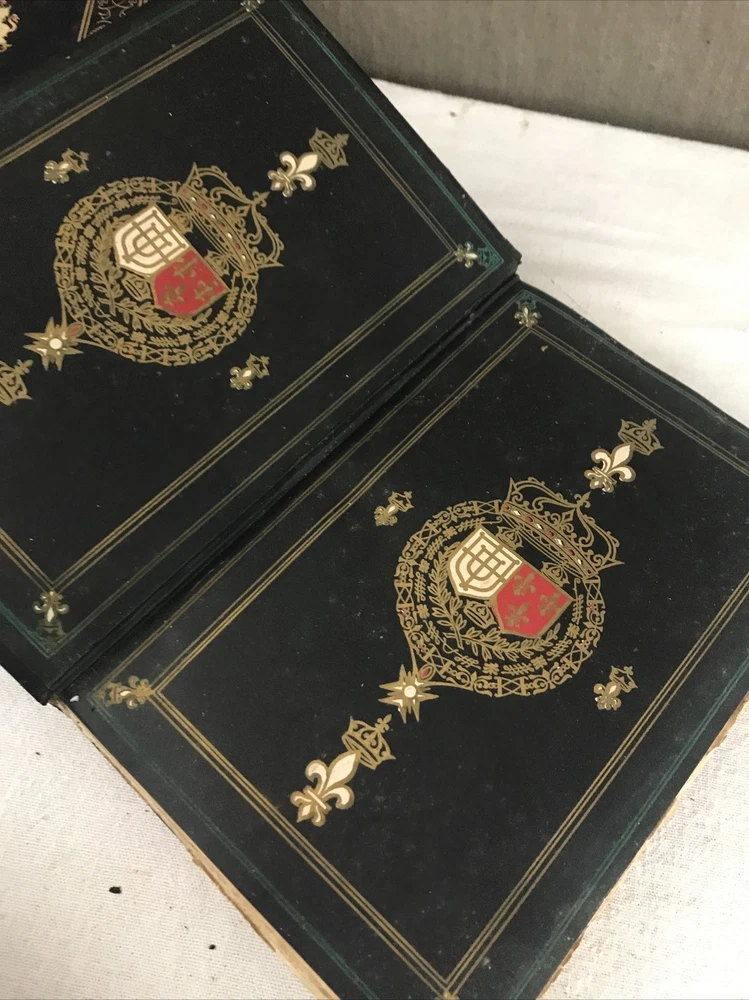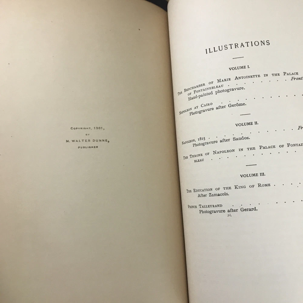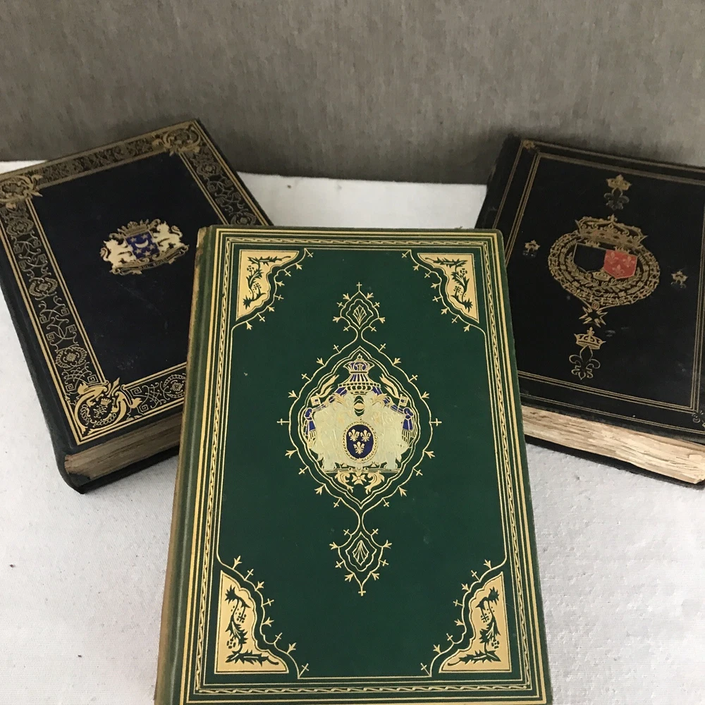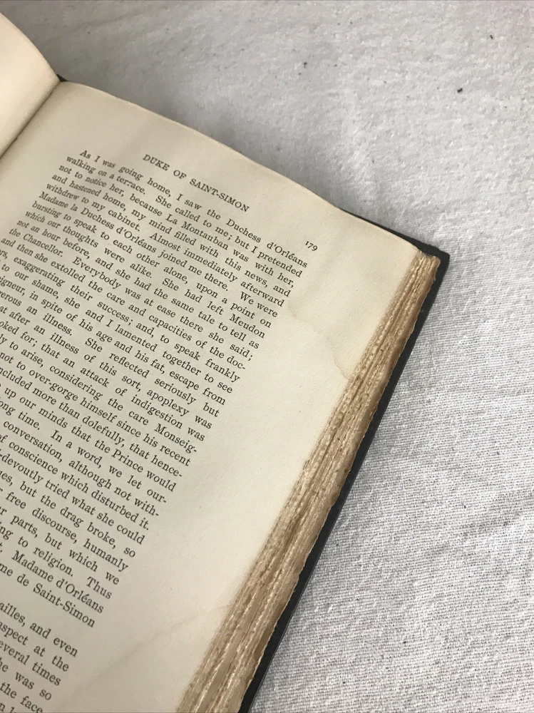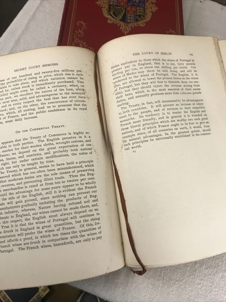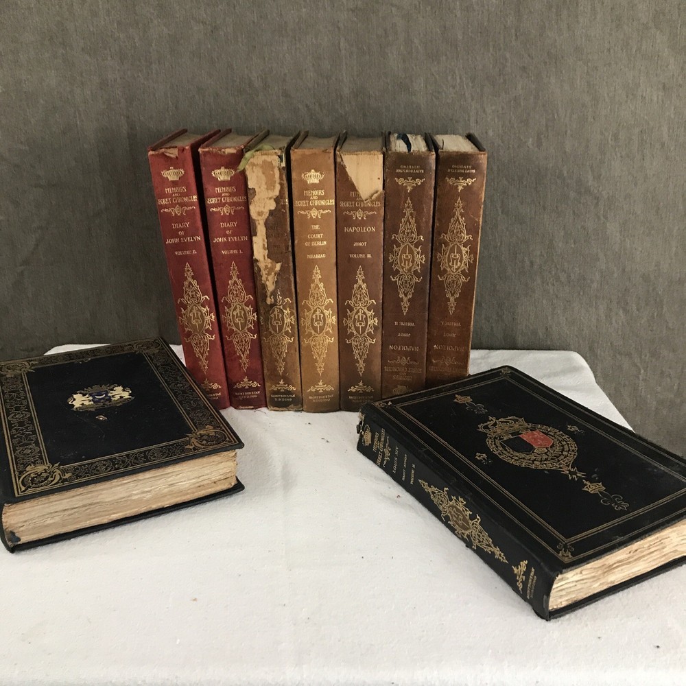 9 of the 10 books from the Memoirs and Secret Chronicles of the heads of Europe. Printed in 1901 and leather-bound. All books have some sunning and wear on the spine. Some have placeholder ribbons in them that are original to the book and delicate. I have tried to highlight the flaws with the photos and description, but I no doubt have missed the occasional spot etc as I did not go through page by page. Diary of John Evelyn Vol 1 and 2 The court of Berlin Madam Dubarry Louise XIV Vol 2 (This one has water damage. Most notable in light staining on the majority of pages and cover not laying flat. Still readable and intact. Marie Antoinette (This one has a fair bit of wear to the leather on the spine Napoleon Vol 1-3 If you have any questions or want pictures of something I didn't get an image of please let me know.