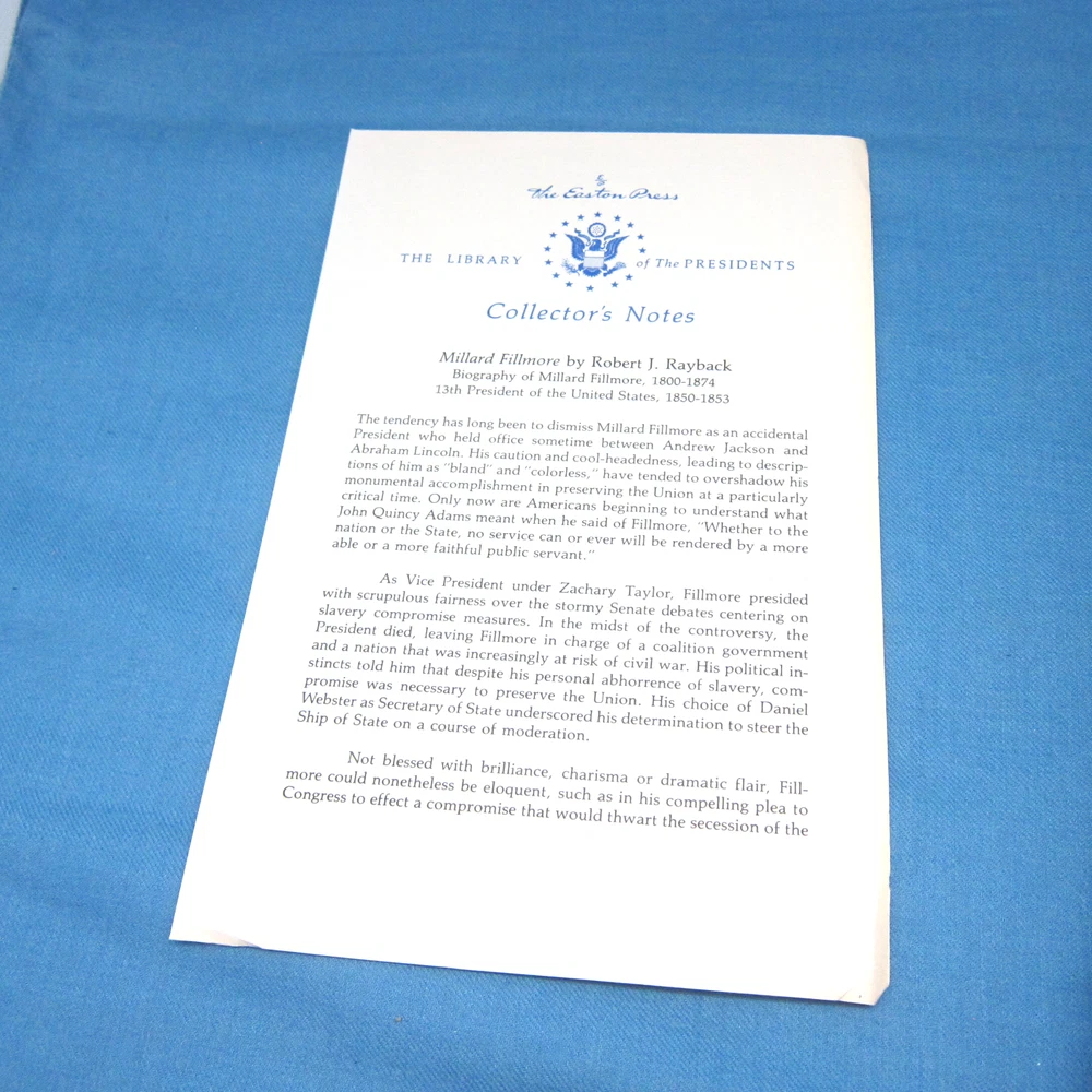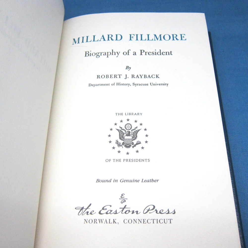 Millard Fillmore: Biography of a President, by Robert J. Rayback. Beautiful leather-bound edition from Easton Press Includes the Collector's Notes and an Easton Press bookplate. Very good condition, with minor scratches on the page edges. Leather binding and gilt decor are in mint condition. See photos.