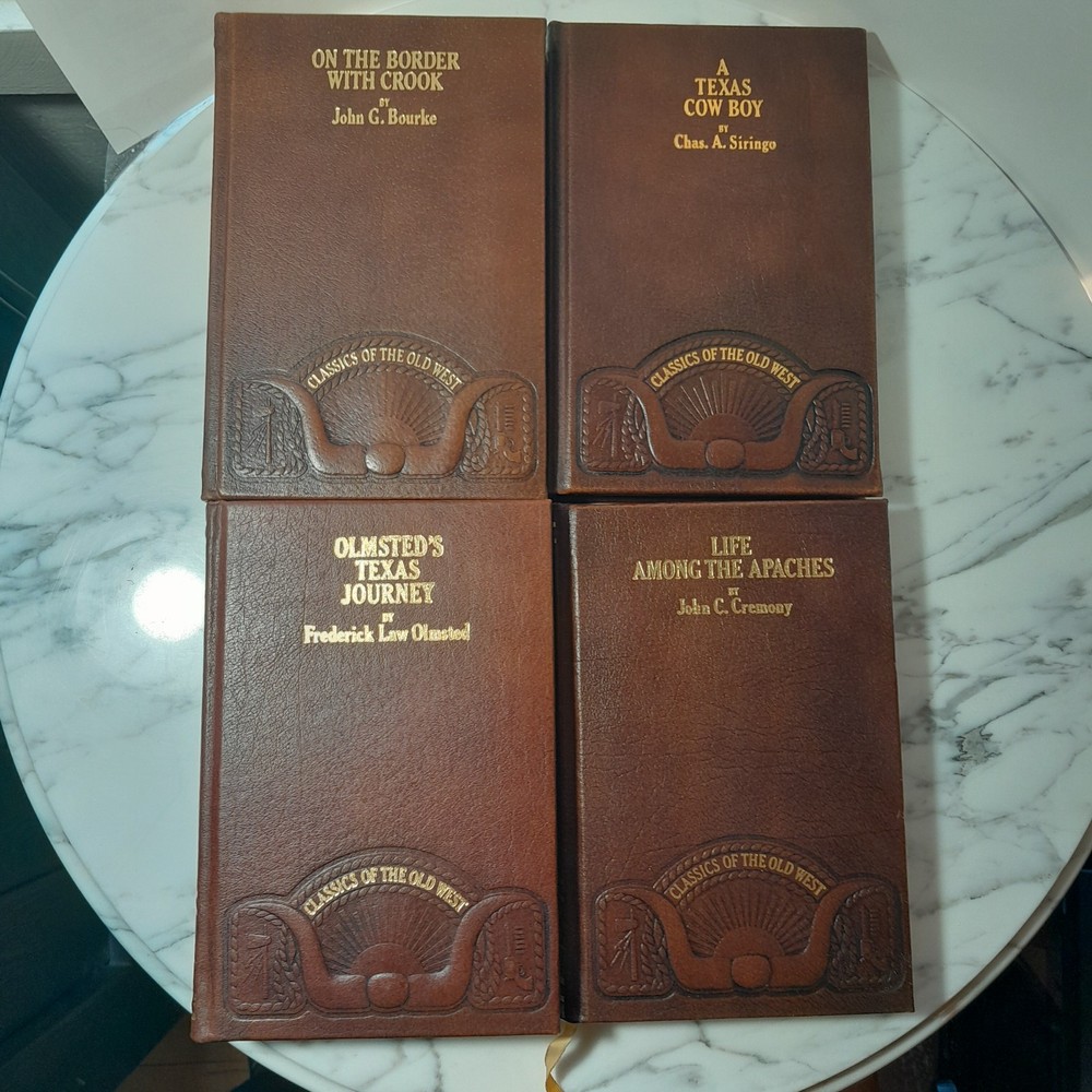 This is a luxury edition collection of four original books from the "Classics of Old West" series by TIME LIFE. The set includes works by authors John G. Bourke, Charles A. Siringo, Frederick Law Olmstead, and John C. Cremony, focusing on Western topics such as the Old West region of North America. The books are in English and were printed in 1980 in the United States.