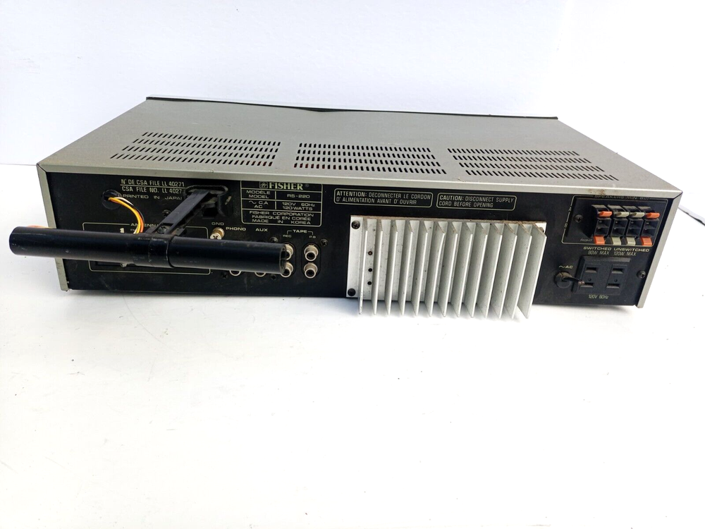 *** THIS GREAT DEAL INCLUDES & FEATURES: We Now Ship Worldwide!!! *** CHECK OUT MY OTHER ITEMS IN MY EBAY STORE!!! *** ( Buy it Now Before Someone Else Does!!!) - *MISSING CORD* FISHER RS-220 ANALOG AM FM STEREO RECEIVER EQUALIZER PHONO 120W ^ !!! (Great Deal!! !) *** THIS INCLUDES: WHAT IS SHOWN IN THE PICTURES!!! EXTREMELY IMPORTANT!!! THE POWER CORD HAS BEEN CUT & IS NOT INCLUDED!!! ONLY INCLUDES WHAT IS SHOWN IN PICTURES!!! NOTHING ELSE INCLUDED!!! THIS UNIT IS 100% DEFECTIVE & MIGHT NOT BE REPAIRABLE AT ALL, ONLY BUY THIS UNIT IF YOU ARE OK WITH THIS POSSIBILITY!!! AGAIN THIS UNIT IS DEFECTIVE & MIGHT HAVE MULTIPLE ISSUES!!! SOLD AS IS!!! *** ITEM IS WORTH MUCH MORE!!! *** *** ALSO RECEIVE EXTRA FREE GIVE AWAY GIFTS!!! *** === BUYER AGREES TO LOW SHIPPING & HANDLING PRICES OF ONLY: === * SHIPPING & HANDLING PRICE FOR CANADA & USA IS: 47.25 US$ * SHIPPING & HANDLING PRICE FOR WORLDWIDE COUNTRIES IS: 198.25 US$ PLEASE CHECK OUT MY OTHER ITEMS THEY ARE MOSTLY ALL ONE TIME SALES, UNIQUE & RARE , THANKS!!! ANY QUESTIONS JUST ASK ME, I ALWAYS RESPOND QUICK , HAVE FUN & THANK YOU FOR BUYING!!! *** ITEM IS IDENTICAL TO PICTURES ***
